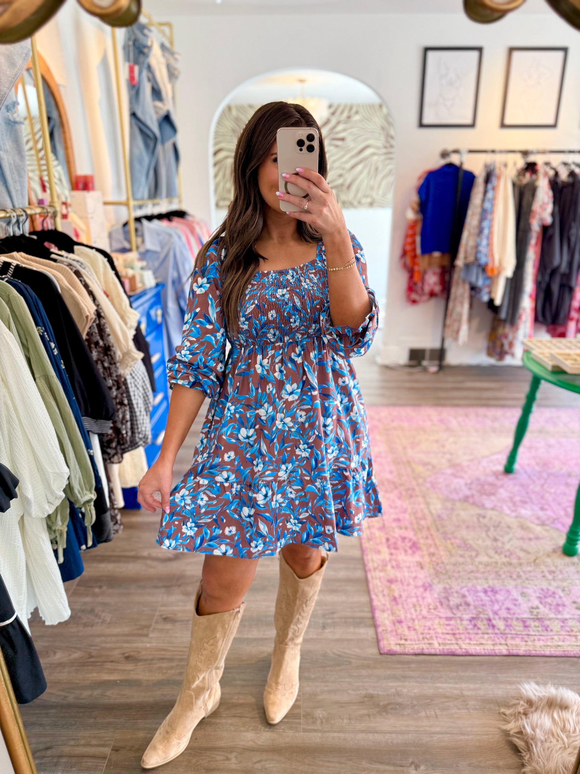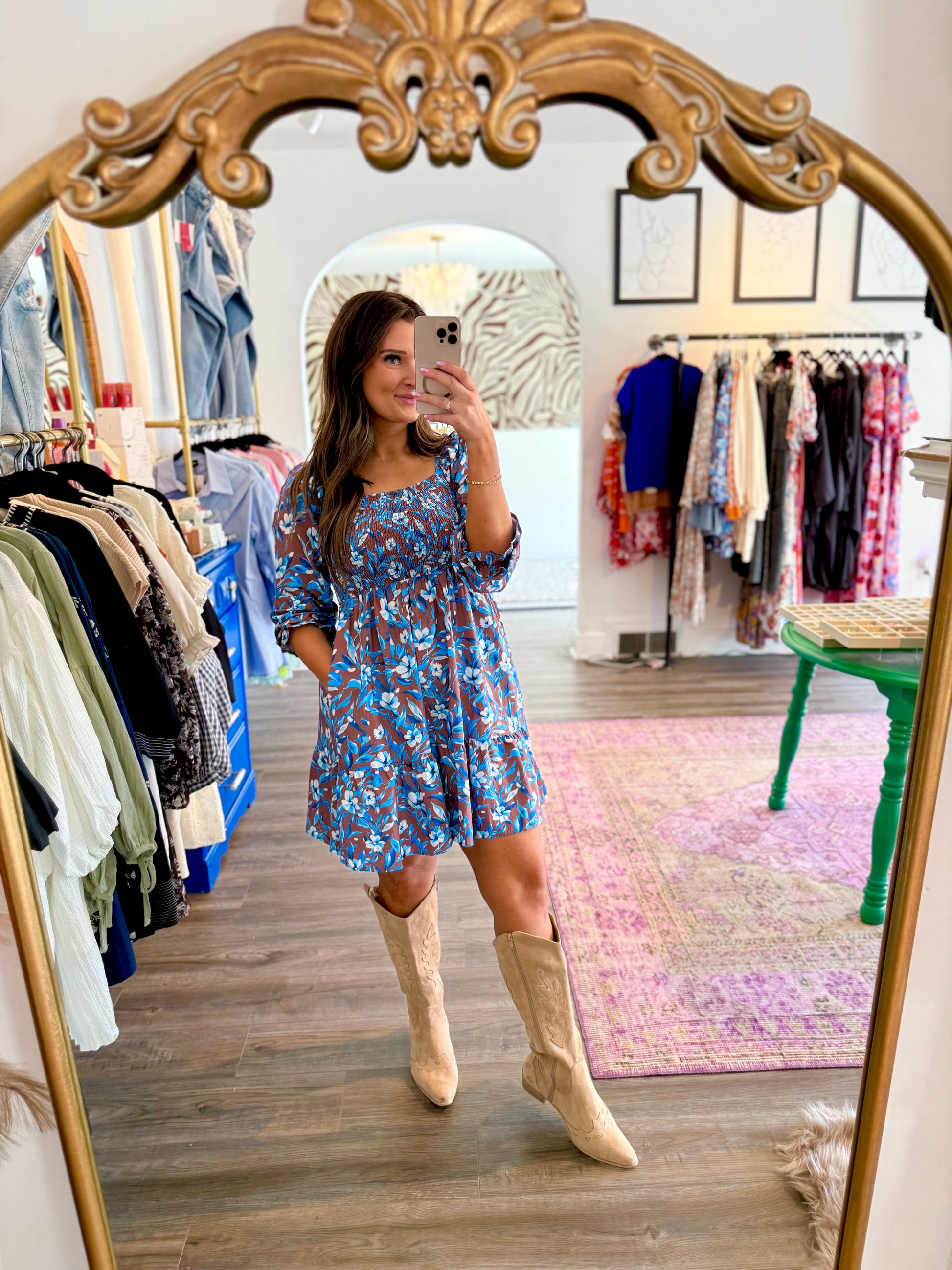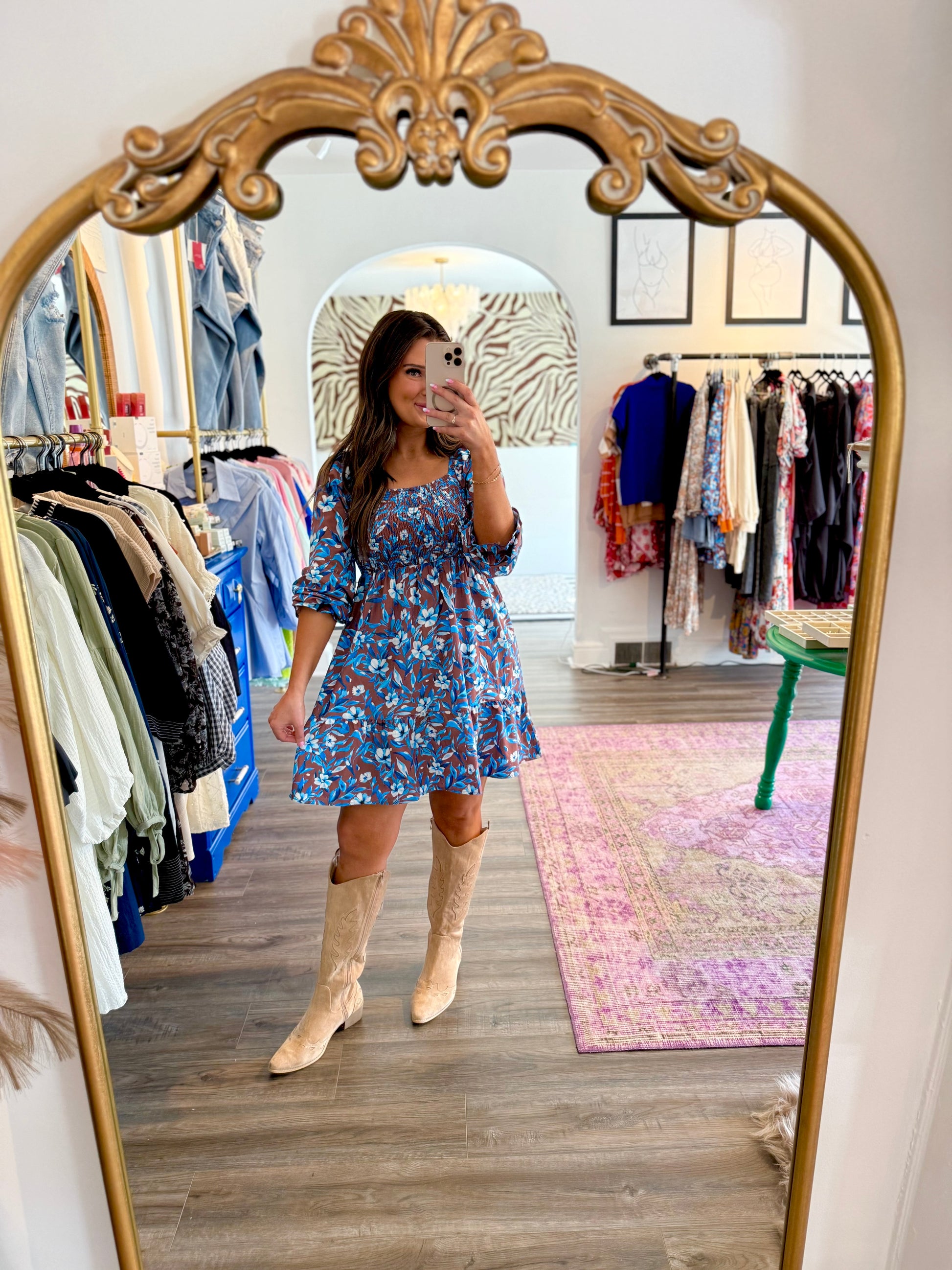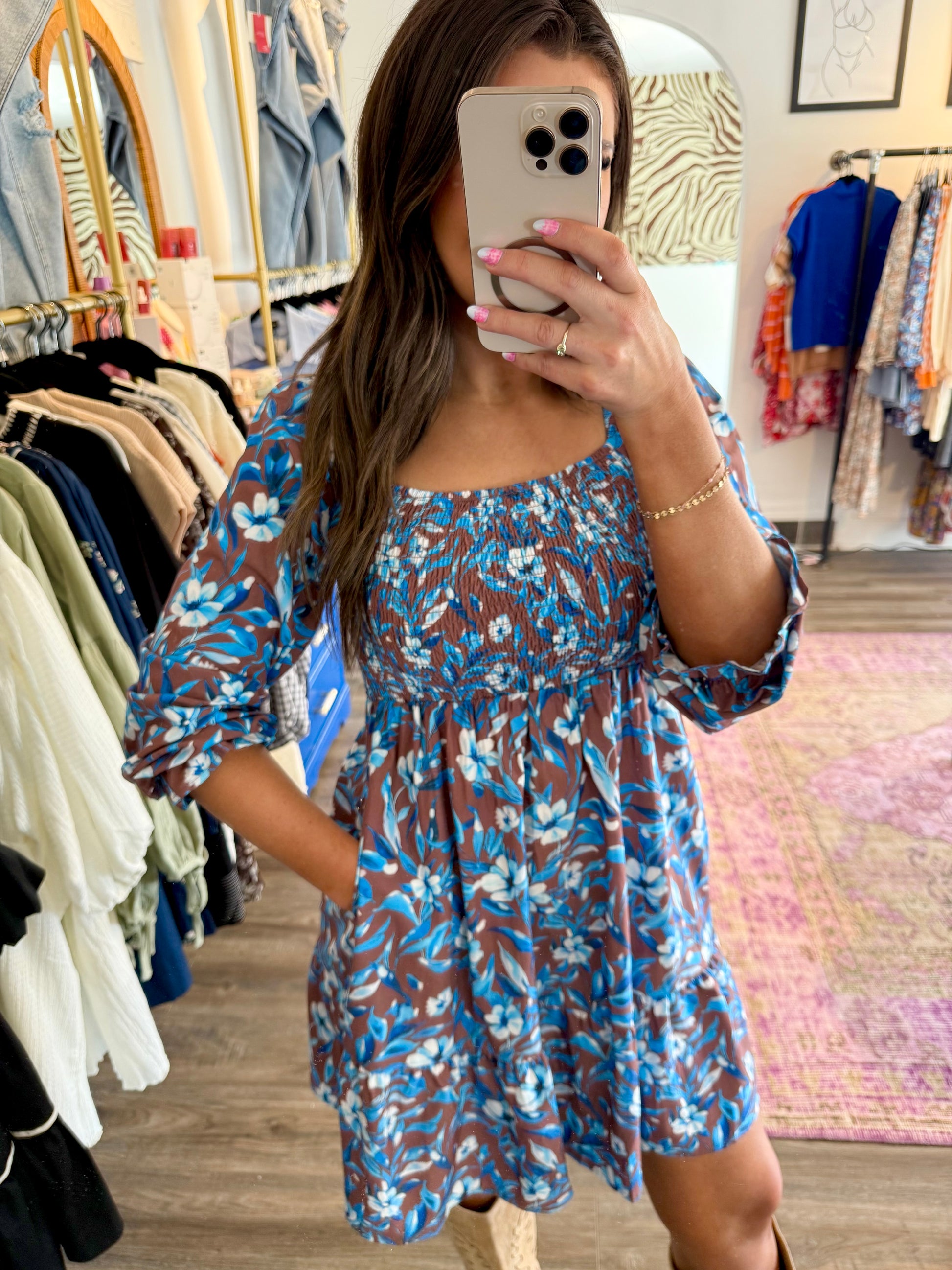 Step out in style with the Benny Blue Dress, a playful mini featuring a long sleeve design and a smocked bodice for a comfortable, flattering fit. Its gorgeous shade of blue and delicate floral detailing add a fresh pop of color, while the charming ruffle sleeves keep things fun and flirty. Perfect for weddings, special events, or a girls' night out, this dress brings brightness to your cooler-month wardrobe with effortless flair.