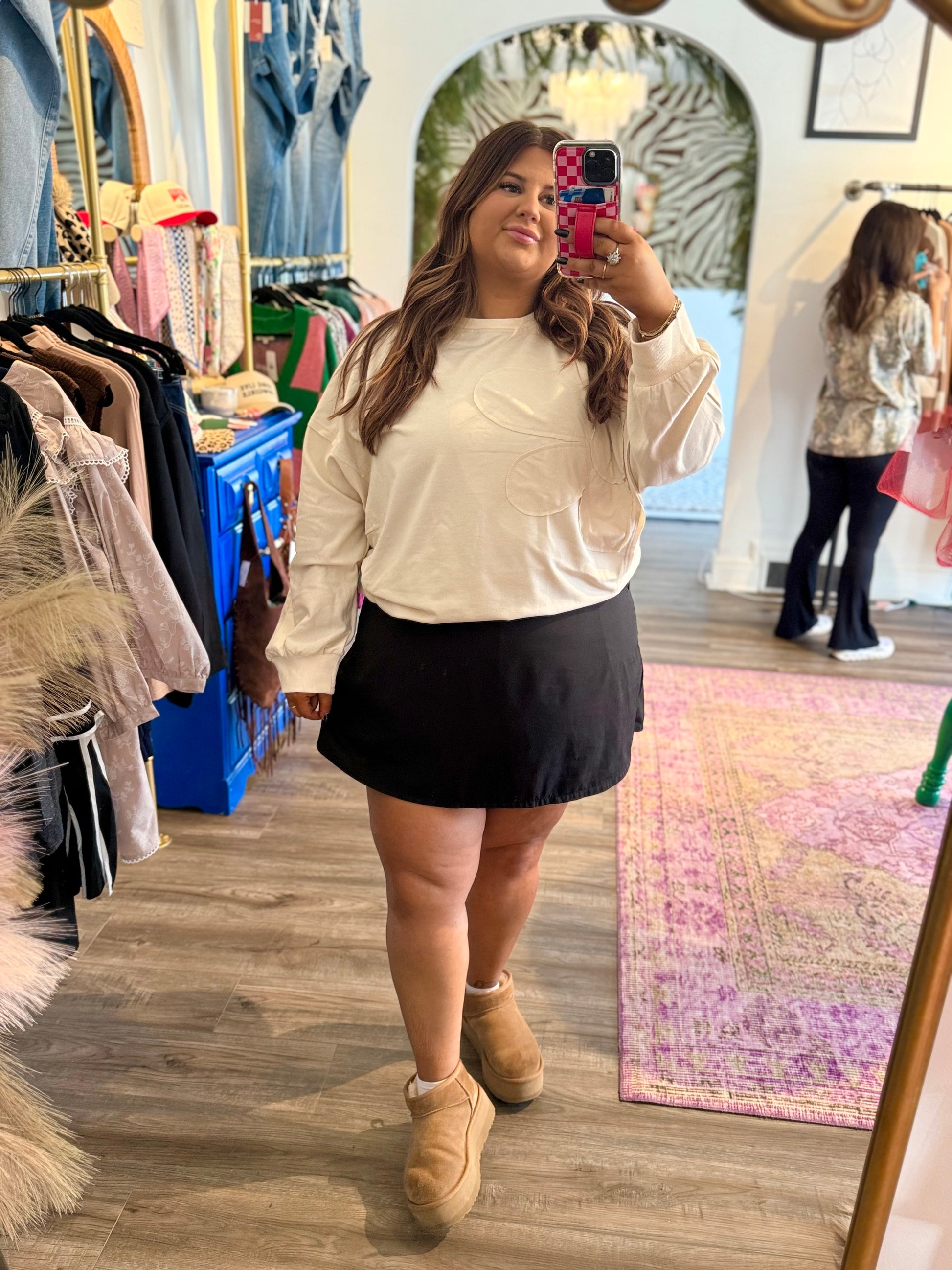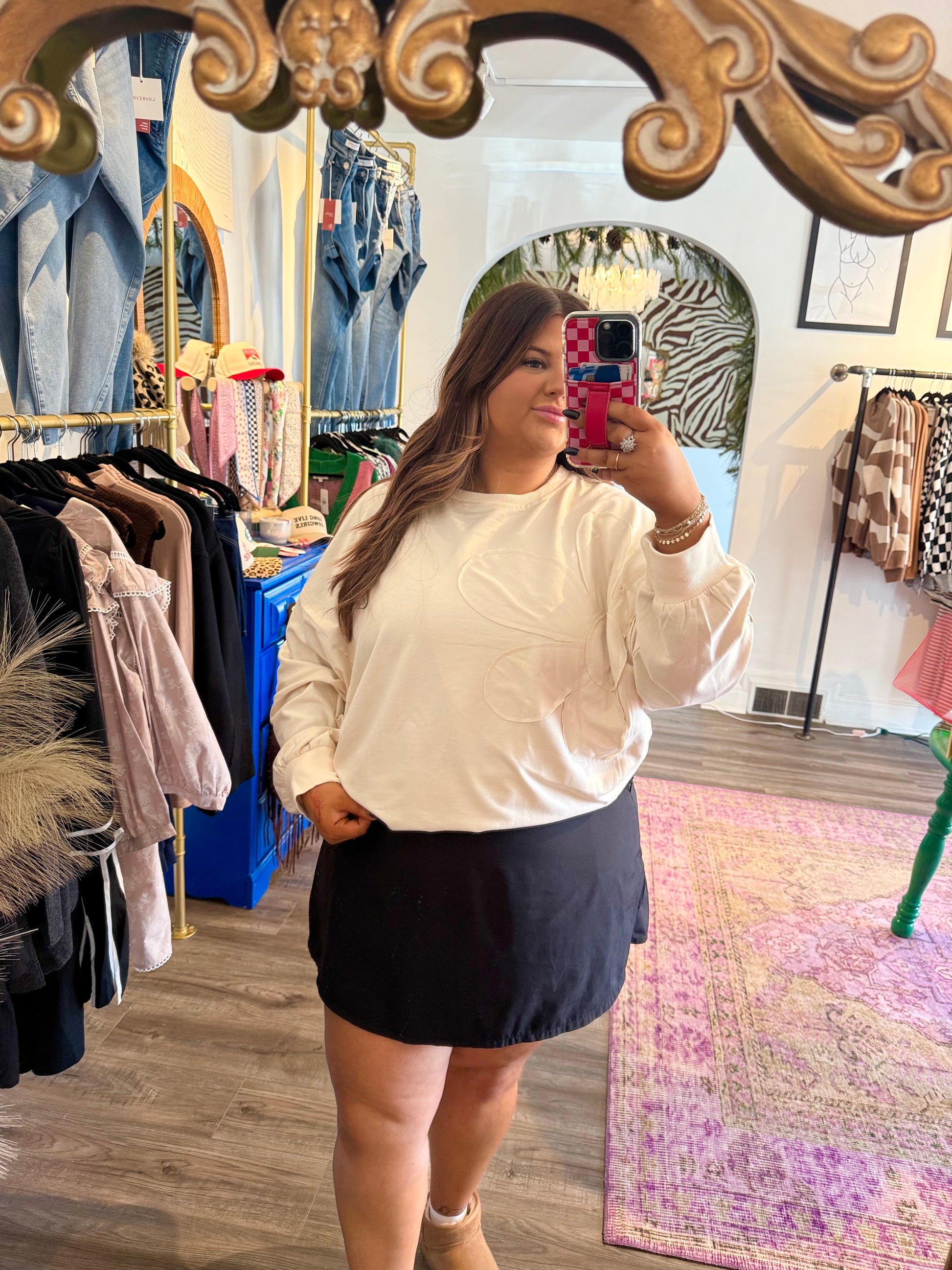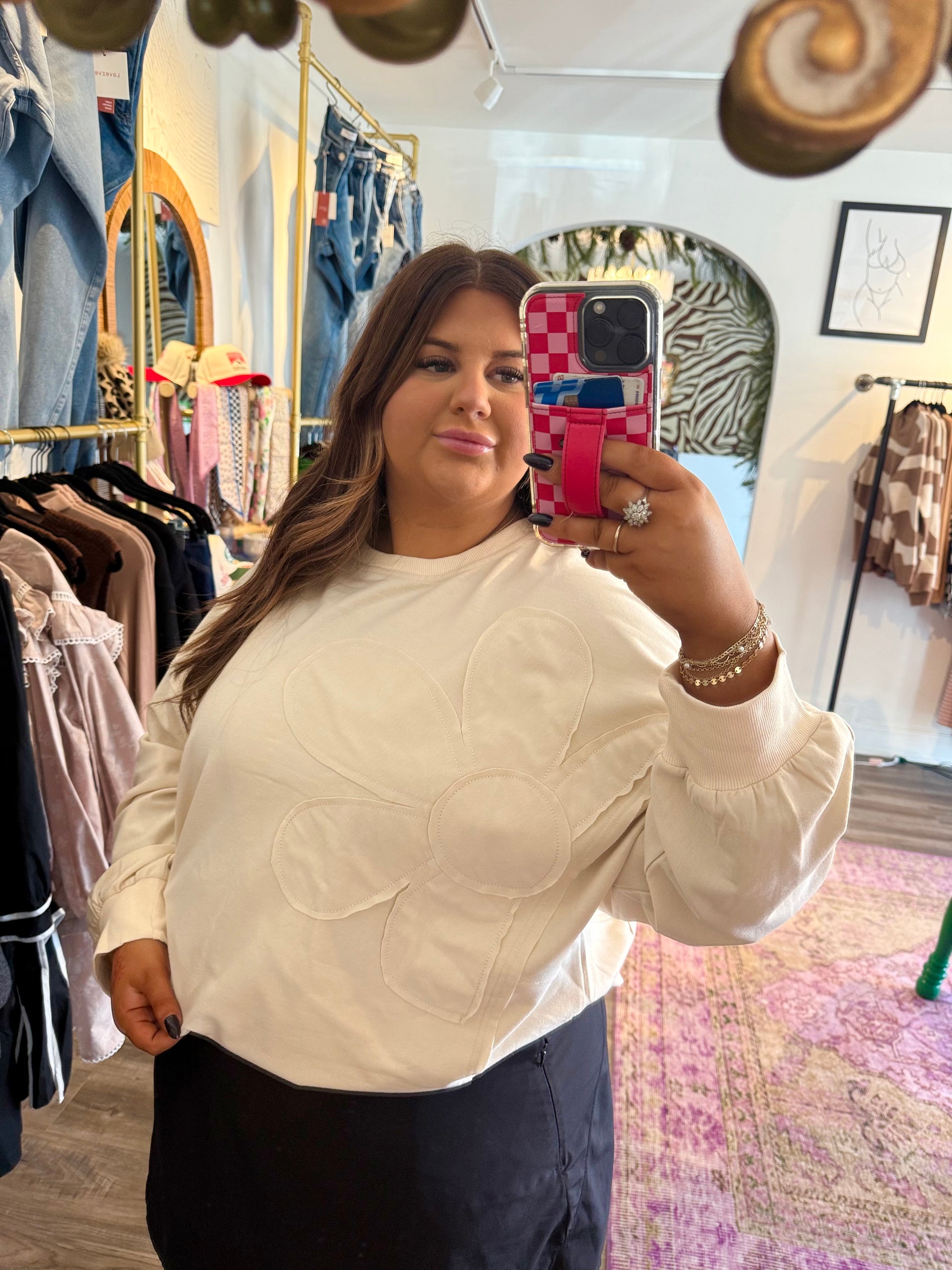 Slip into effortless style with this charming long-sleeve sweater that brings a touch of botanical flair to your everyday wardrobe. Featuring a striking oversized flower outline delicately stitched across the front, this cream-colored piece is as versatile as it is cozy. The soft, comfortable fabric makes it perfect for layering over your favorite tee or pairing with denim for a casual weekend vibe, or dress it up with leggings for an instantly polished look. Whether you're running errands or meeting friends for coffee, this sweater delivers that perfect balance of playful charm and wearable comfort that works with everything in your closet.