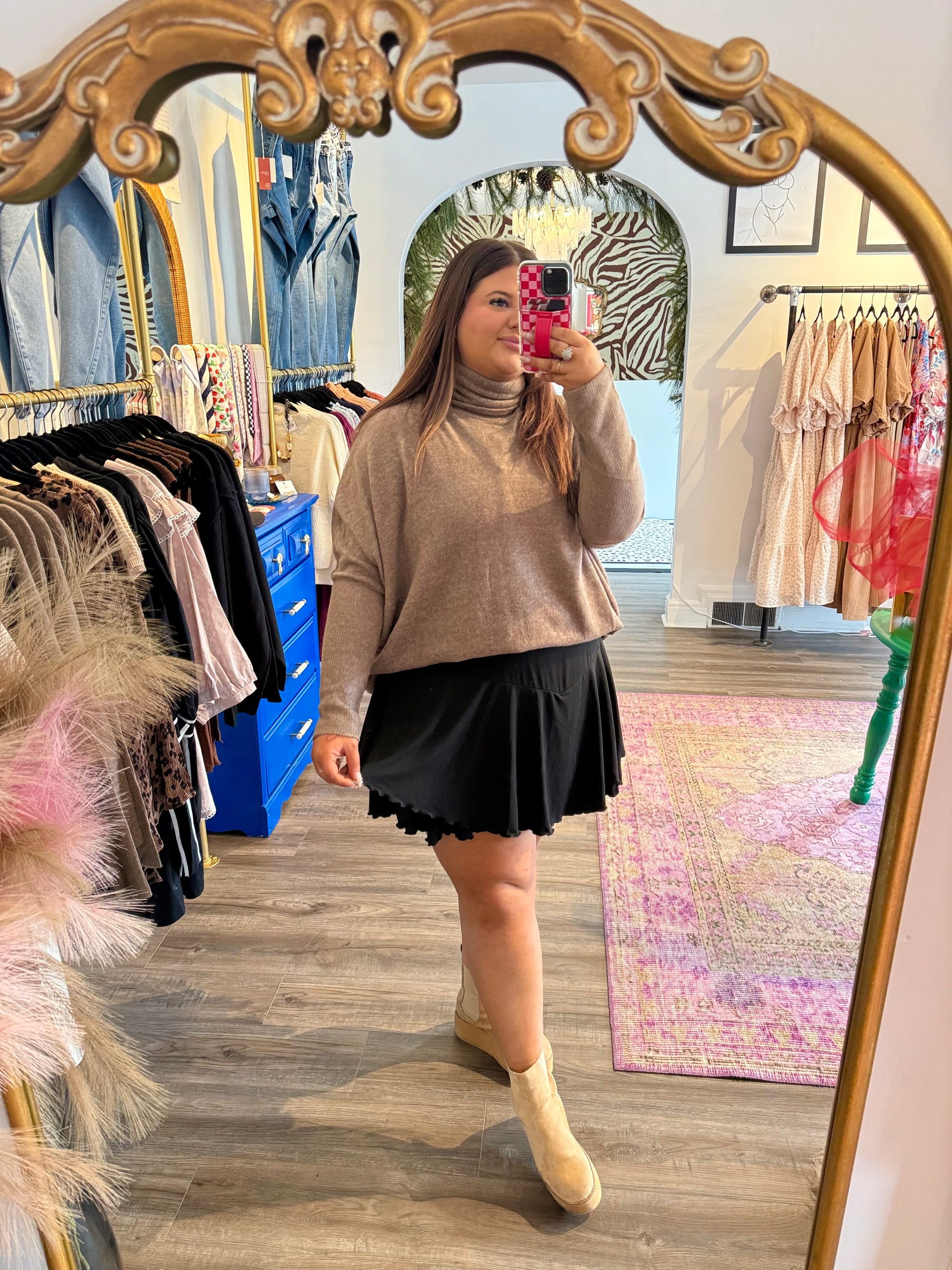 Wrap yourself in cozy elegance with our Caramel Swirl Sweater—an oversized turtleneck that's as comfortable as it is chic. The rich brown hue pairs beautifully with leggings, denim, or anything in between, while flattering side slits add movement and style. Whether you're dressing it up for a night out or keeping it casual at home, this versatile piece transitions seamlessly through your wardrobe. Quality craftsmanship at a price that won't break the bank—your new favorite sweater awaits.