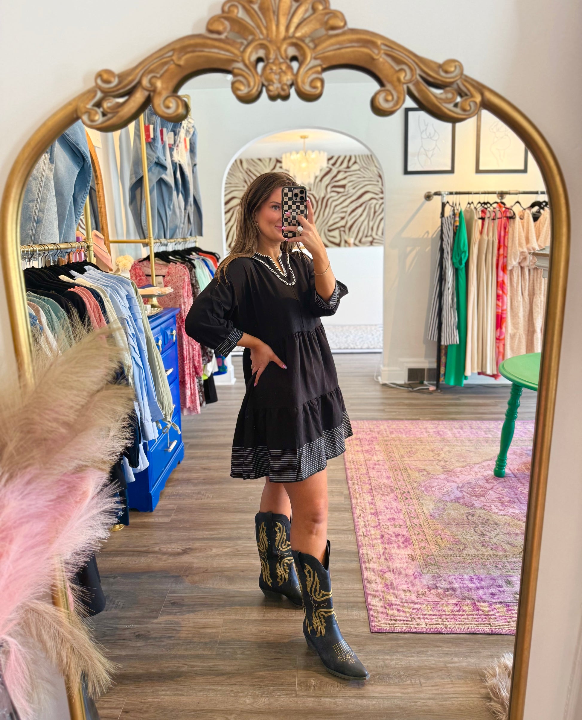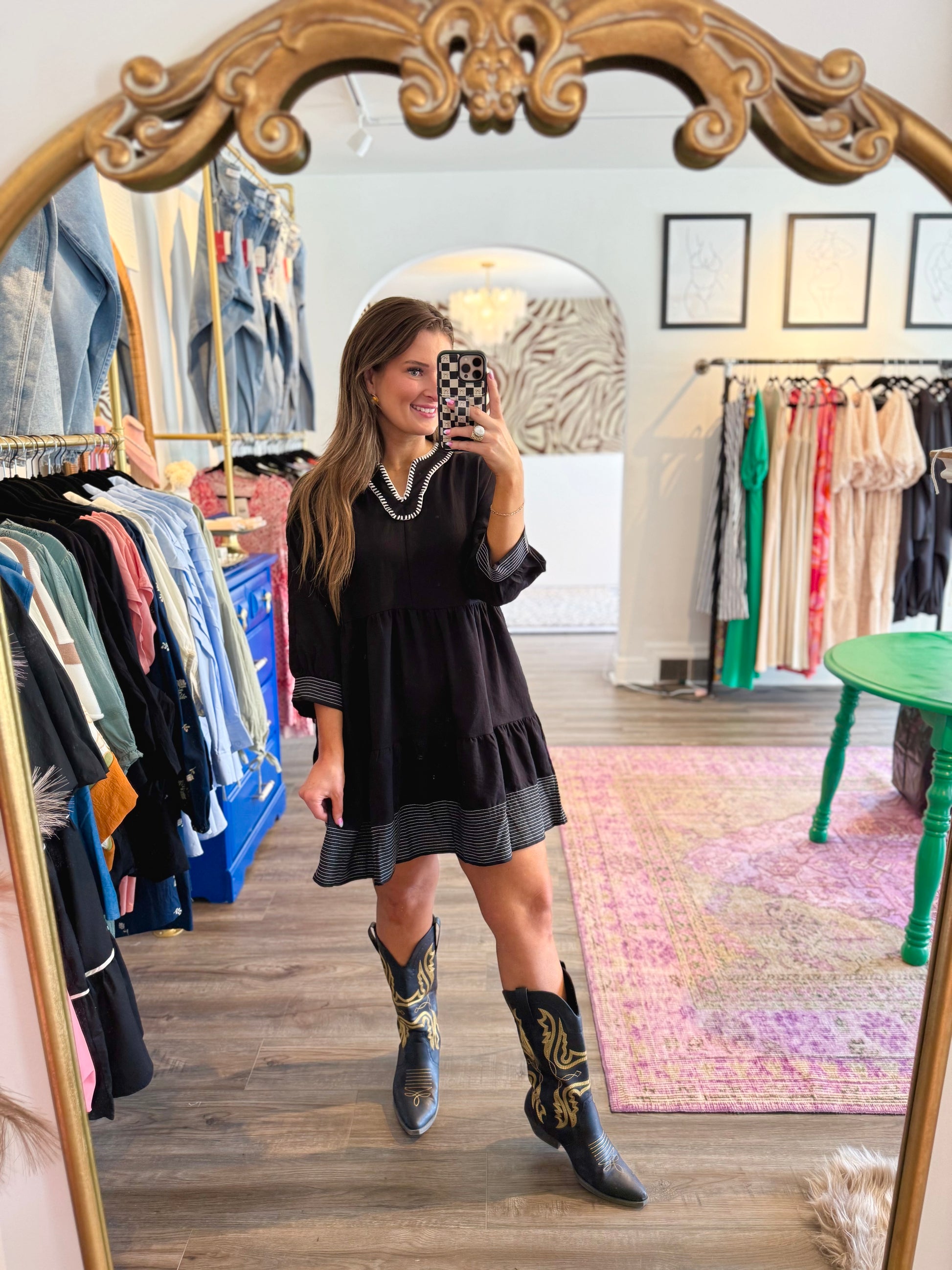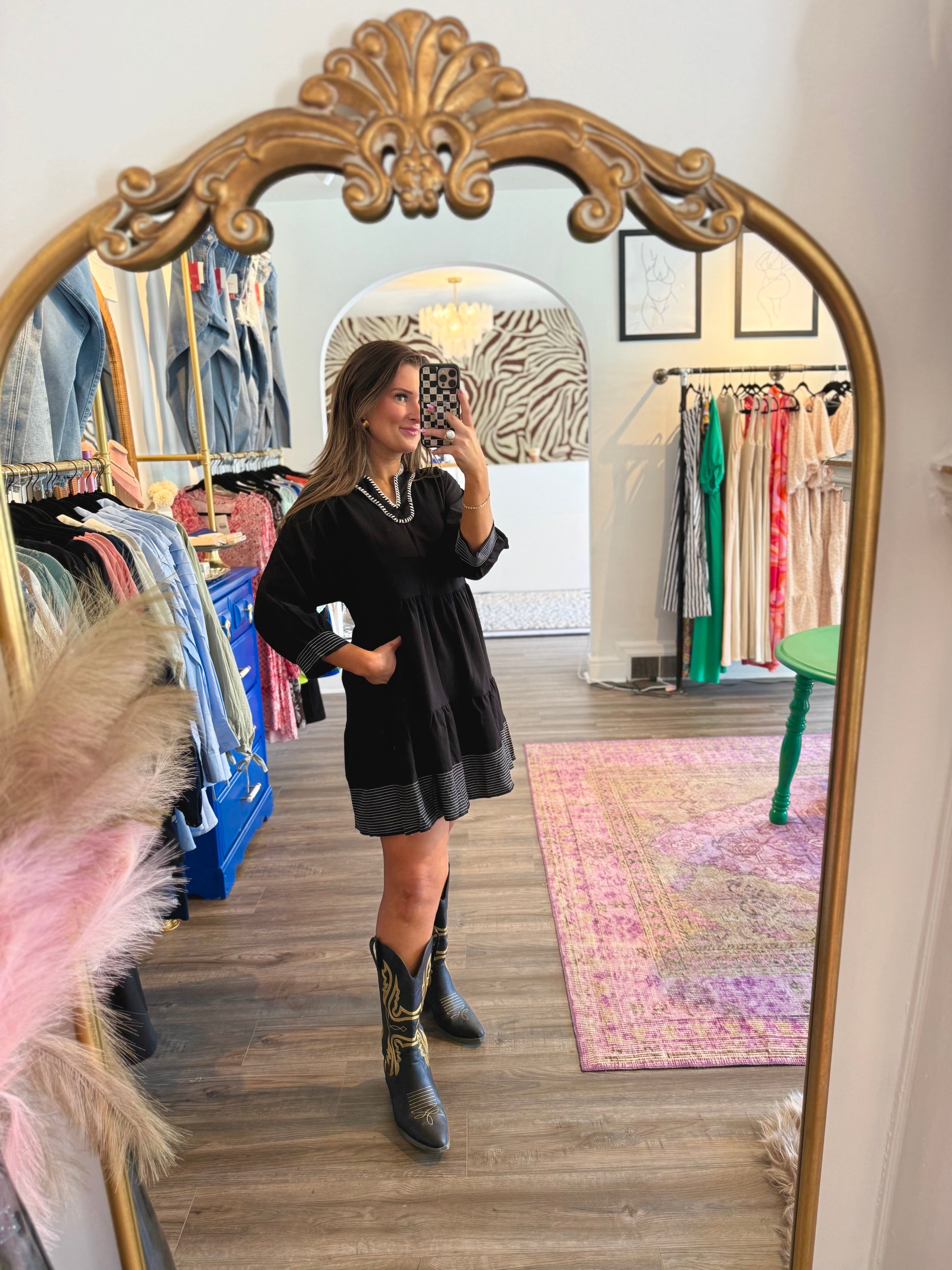 Step into fall fun with the Chavis Dress — a playful babydoll mini featuring quarter-length sleeves and charming stitched detailing. Its black contrast design makes it the perfect pick for game day or any seasonal adventure. Pair it effortlessly with boots to bring bold style and cozy vibes together with ease.