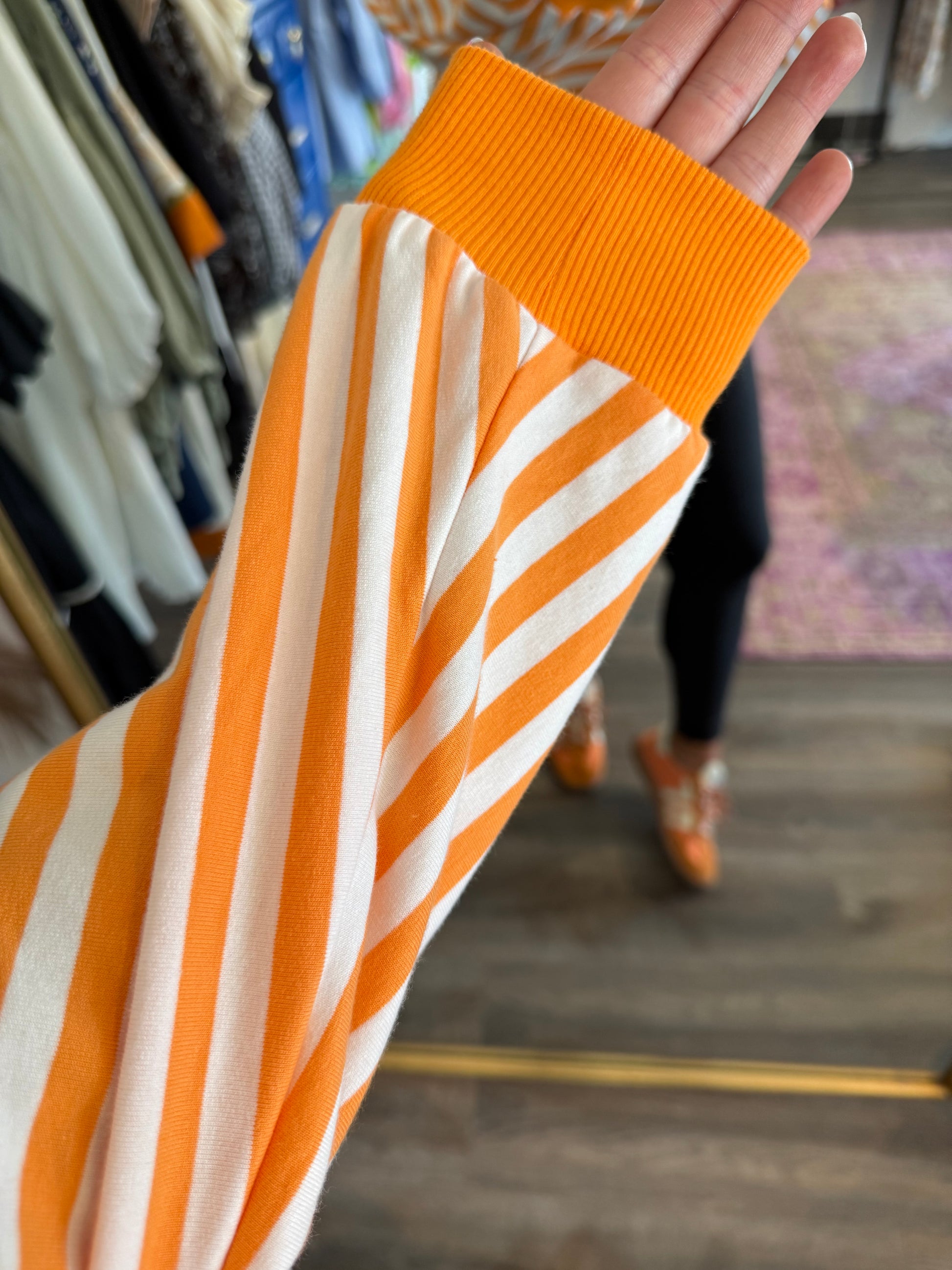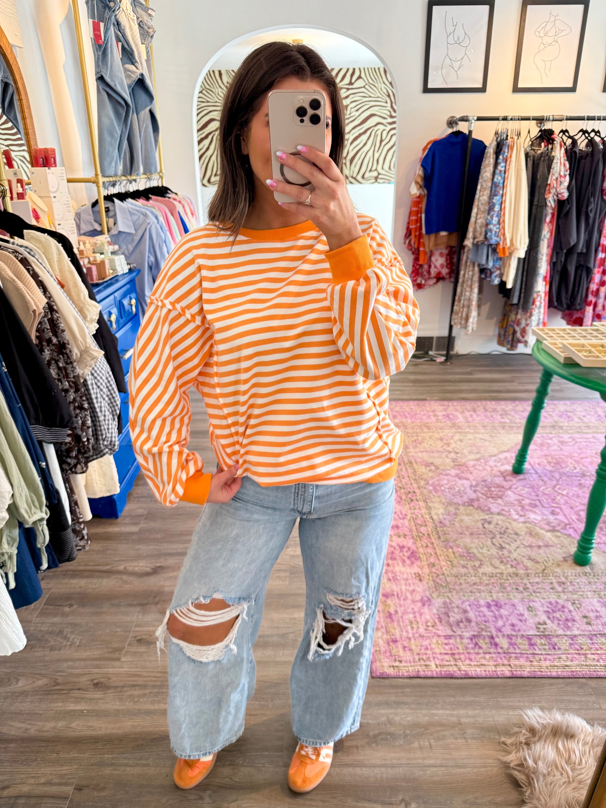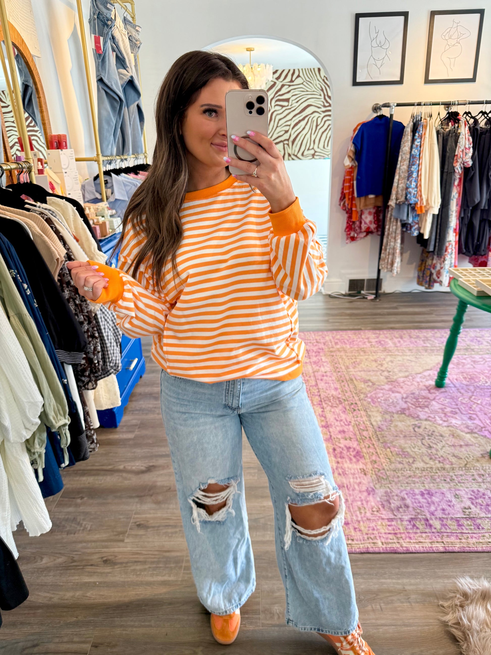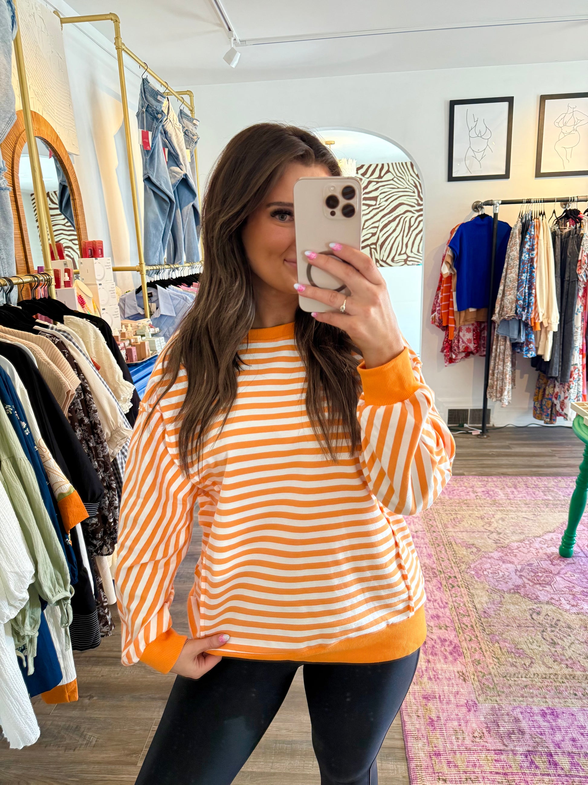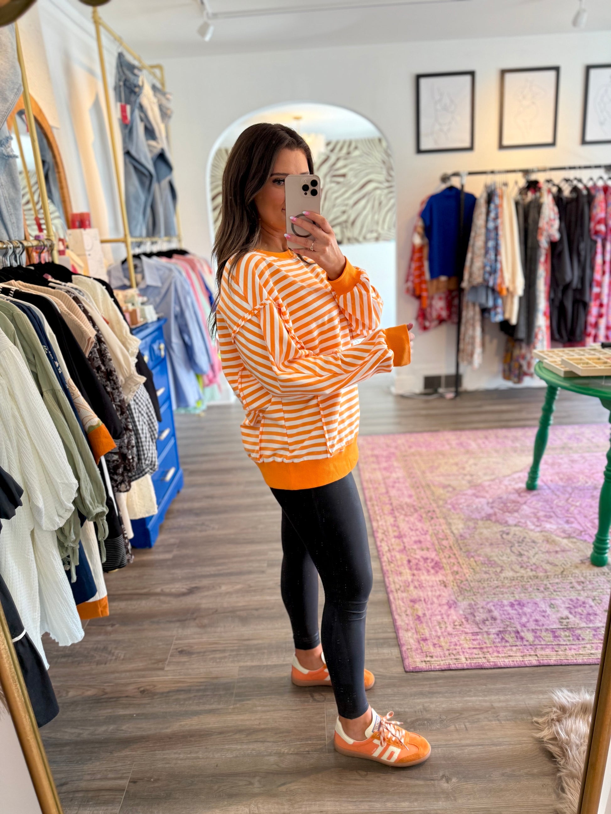 Stay cozy and spirited with the Cub Pullover, featuring vibrant orange and white stripes that pop. Its lightweight fabric makes it perfect for those chillier nights, while the relaxed drop shoulder and exposed seams add a casual, laid-back vibe. Ideal for game day if these are your colors, this pullover keeps you comfortable and stylish as you cheer on your team.