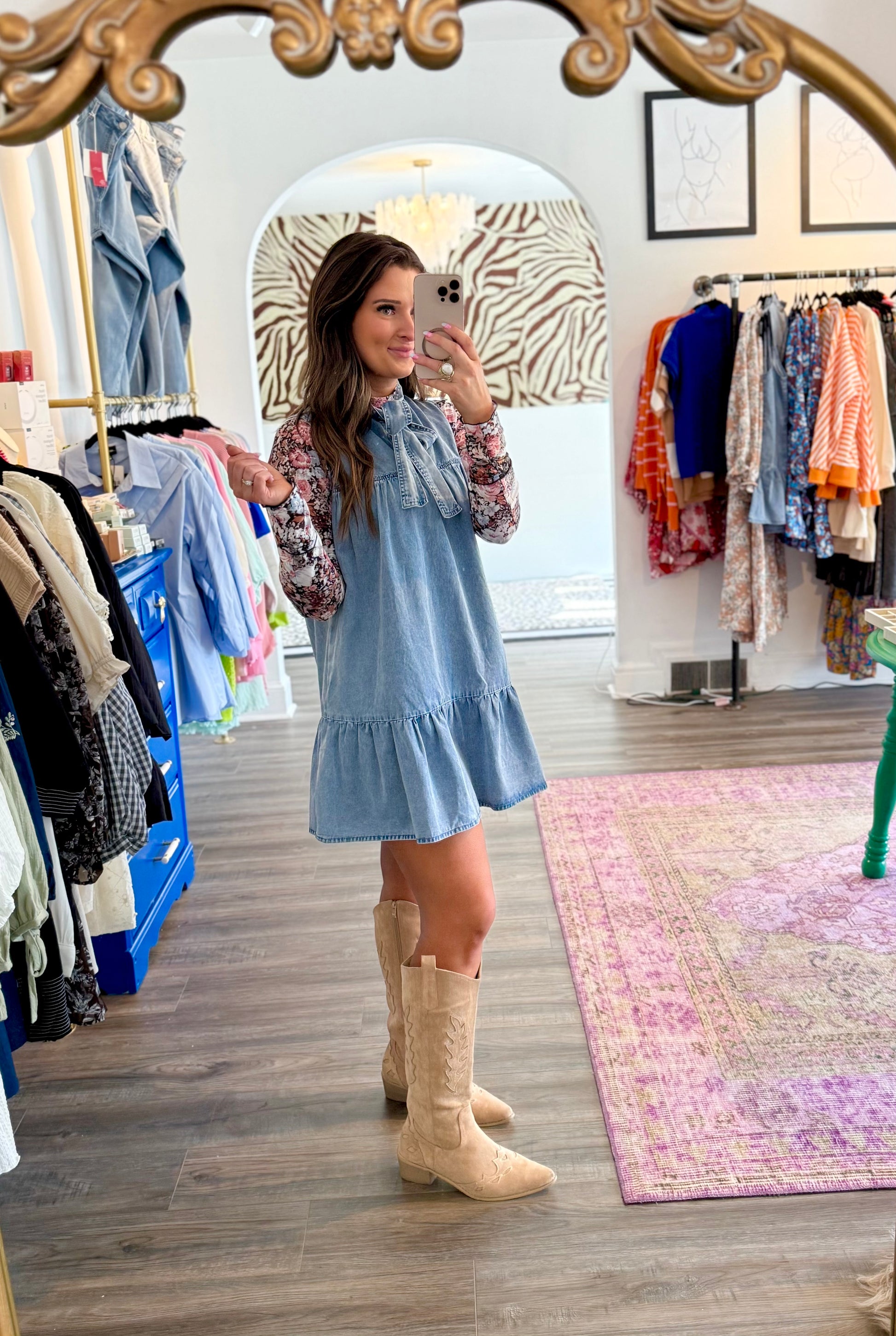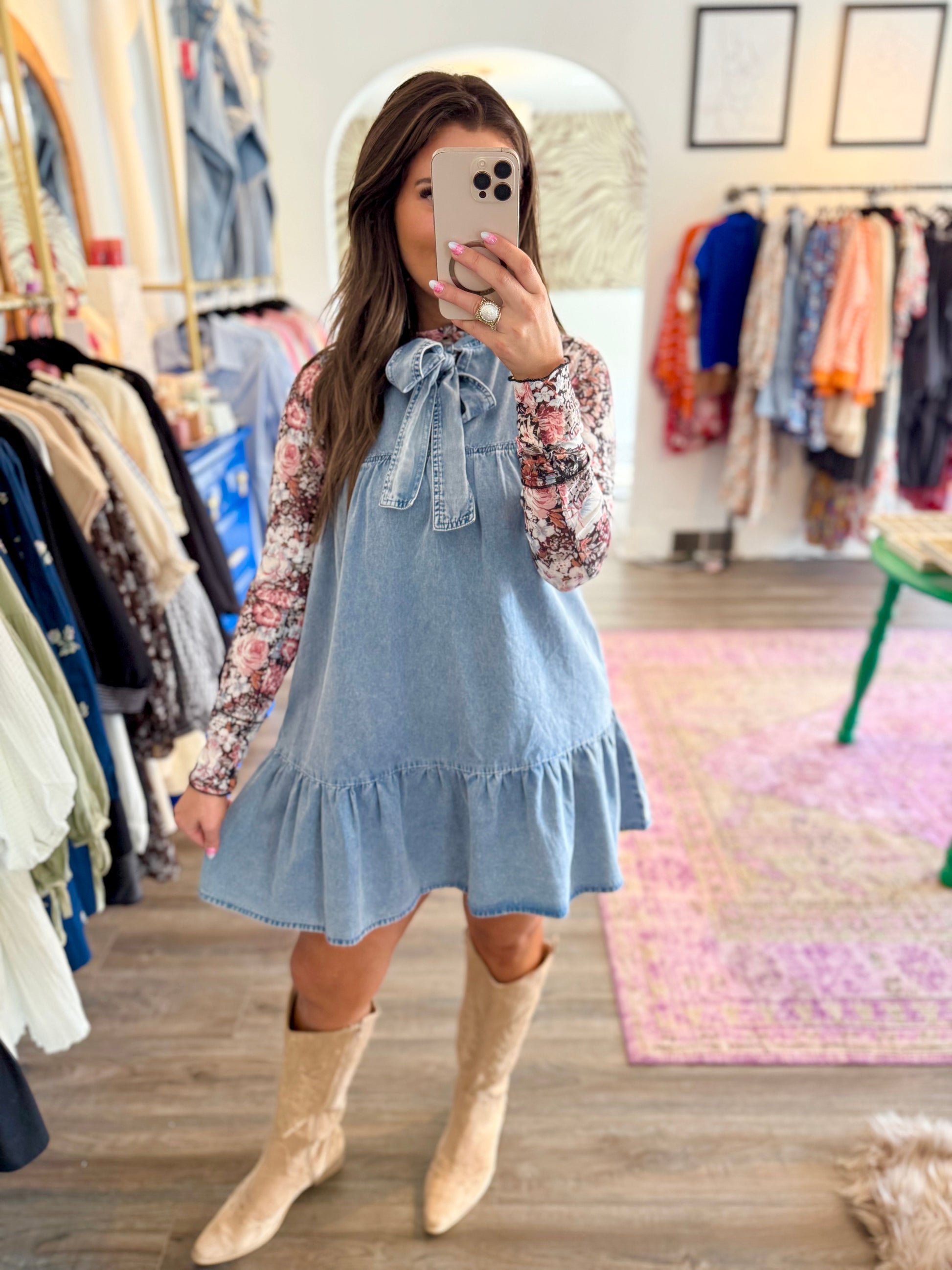 This playful ruffled chambray dress is your new go-to for every season. The sleeveless design features a charming bowknot neck and a cute tie detail in the back, adding a flirty touch to your look. Pair it with a lace undershirt for easy layering and cozy vibes on chilly days. Denim has never looked so versatile and trendy!