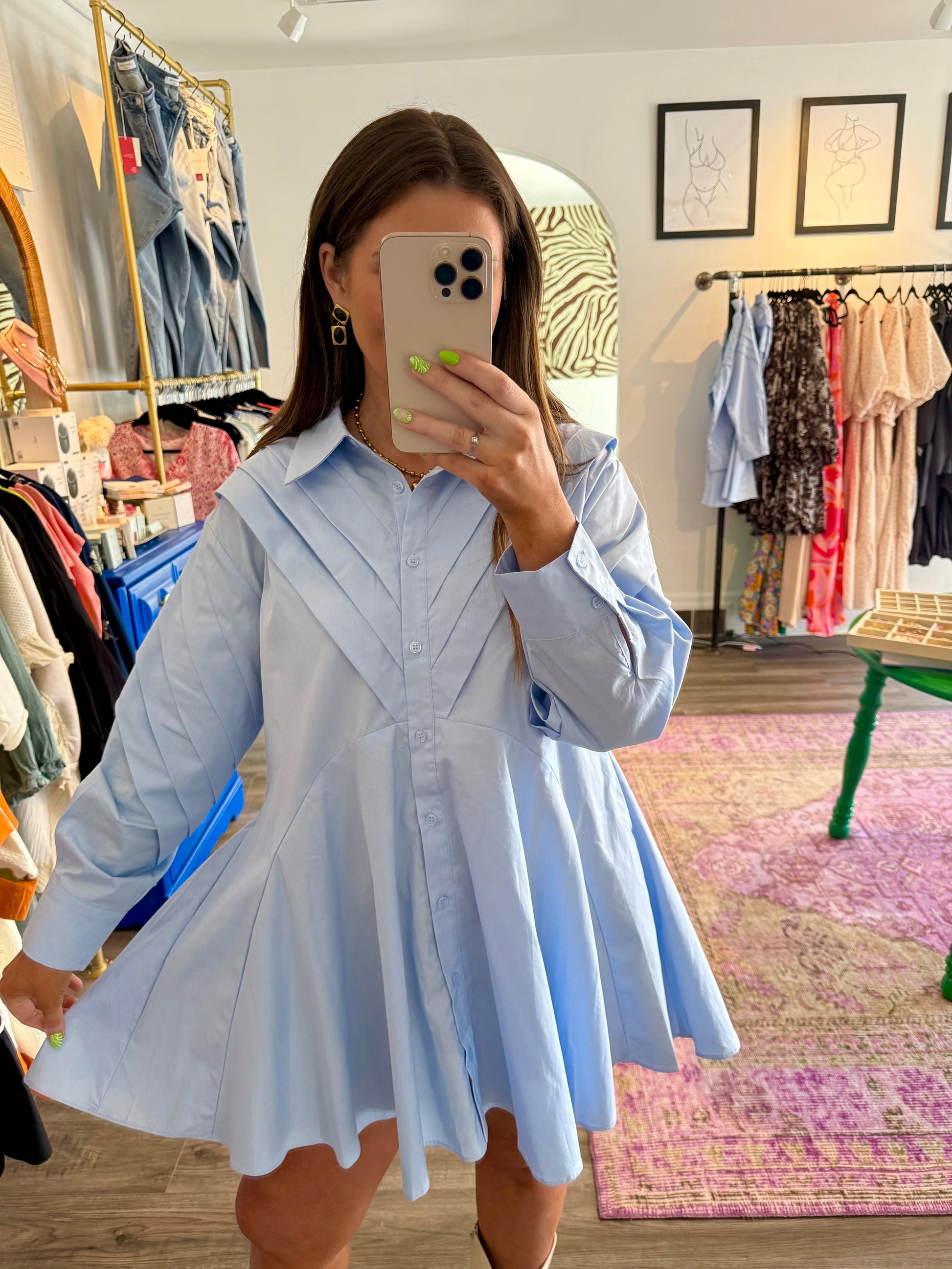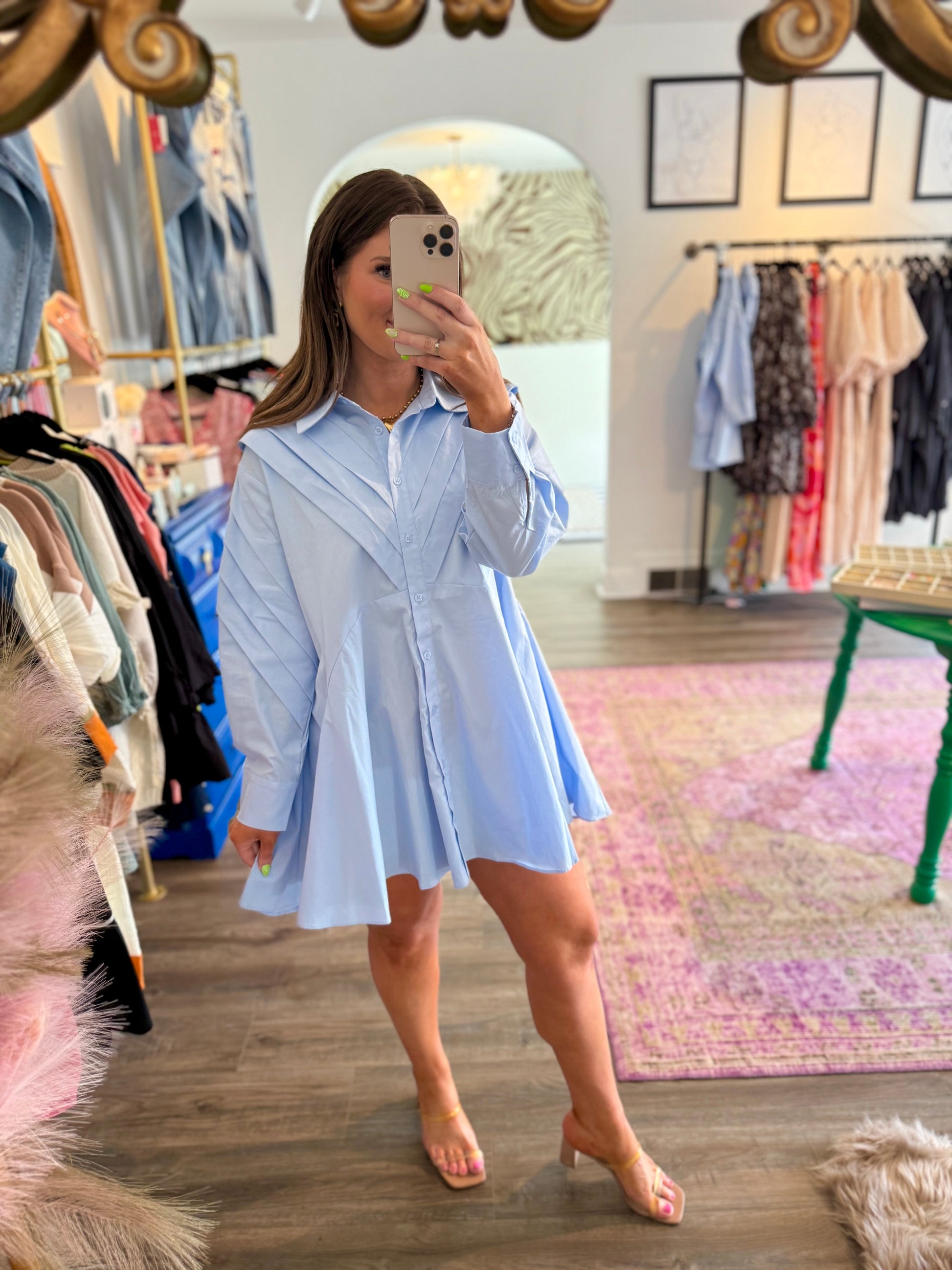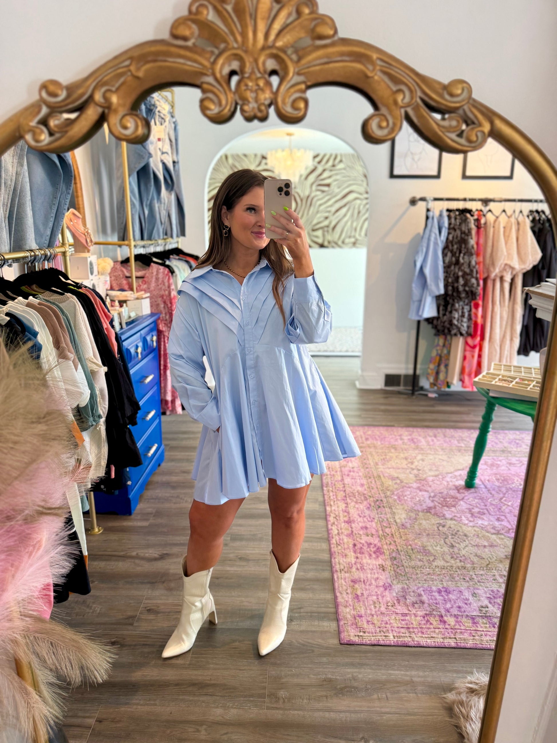 The Evie Dress redefines classic style with its contemporary oversized silhouette and relaxed fit. This playful blue button-down dress features a pointed collar that adds just the right amount of sophistication. Perfect for fall outings, bridal events, or game days, its long sleeves bring cozy charm while keeping things effortlessly chic. Embrace comfort and style with this versatile wardrobe staple!