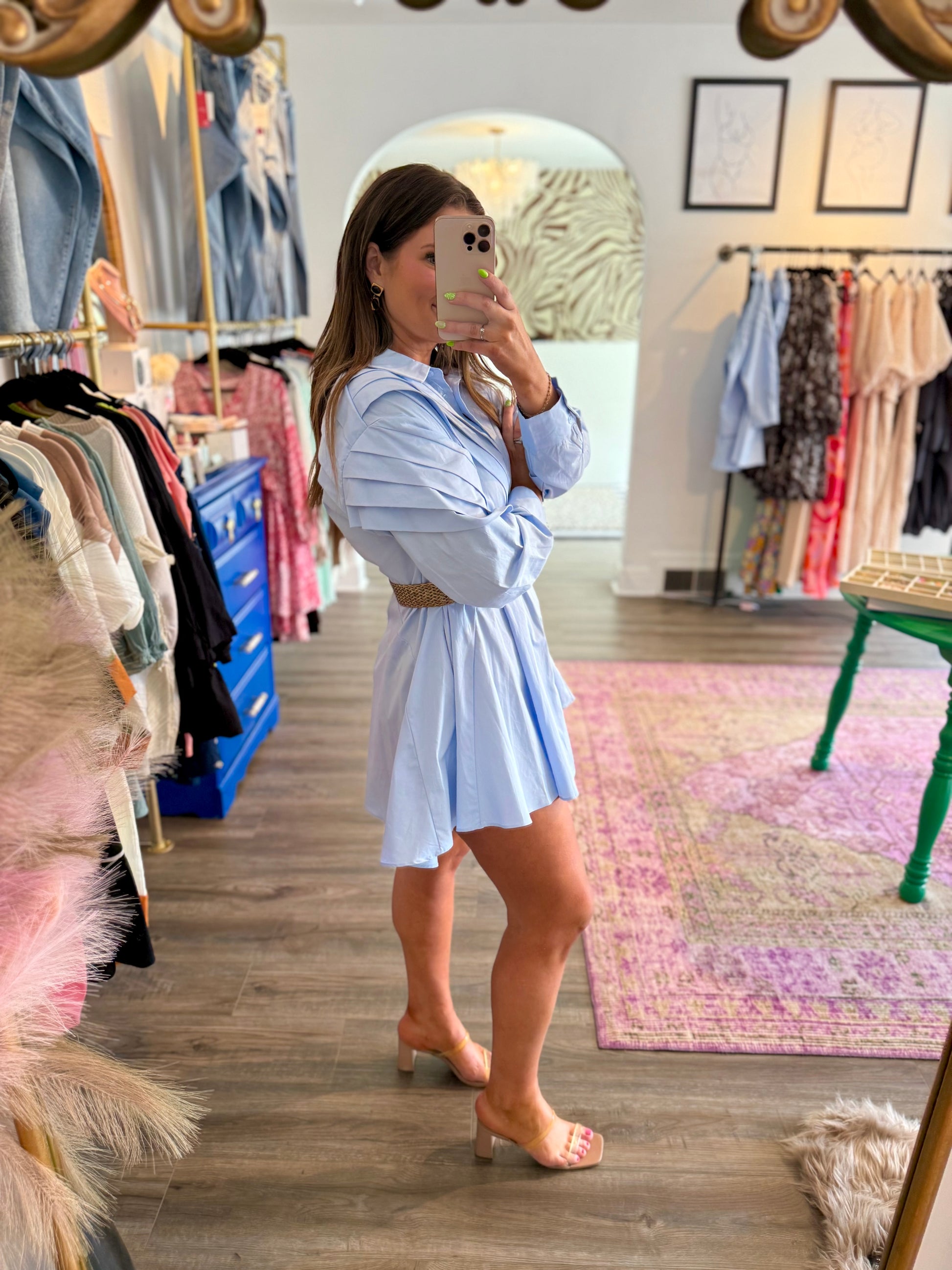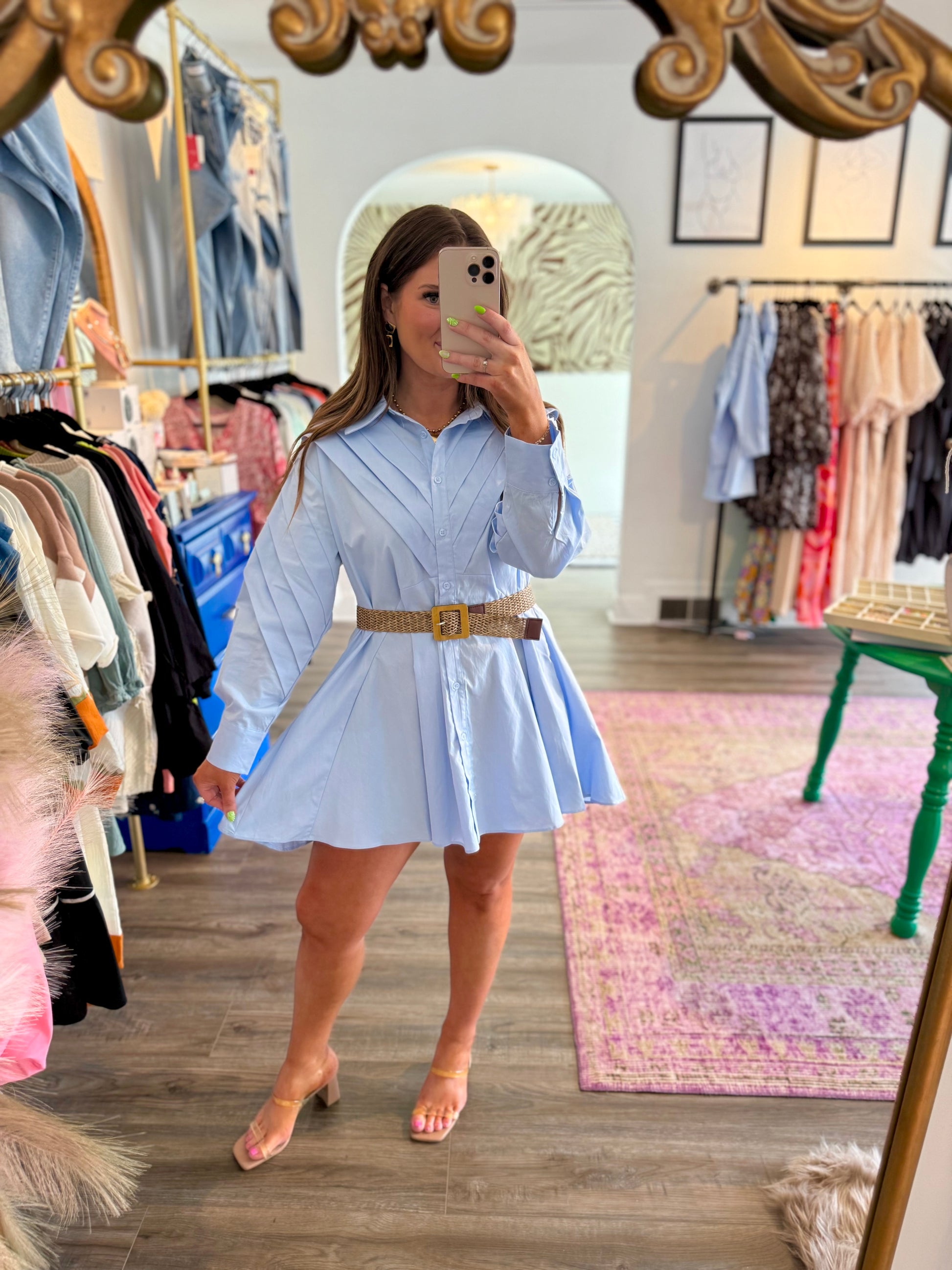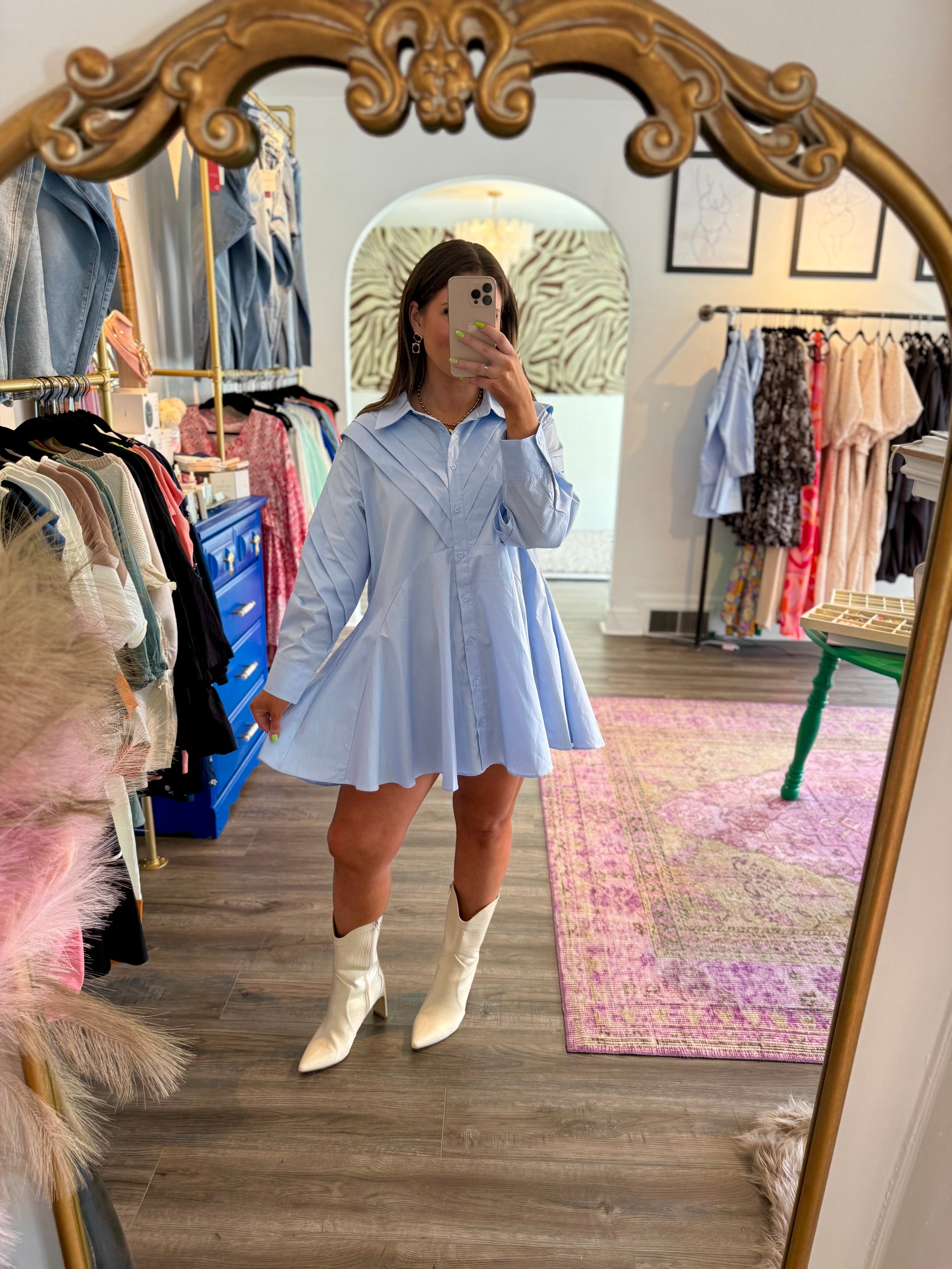 The Evie Dress redefines classic style with its contemporary oversized silhouette and relaxed fit. This playful blue button-down dress features a pointed collar that adds just the right amount of sophistication. Perfect for fall outings, bridal events, or game days, its long sleeves bring cozy charm while keeping things effortlessly chic. Embrace comfort and style with this versatile wardrobe staple!