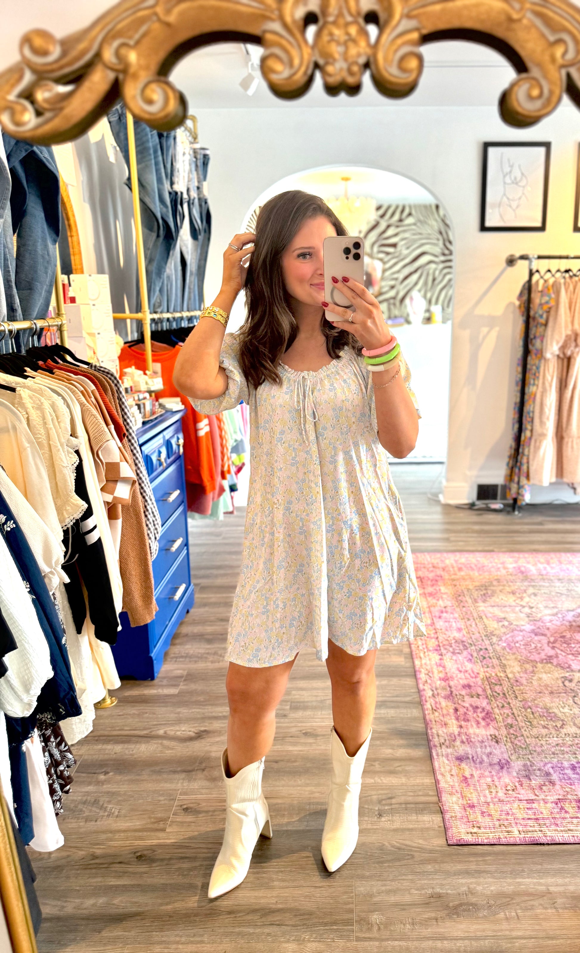 Embrace your playful side with this Flirtatious Dress in a fresh light green shade accented by soft pastel pops. Featuring a charming round scrunch neckline and flirty half sleeves, its lightweight fabric flows in an A-line fit adorned with a pretty floral print. Perfect for sunny days when you want to feel effortlessly feminine and fun.