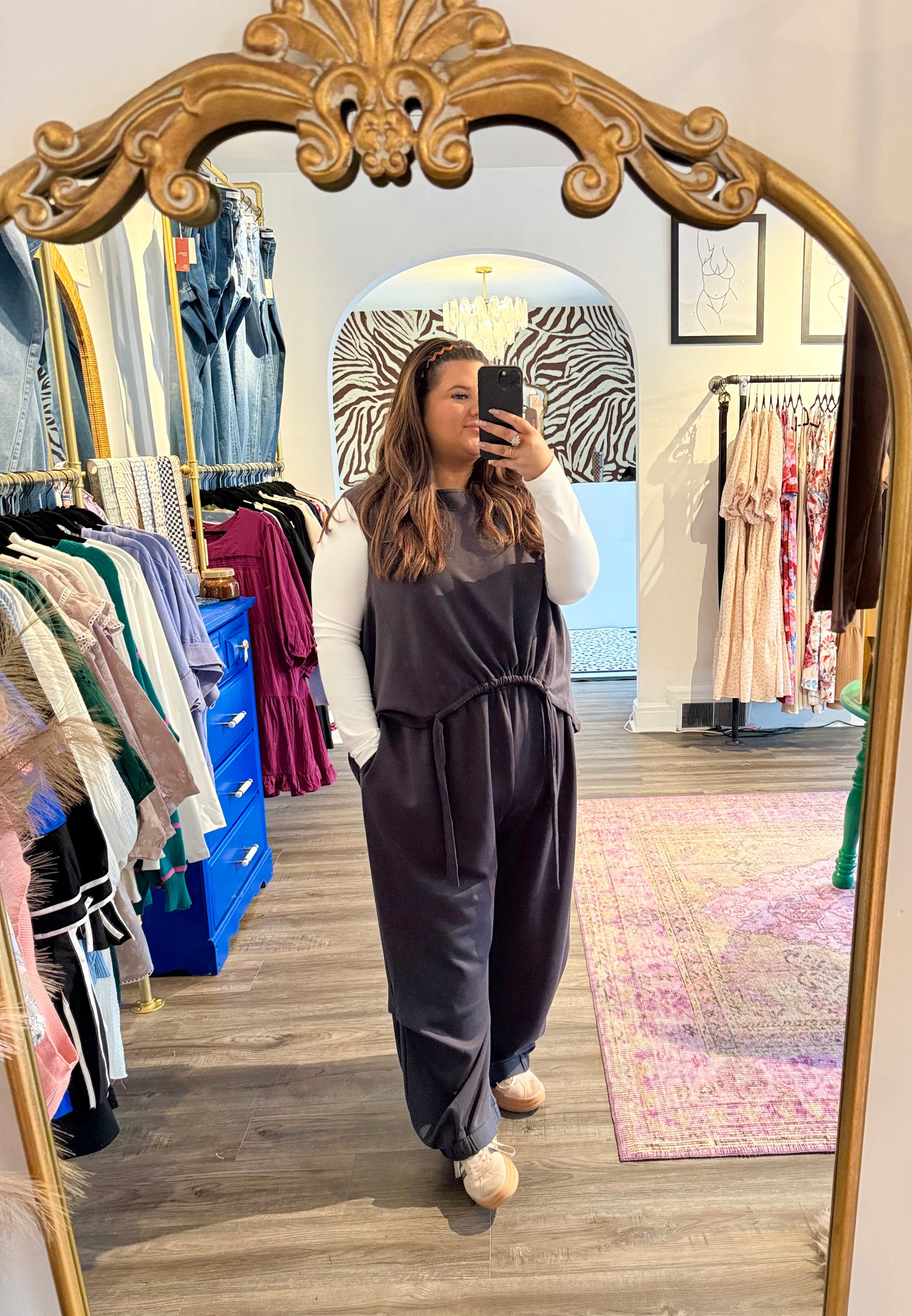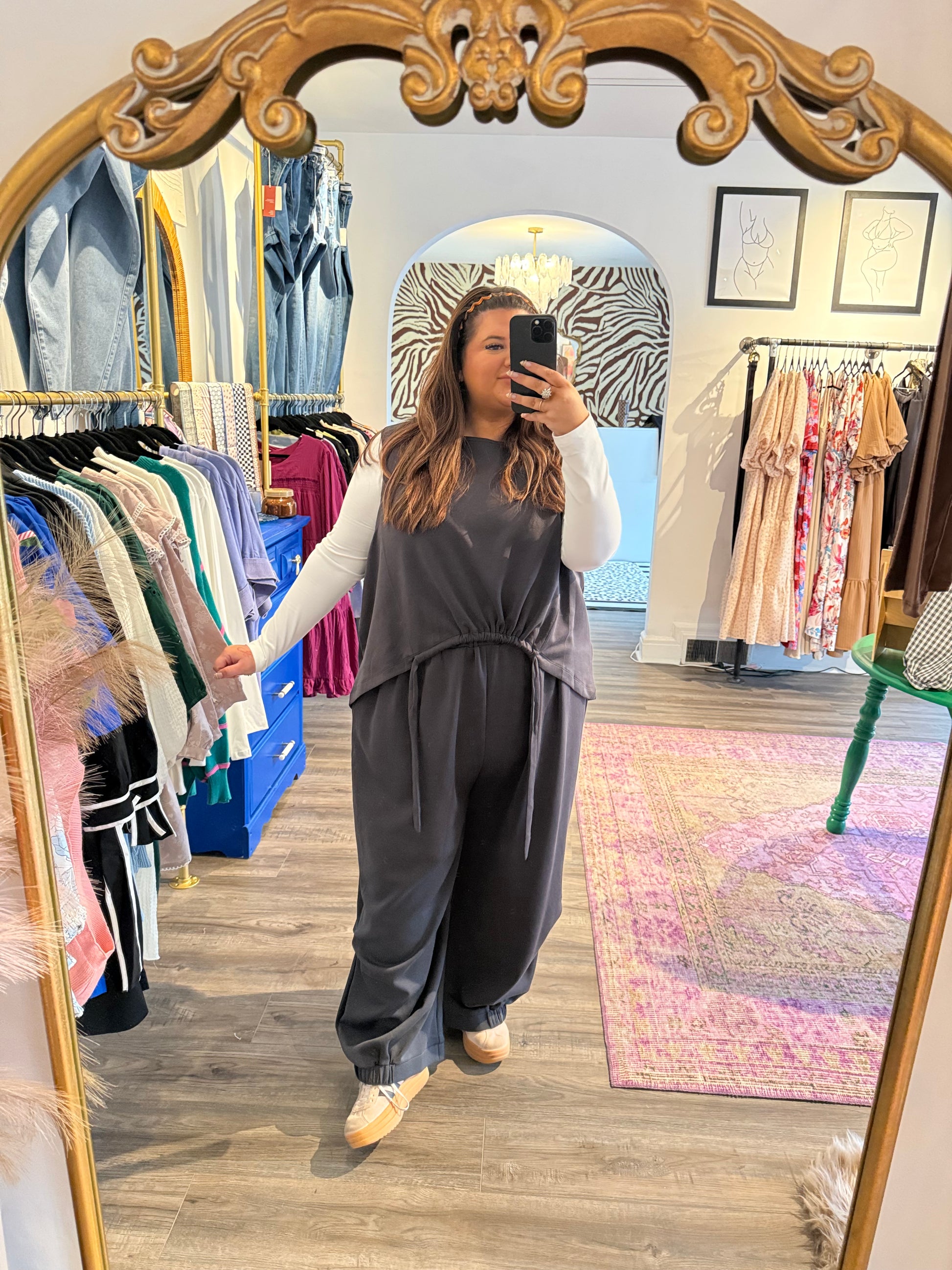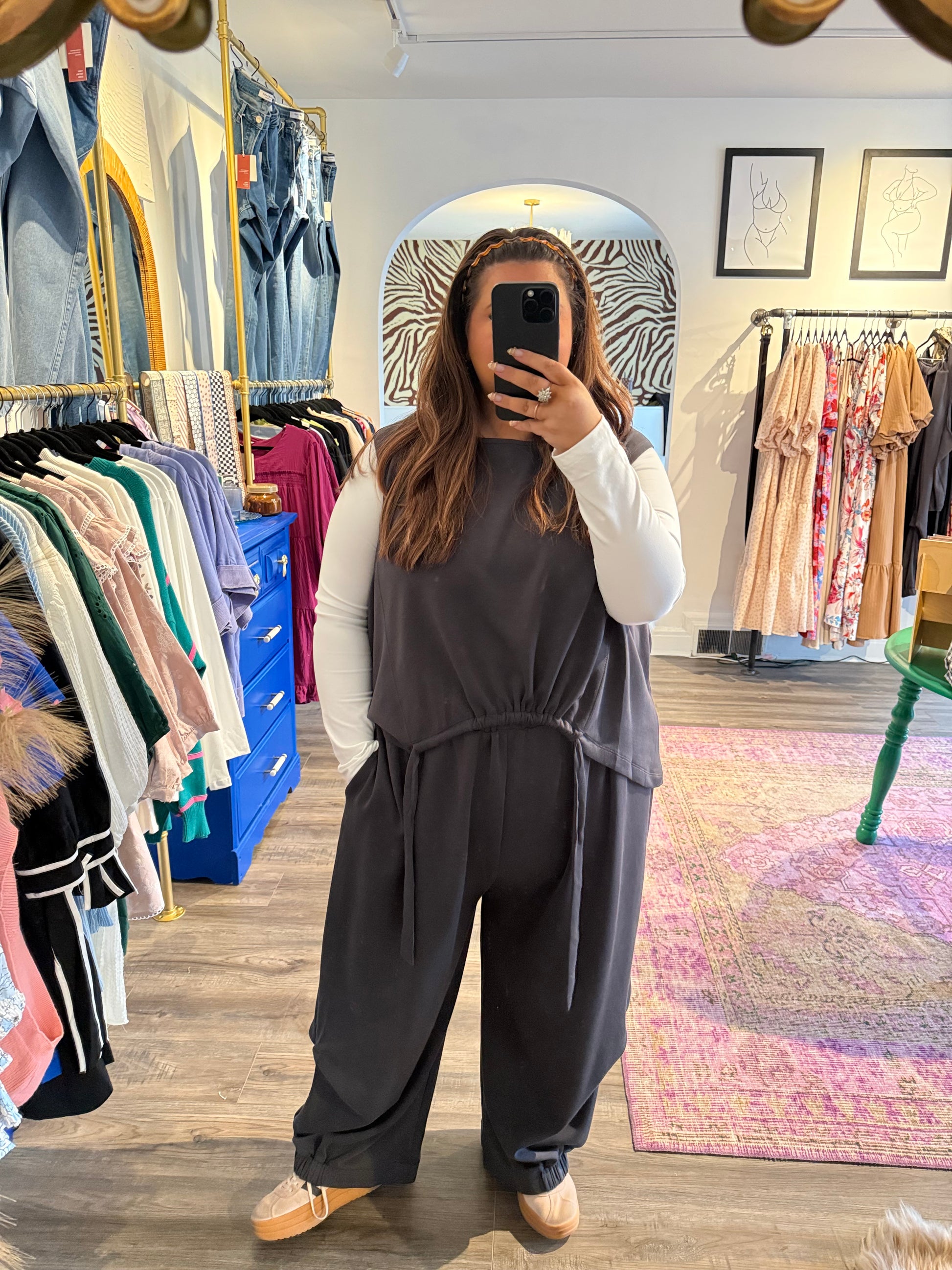 Get ready to turn heads in the Good Looking Set! This two-piece charcoal ensemble features a sleeveless top with a cute front tie, perfect for layering when it’s a bit chilly. The crew neckline adds a classic touch, while the wide-leg pants taper at the bottom for a flattering, comfy fit. With elastic ties for easy wear, this set is your new go-to for effortless style and all-day comfort. Mix, match, and play with endless looks!