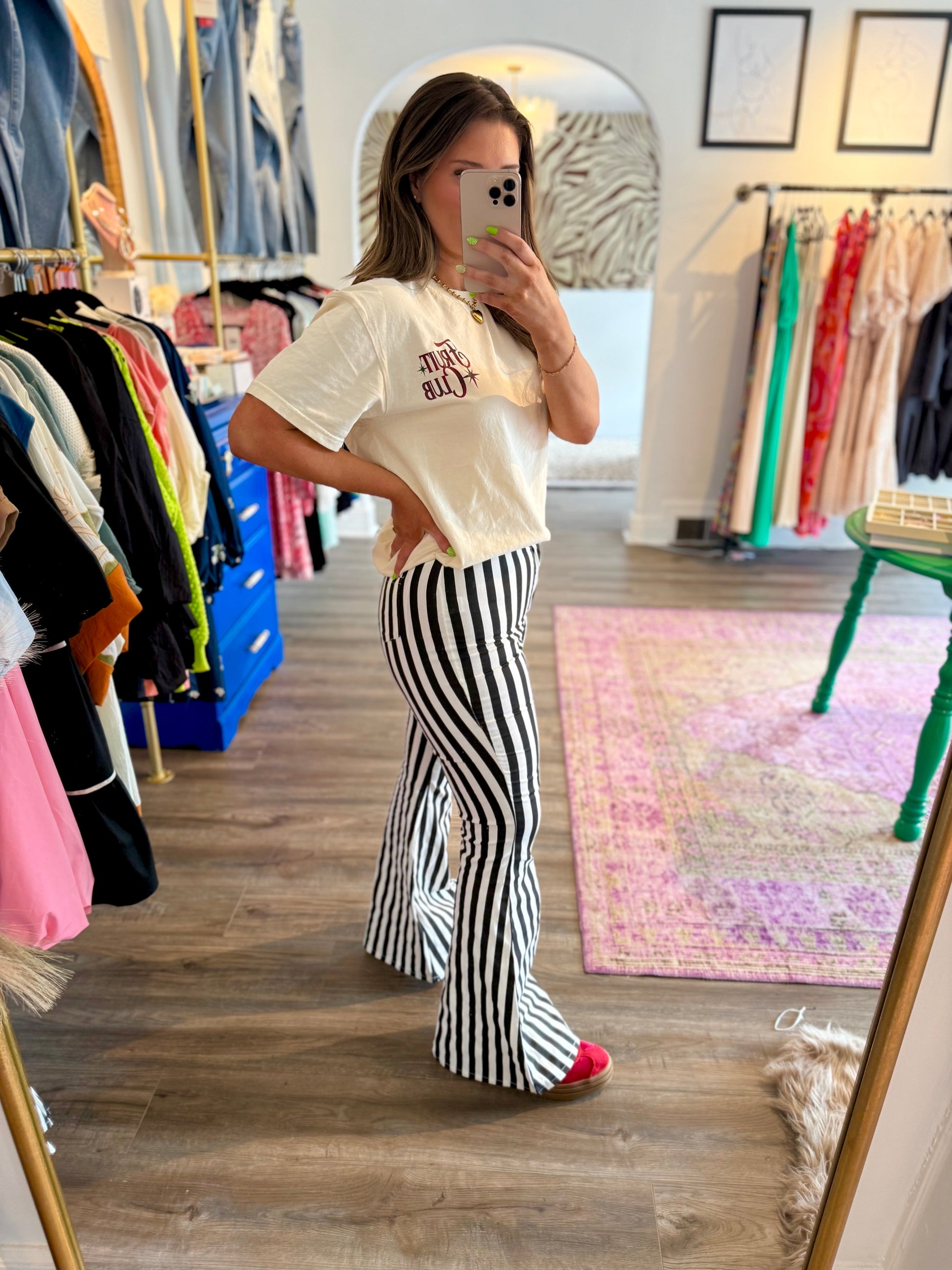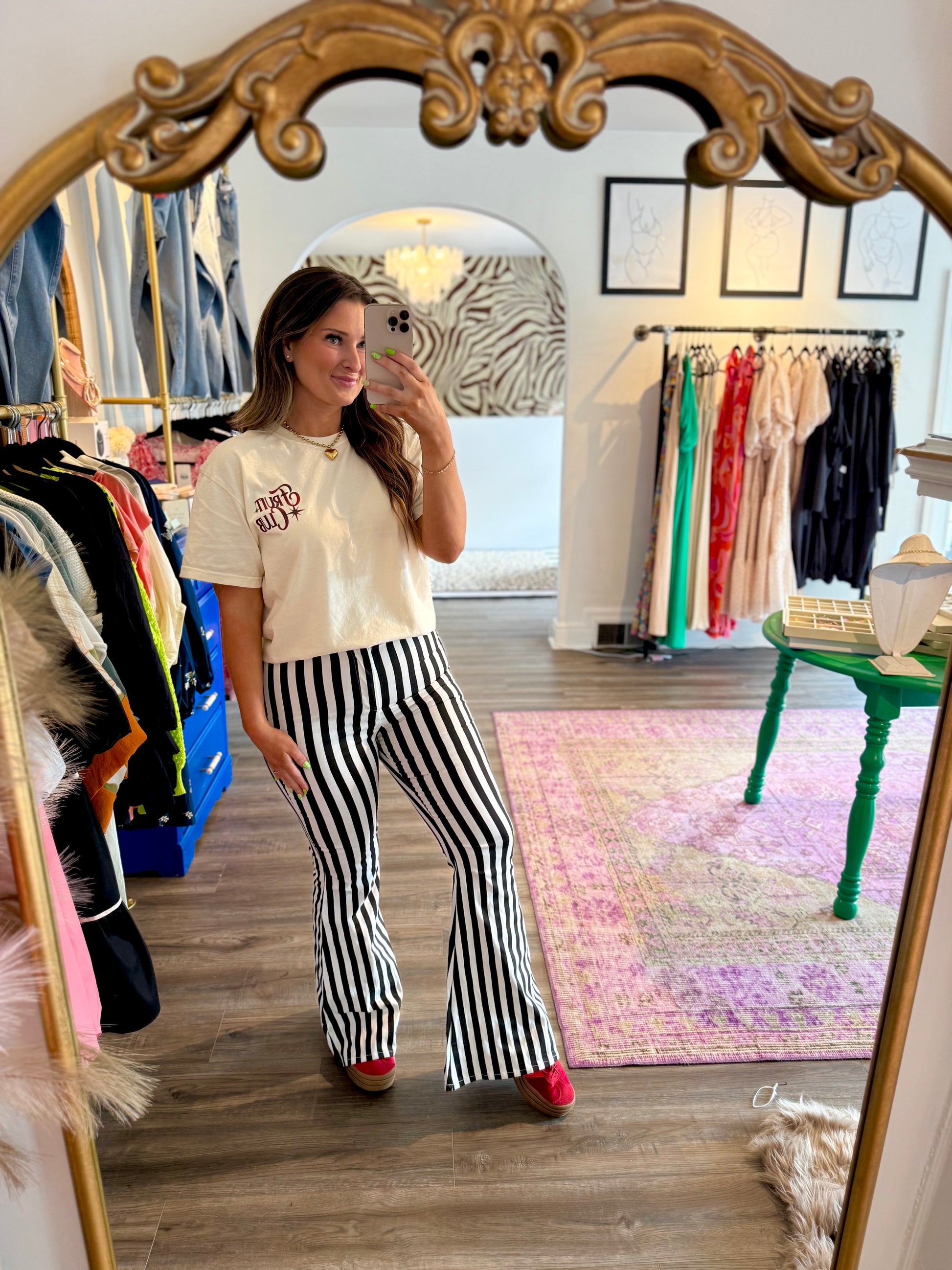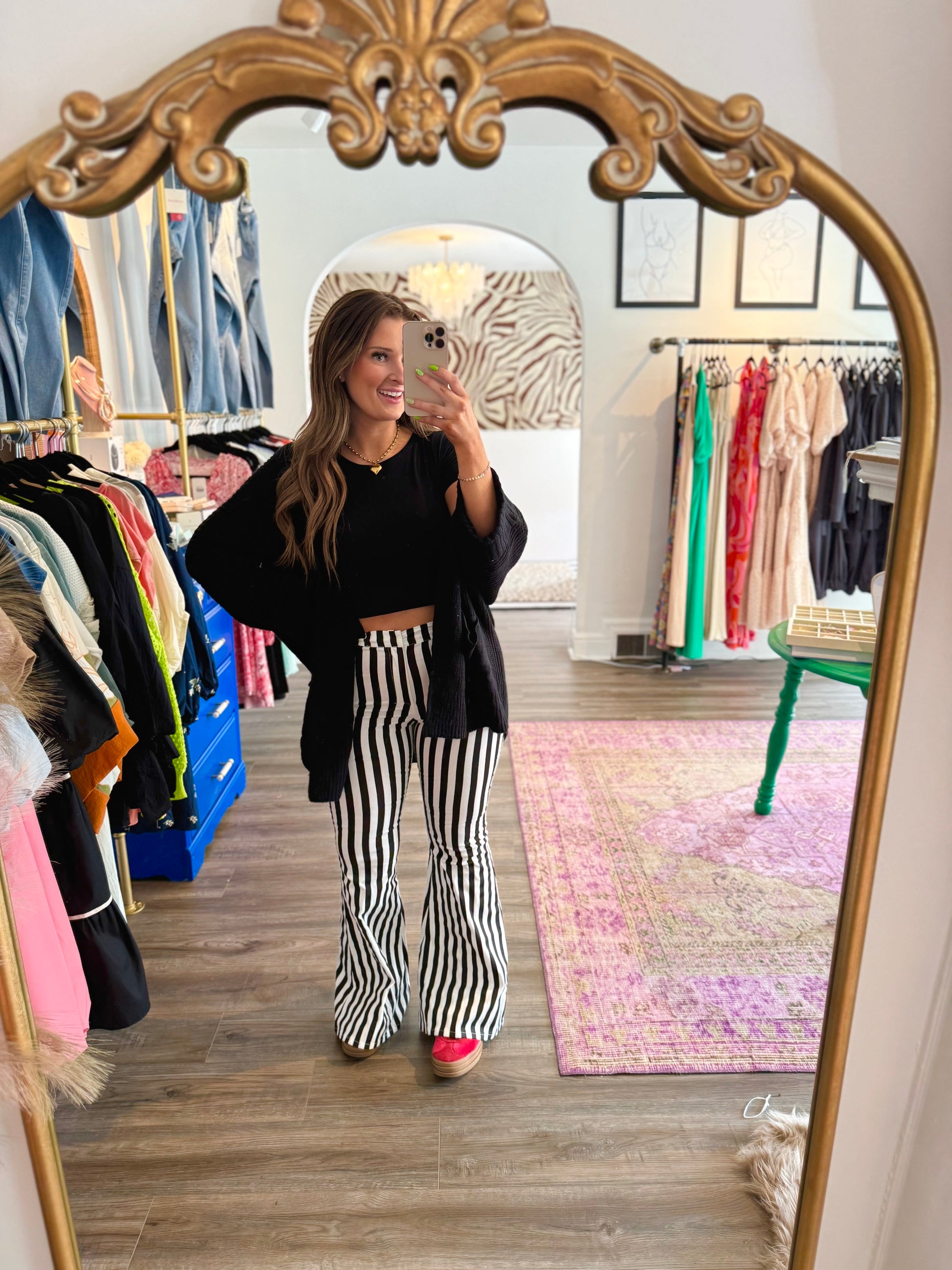 Step out in style with the Jenny From The Block Pants! These high-waisted, black and white vertical stripe pants feature a flared bottom that adds a fun twist to your look. Made from a comfortable, stretchy fabric, they move with you all day long. Pair them with a funky tee and