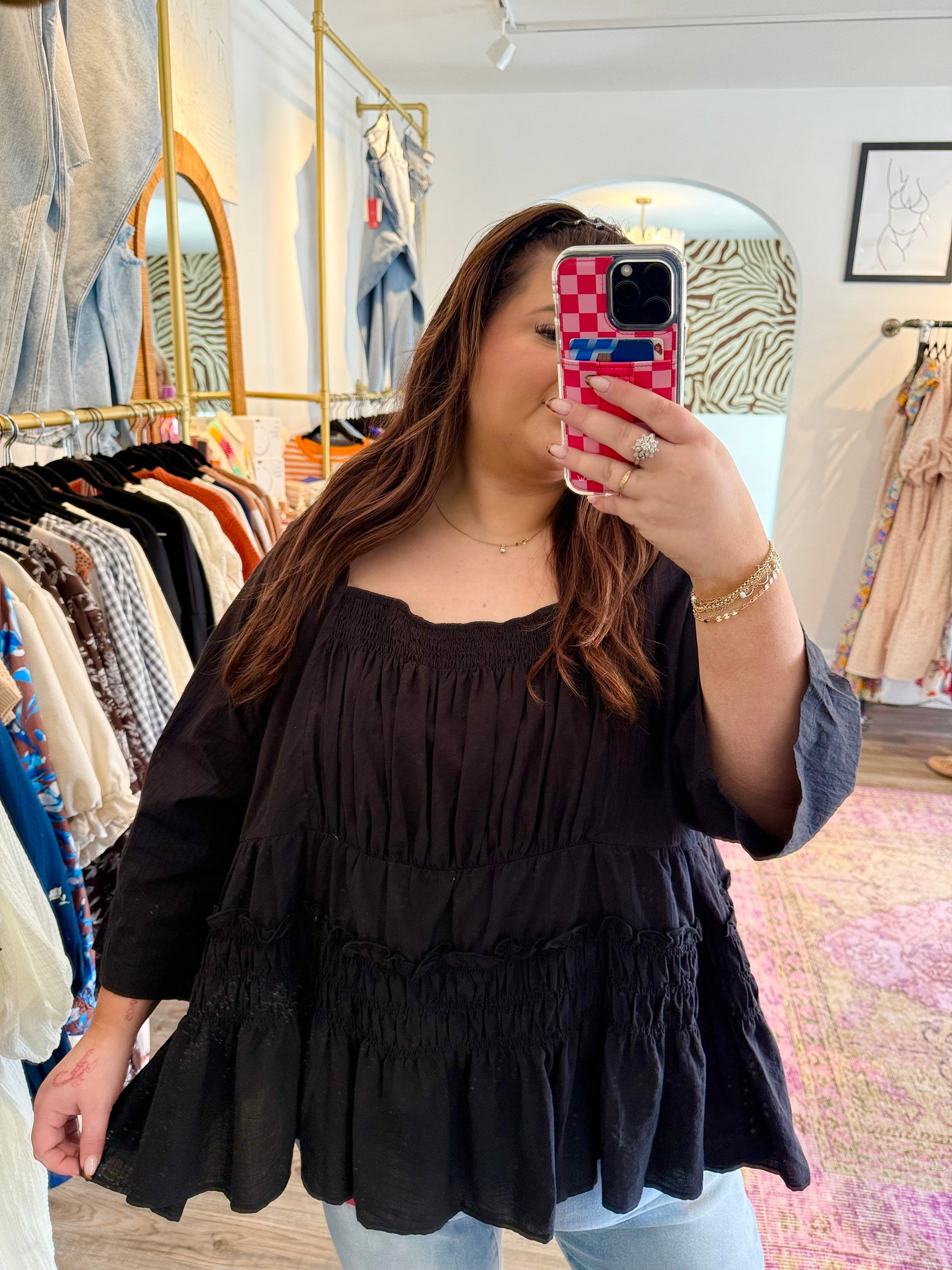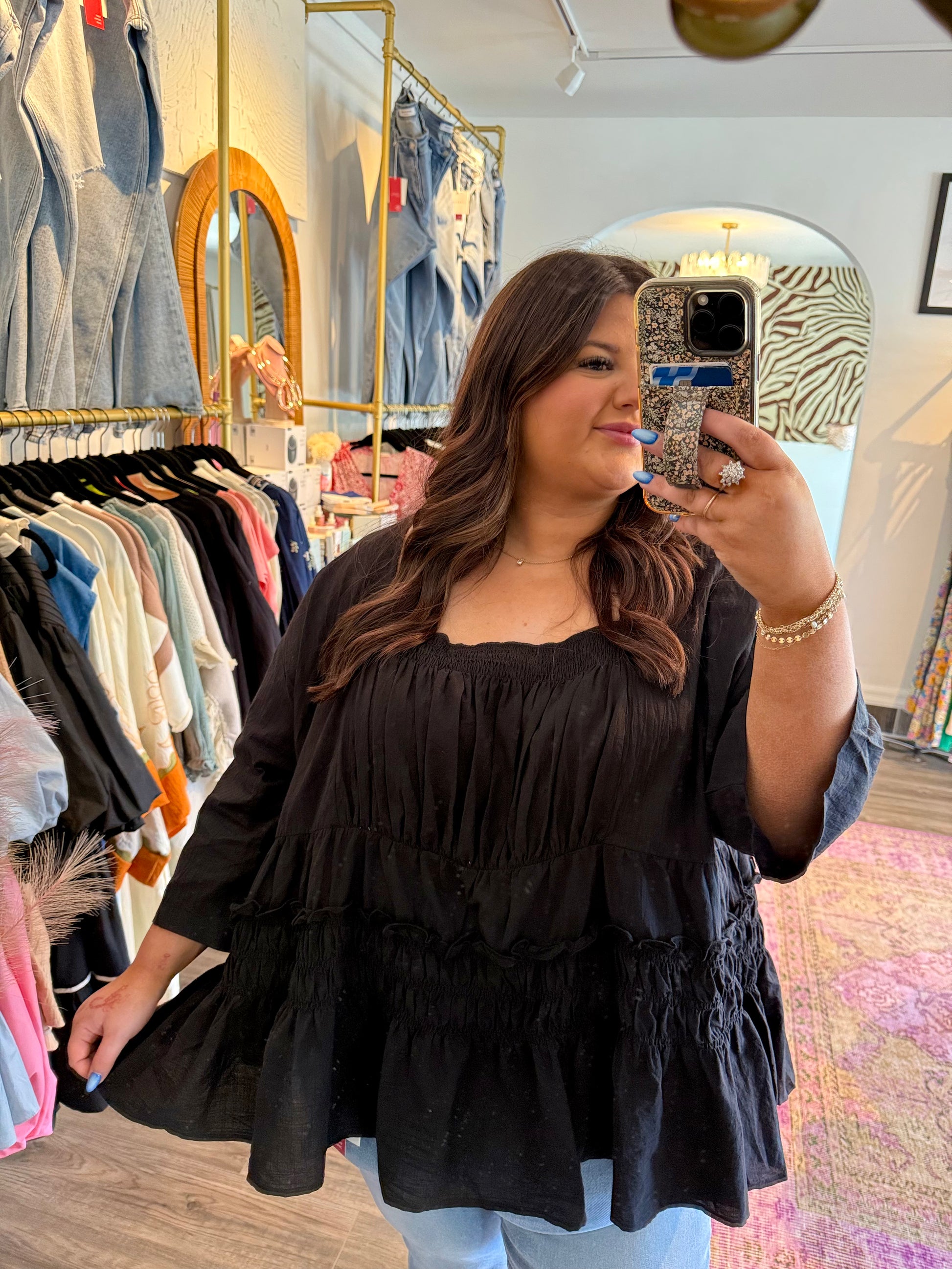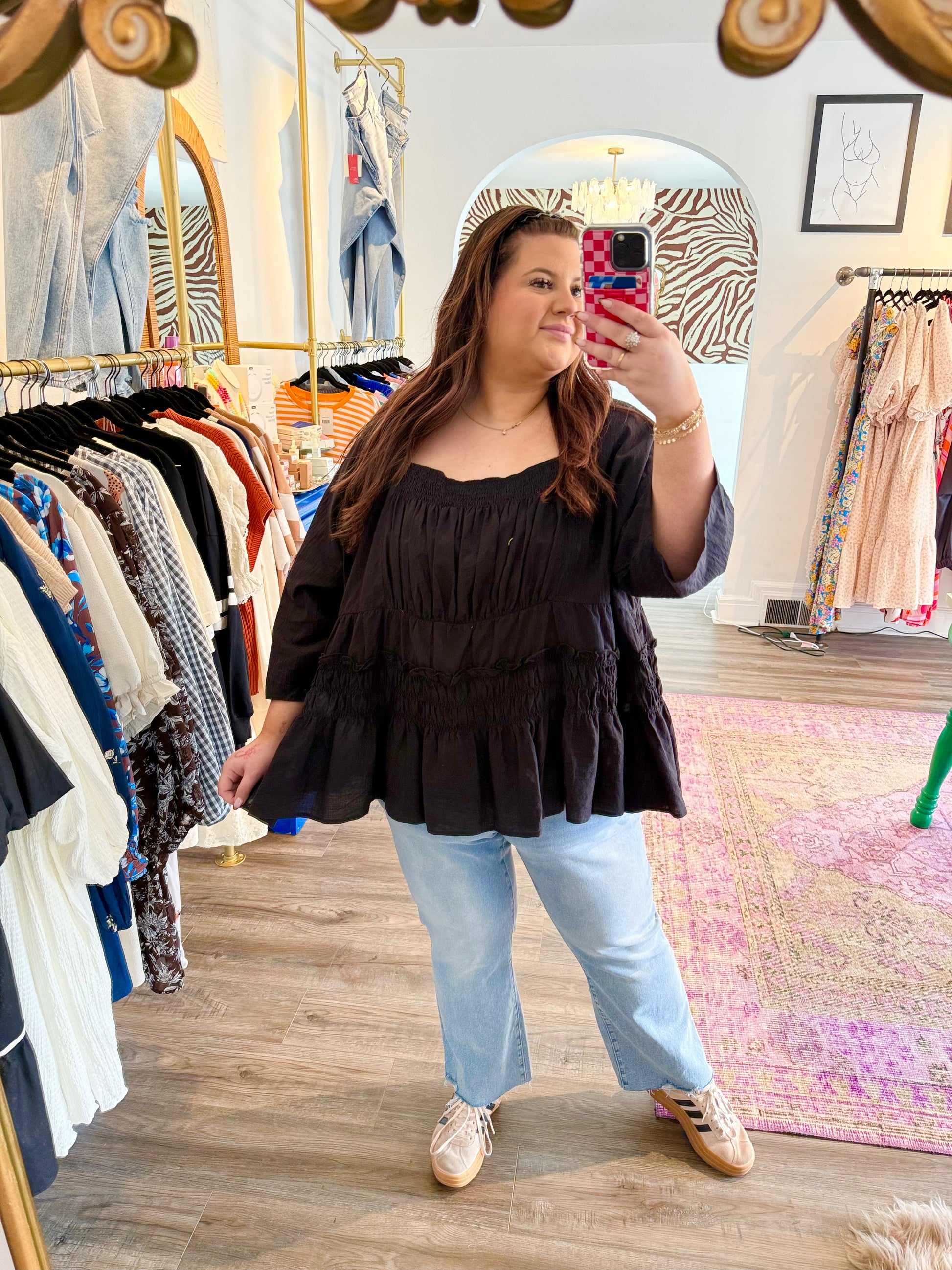 The Journey Top is your new go-to for effortless style. Featuring a charming square neck and playful ruffle details, this lightweight tunic offers a loose, airy fit that keeps you comfortable all day. The elastic bust adds a flattering touch, making it perfect to pair with any bottoms for endless outfit possibilities. Embrace comfort and versatility with a top that’s as fun as your adventures.