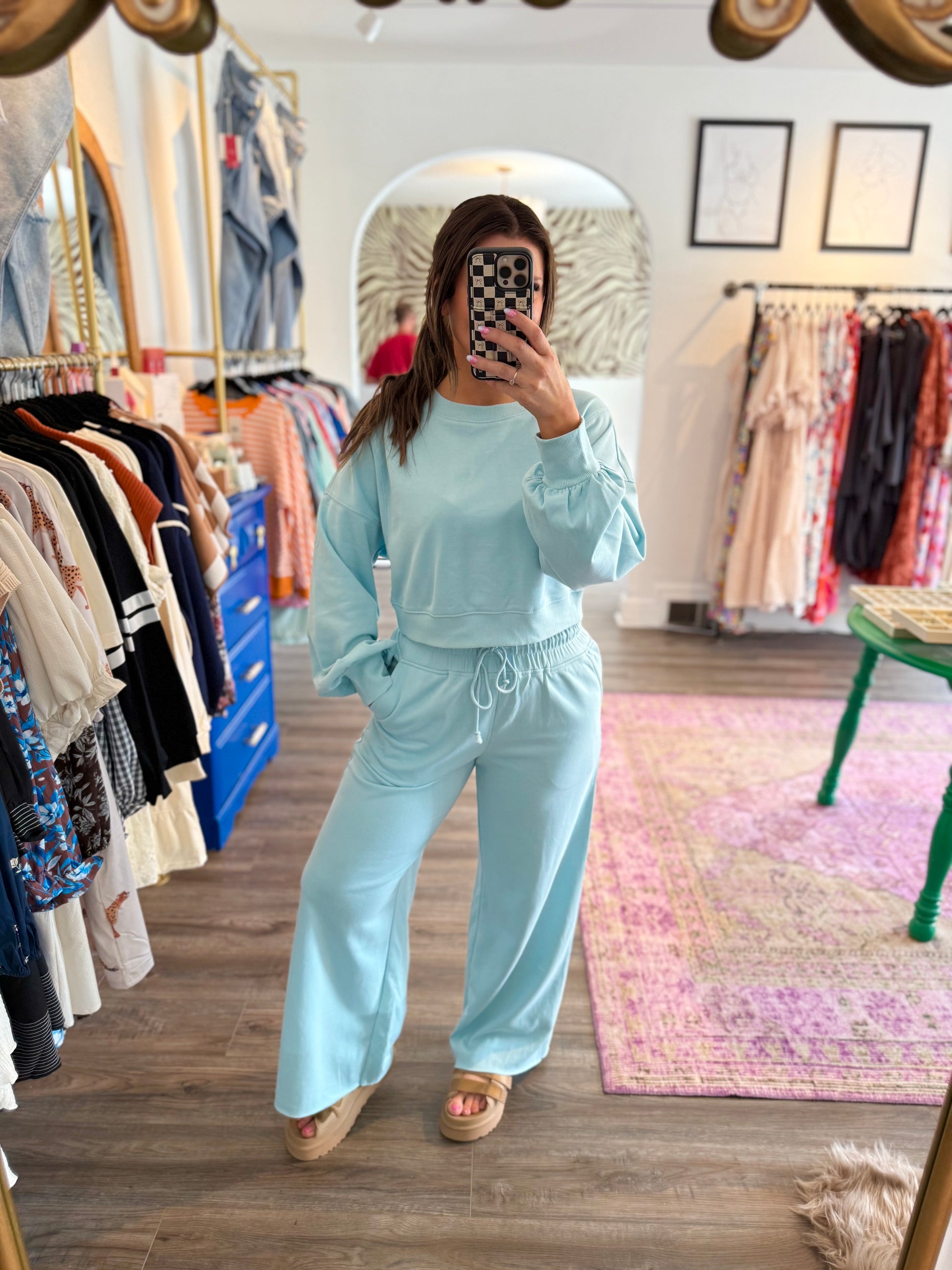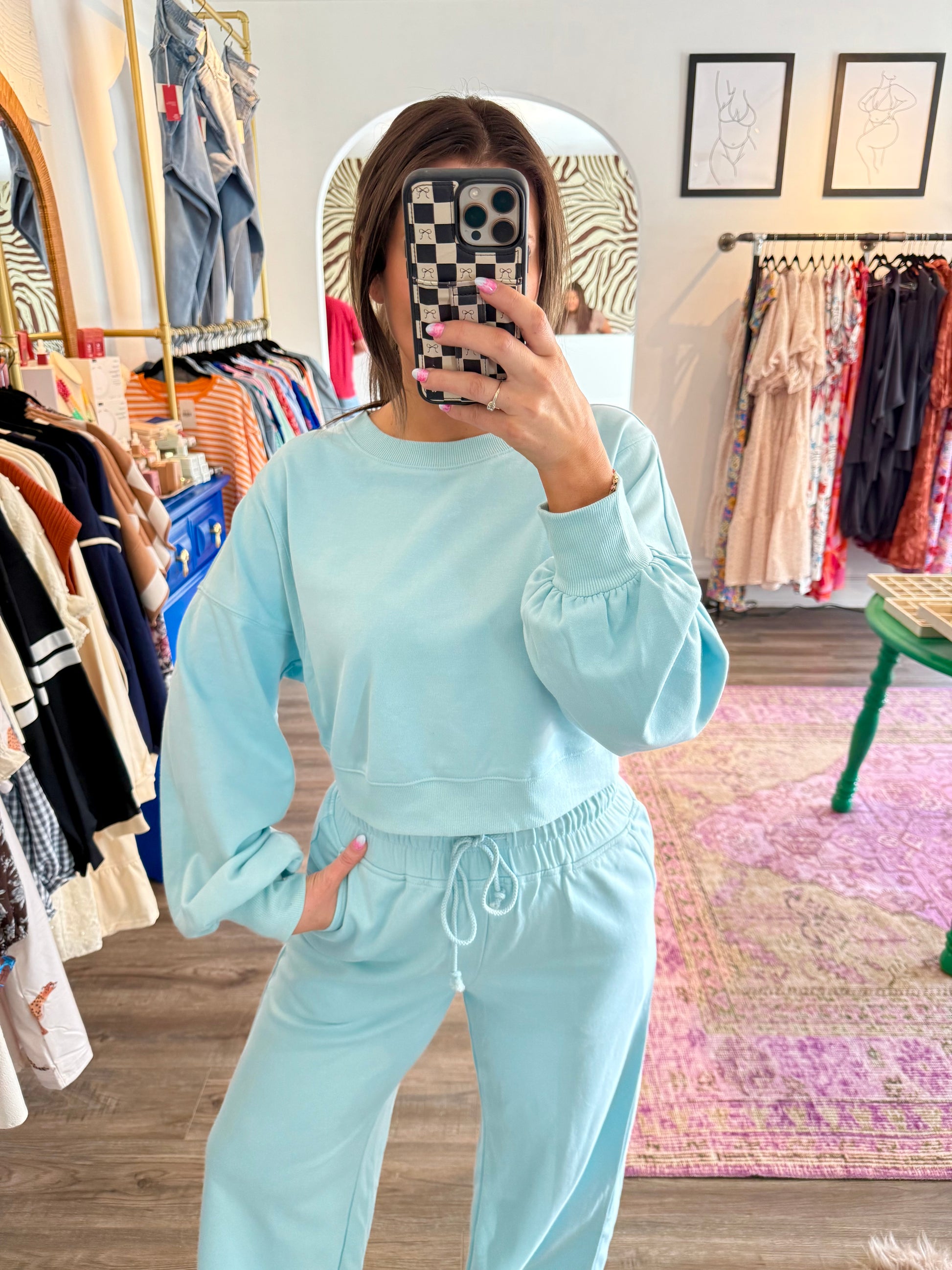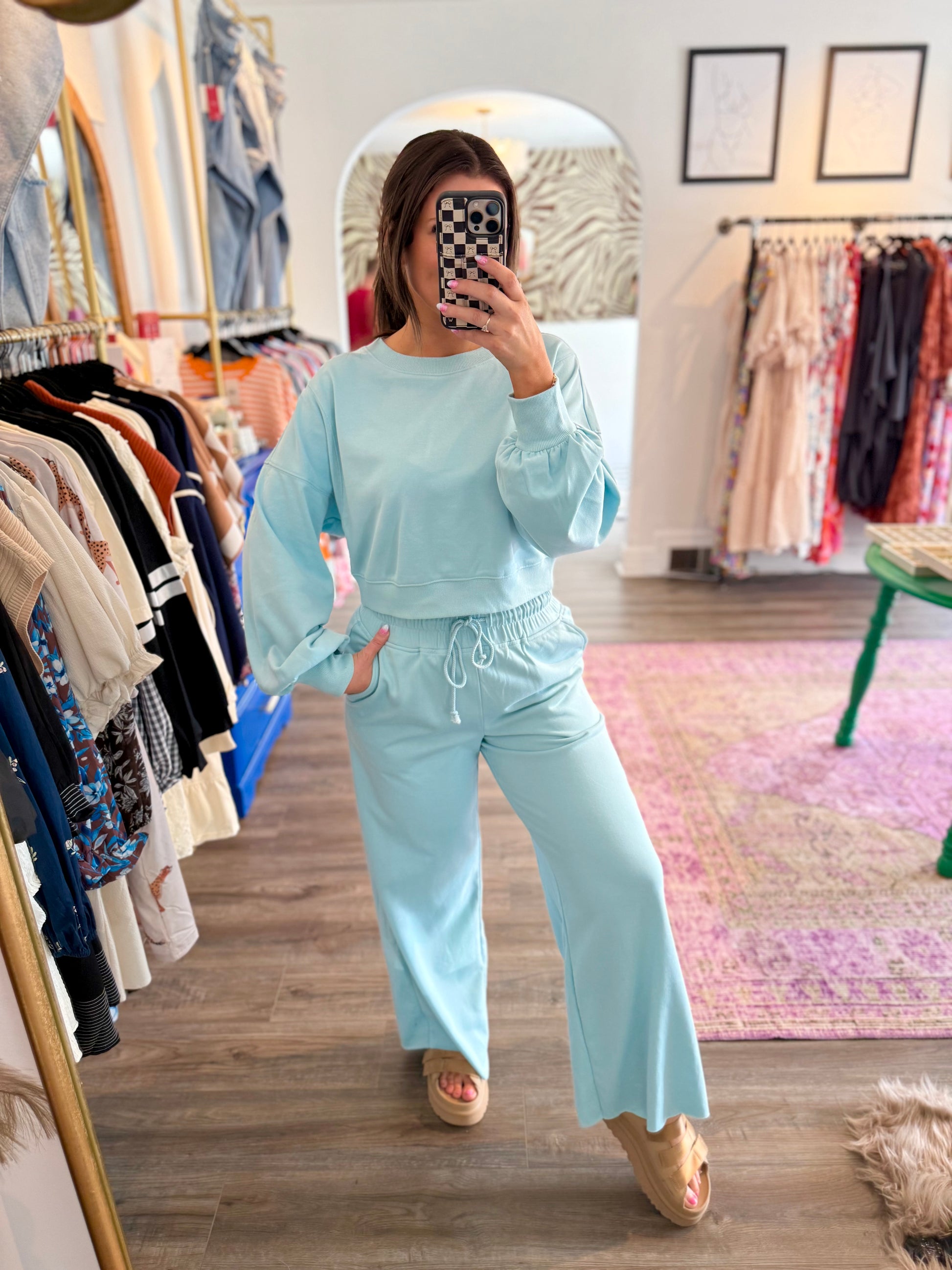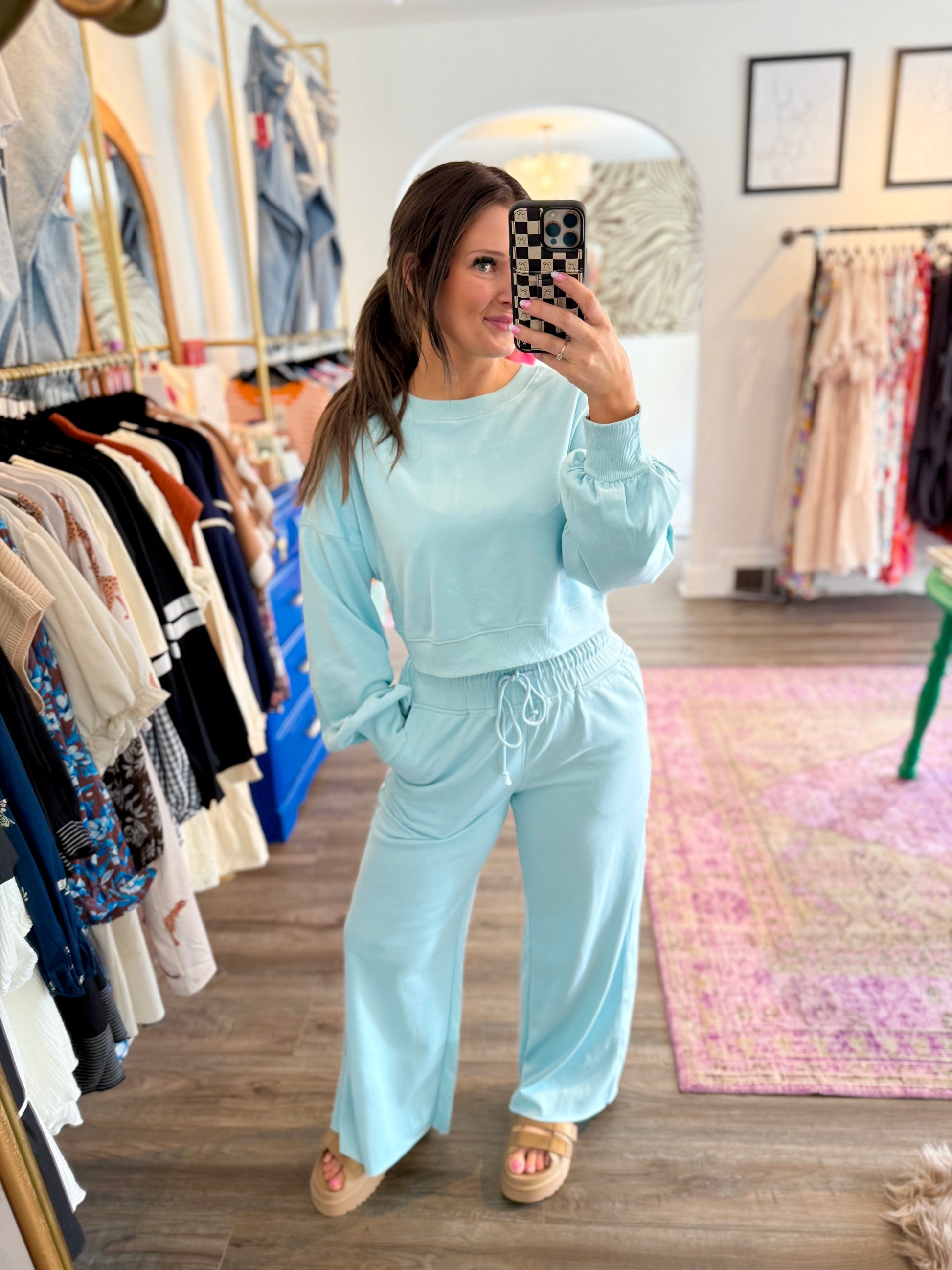 Get ready to lounge in style with the Maroney Set! This playful duo features a cozy long-sleeve, cropped top and matching long pants with a comfy tie waist. Perfect for chillier days, the lightweight, soft fabric in a fresh light blue keeps you comfy without overheating. Pair it with your favorite sneakers and you’re set for ultimate athleisure vibes that feel as good as they look.
