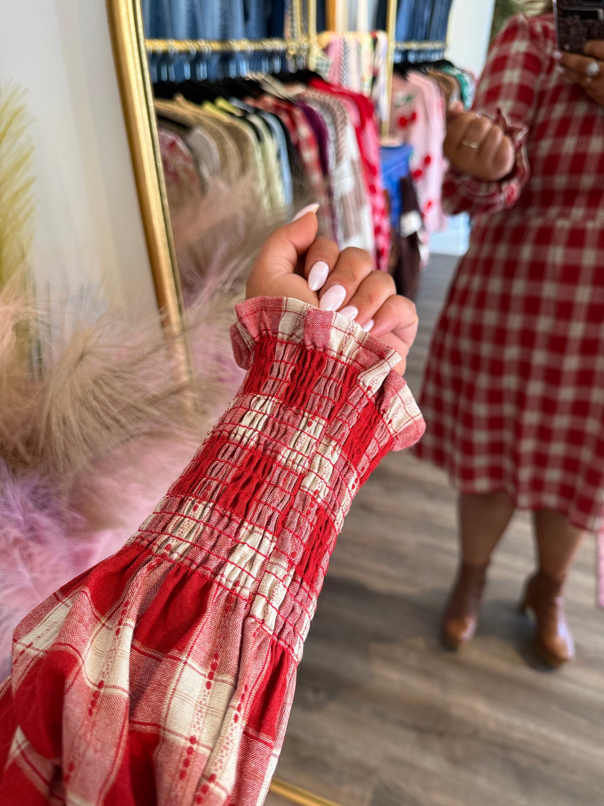 The Marry Me Dress is your winter wardrobe's new best friend. This playful babydoll style features long sleeves and a fitted chest that flatters every frame, while charming red and cream plaid detailing adds instant personality. Dress it up for date night or keep it casual with sneakers—either way, you're winning. Layer with tights when temperatures drop for extra coziness. Perfect for those moments when you want to look effortlessly put-together without trying too hard.