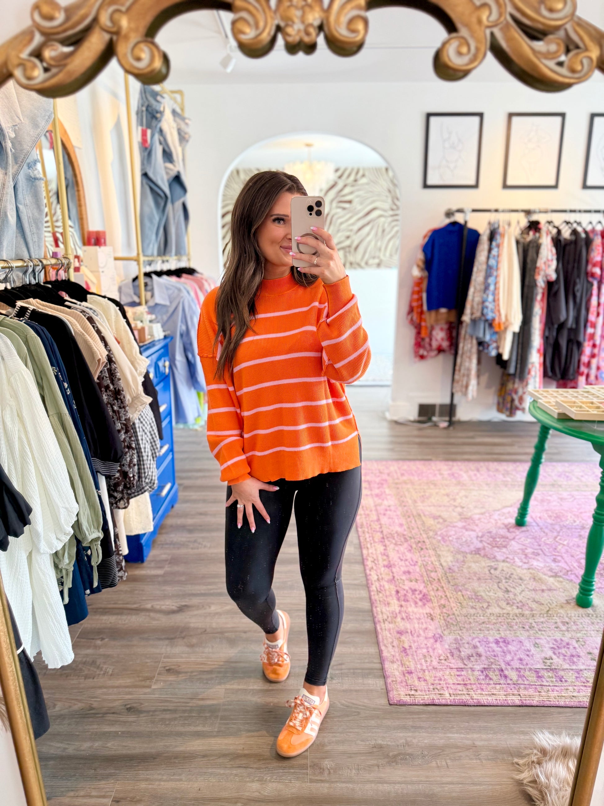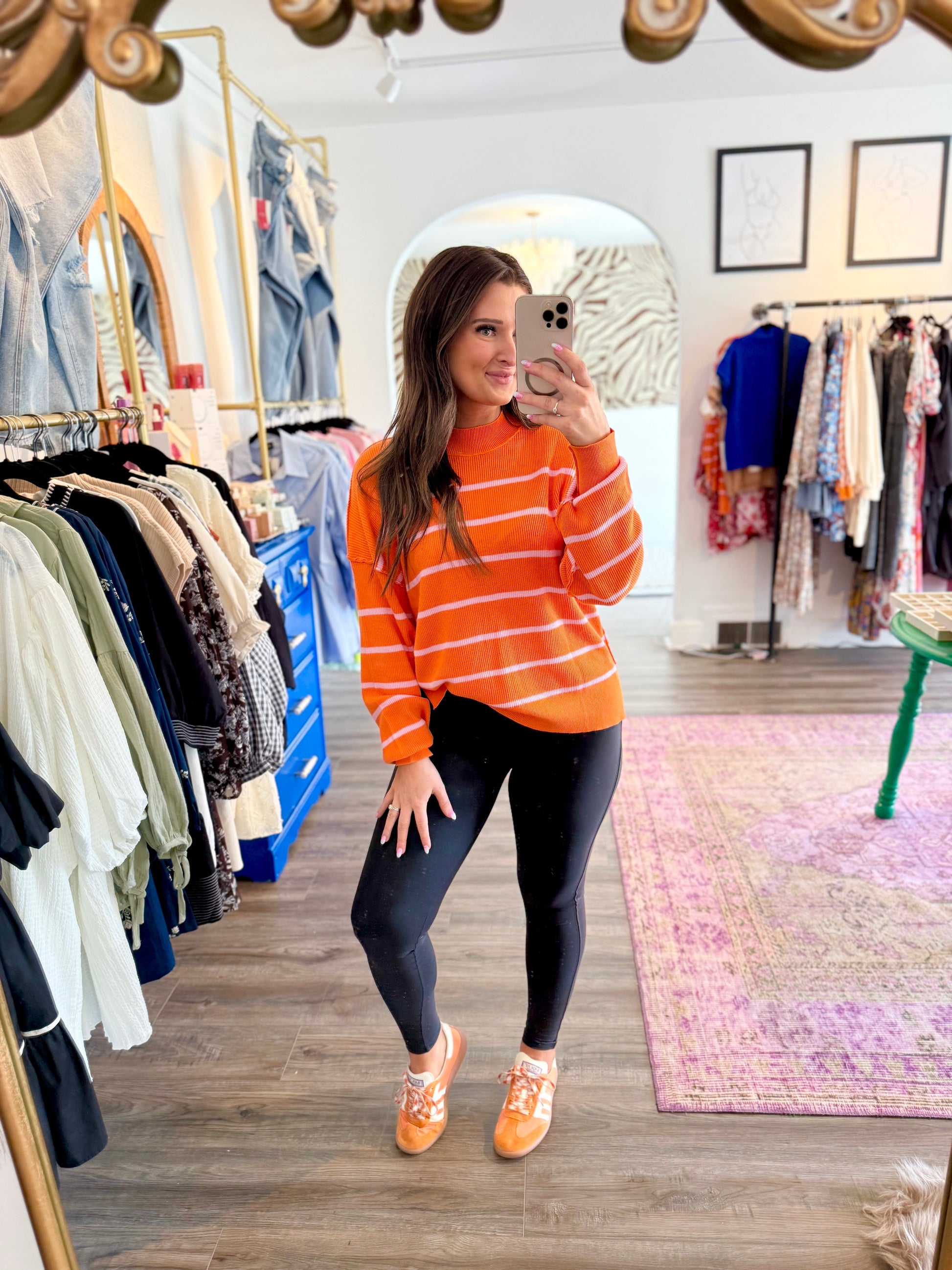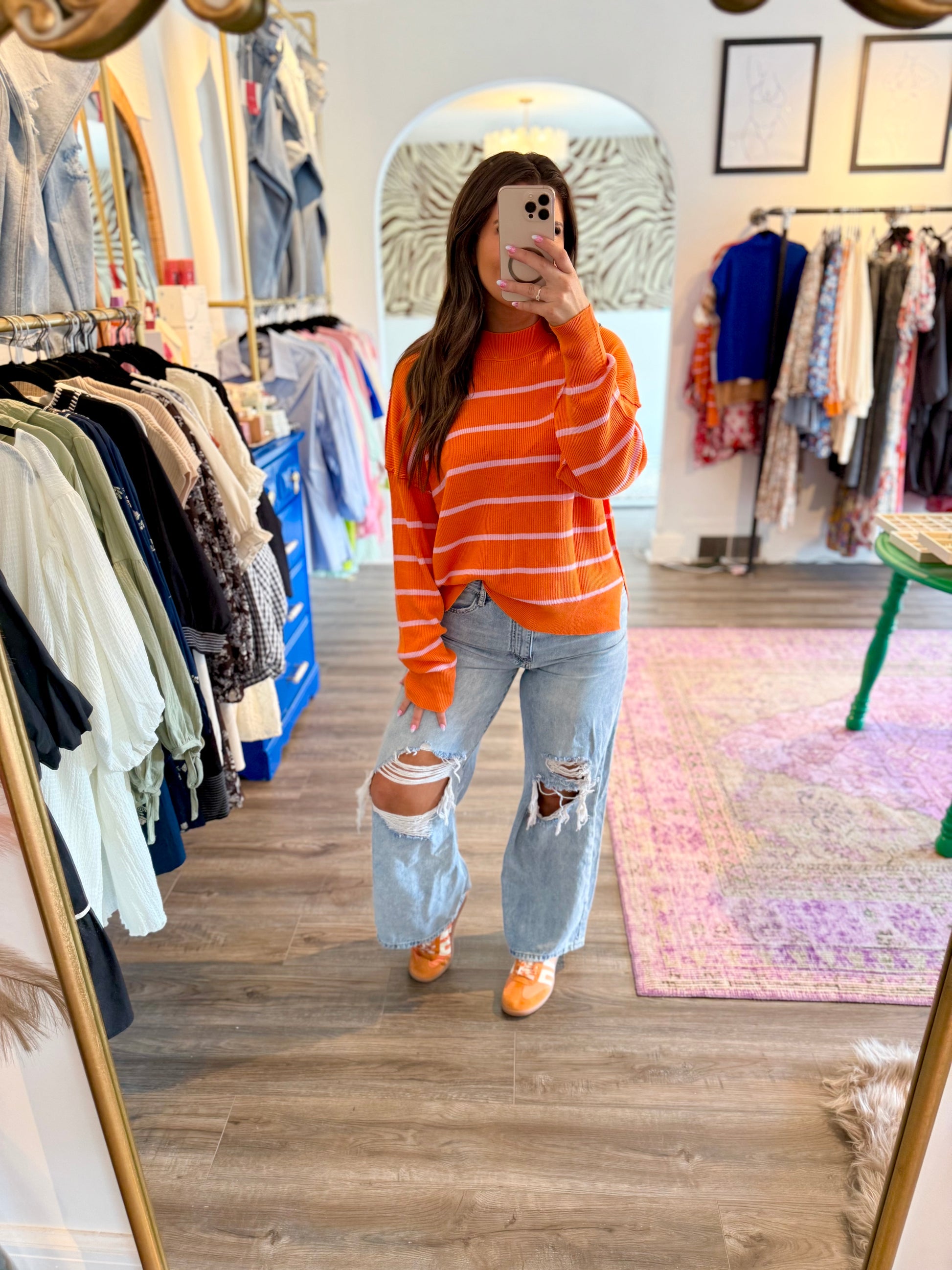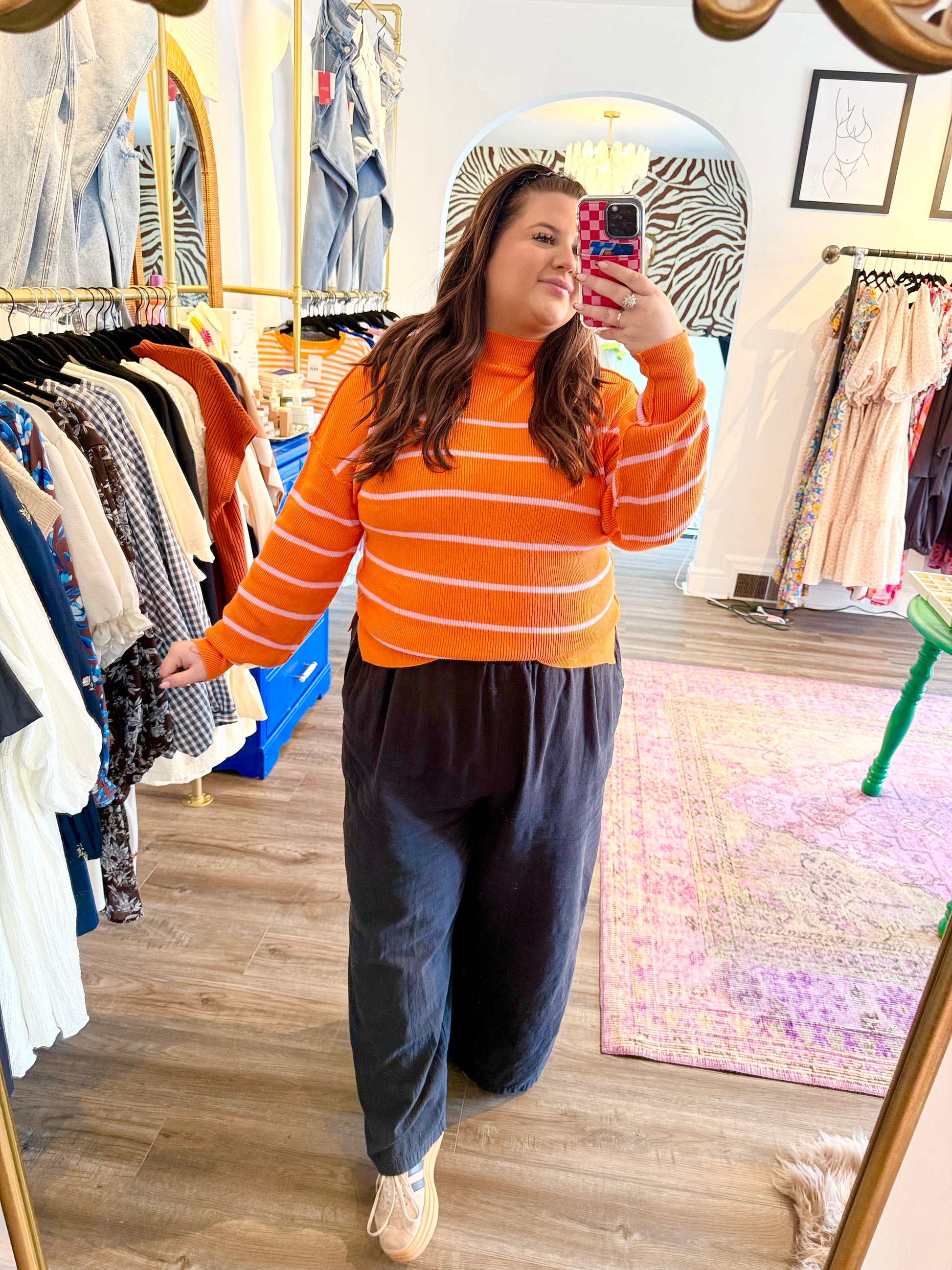 Meet the Meg Sweater — a playful pop of orange and pink in a cozy, ribbed fabric that’s just right for layering. With a trendy cropped cut and relaxed drop shoulders, it pairs effortlessly with your favorite denim or breezy linen pants. The long sleeves and high neck add a chic touch without weighing you down, making it perfect for those days when you want style and comfort in one colorful package.