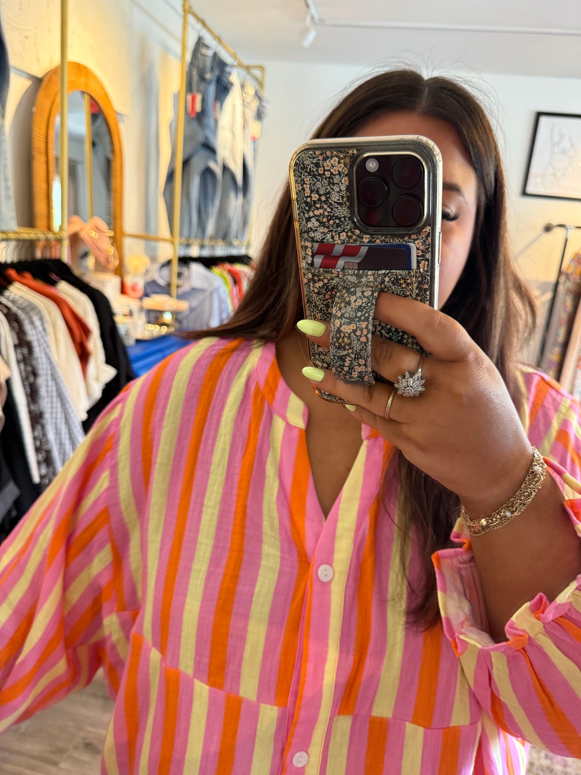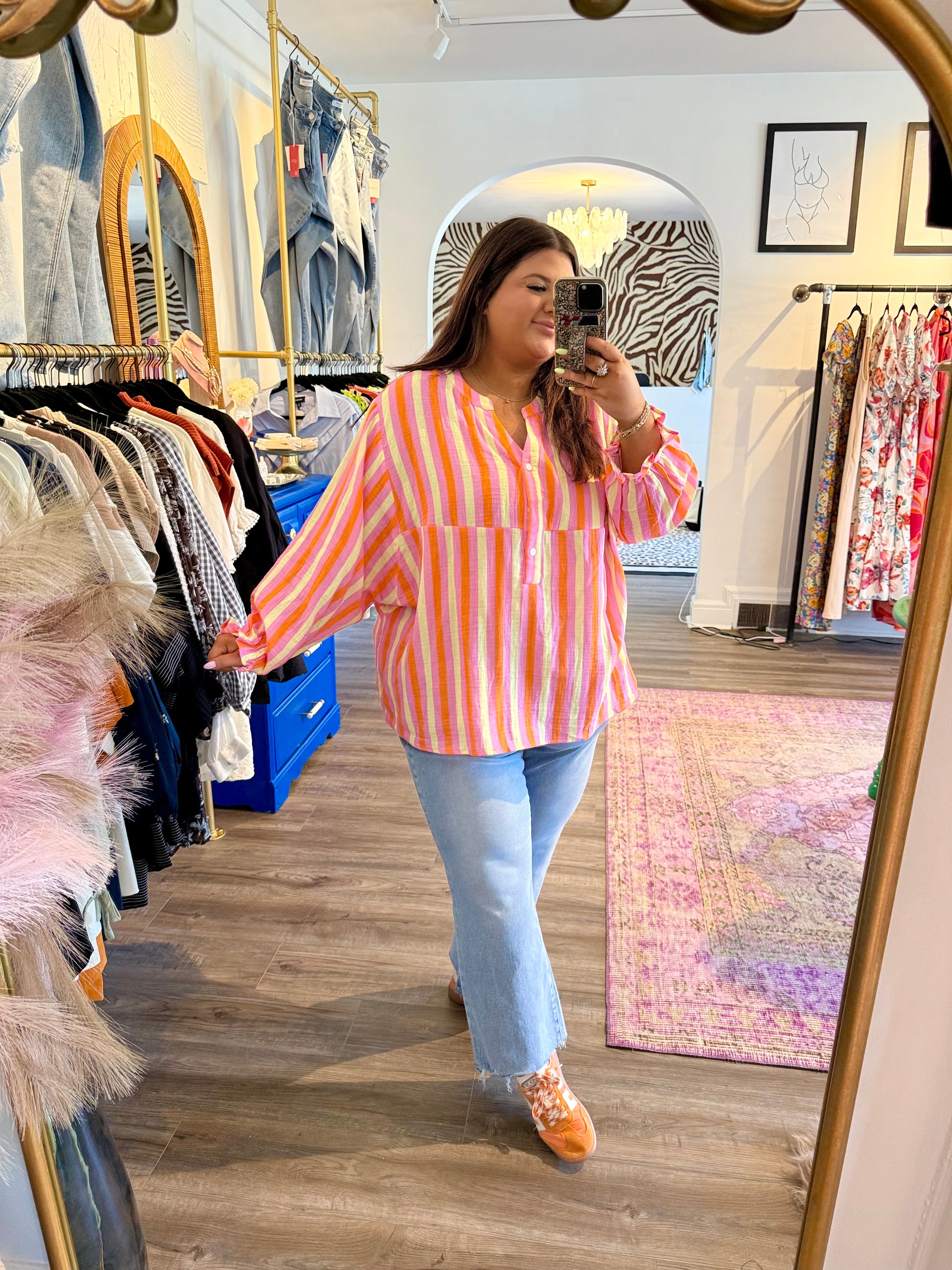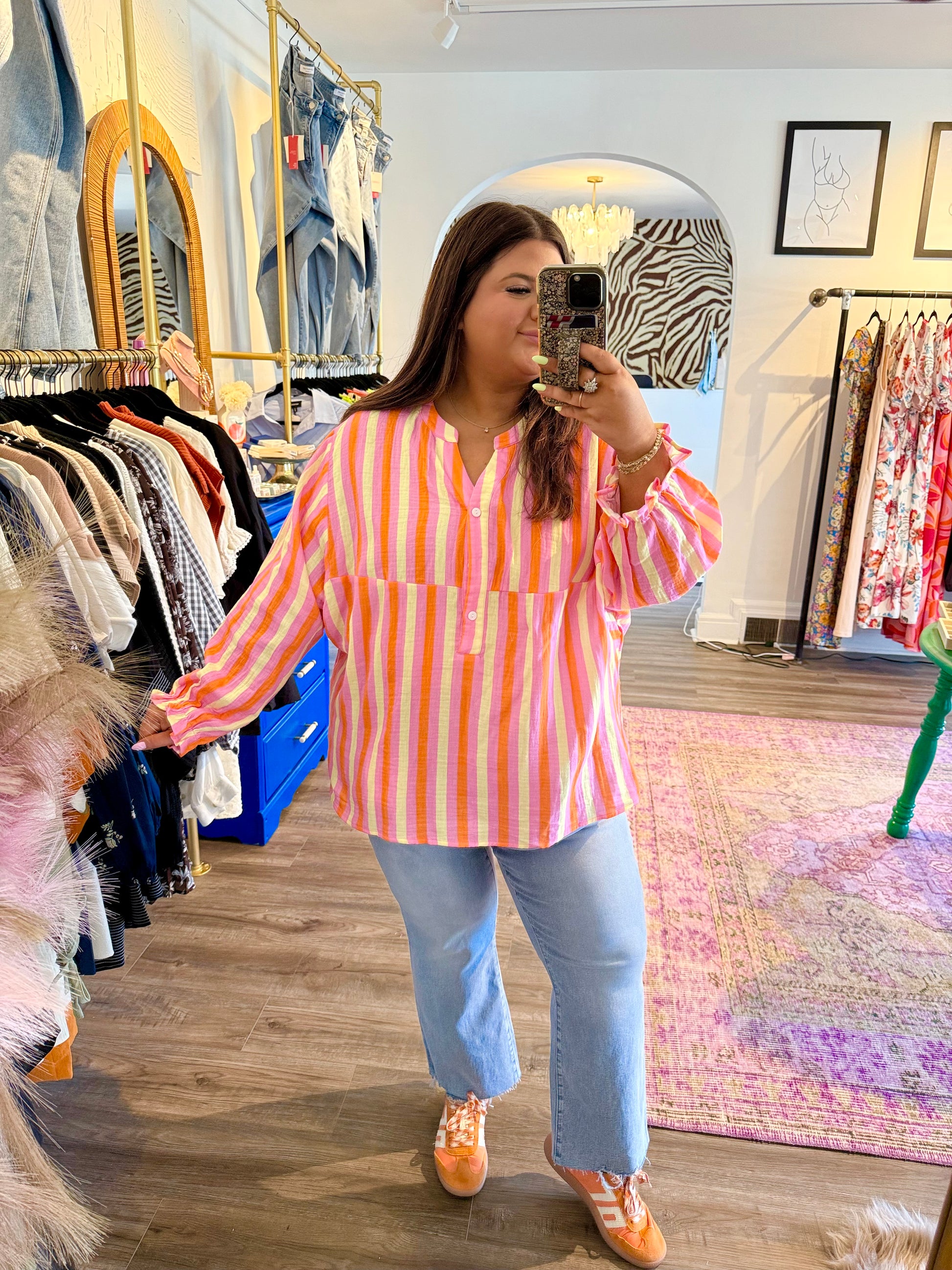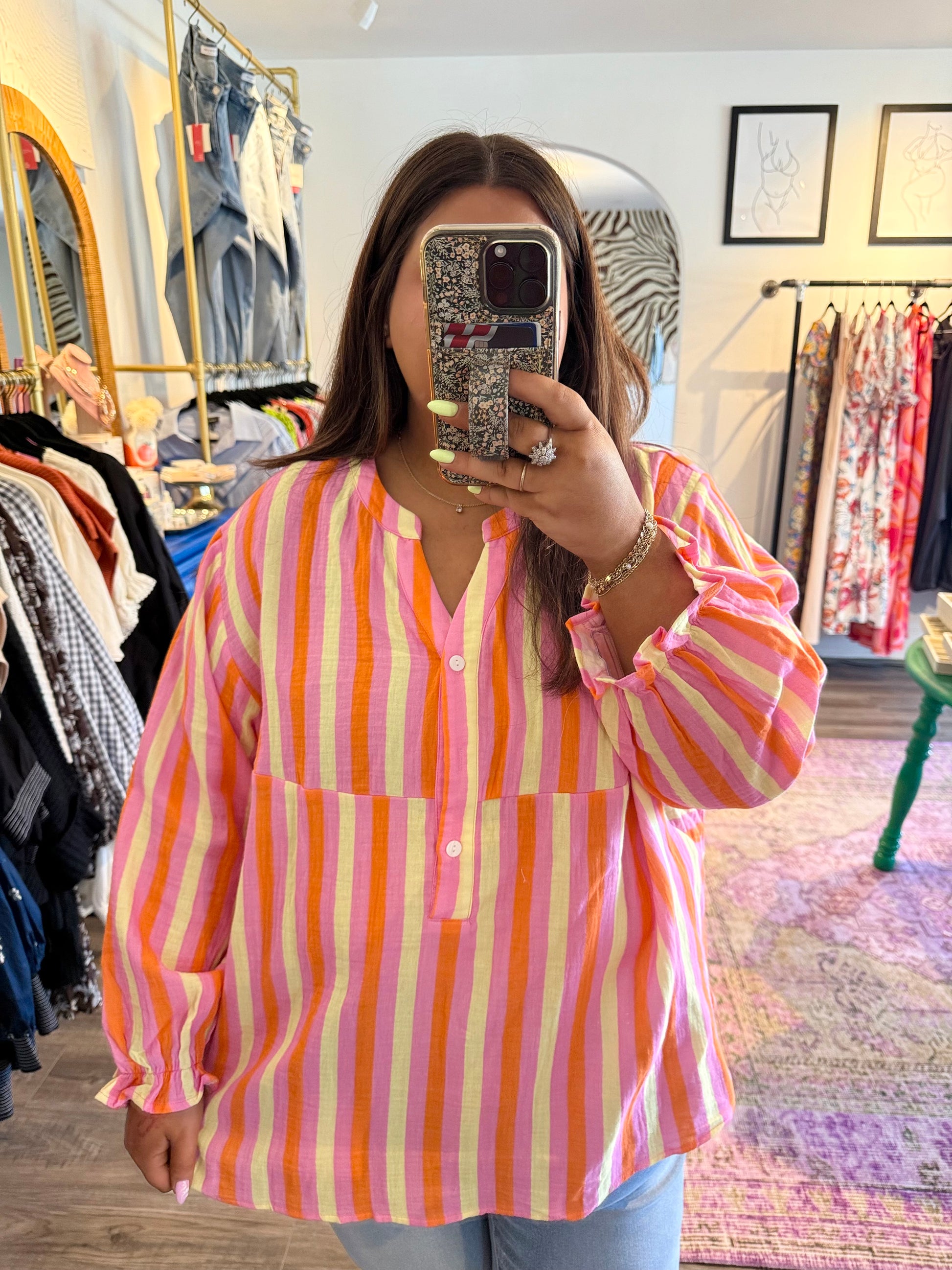 Add a splash of fun to your wardrobe with the Minnie Top. Featuring playful pink, yellow, and orange stripes, this gorgeous blouse has a flattering V-neckline with half buttons, perfect for dressing up or down. Its lightweight design makes it ideal for transitioning into fall, whether you're heading to work or out for play. Brighten your look and bring life to any outfit with this lively, versatile top.