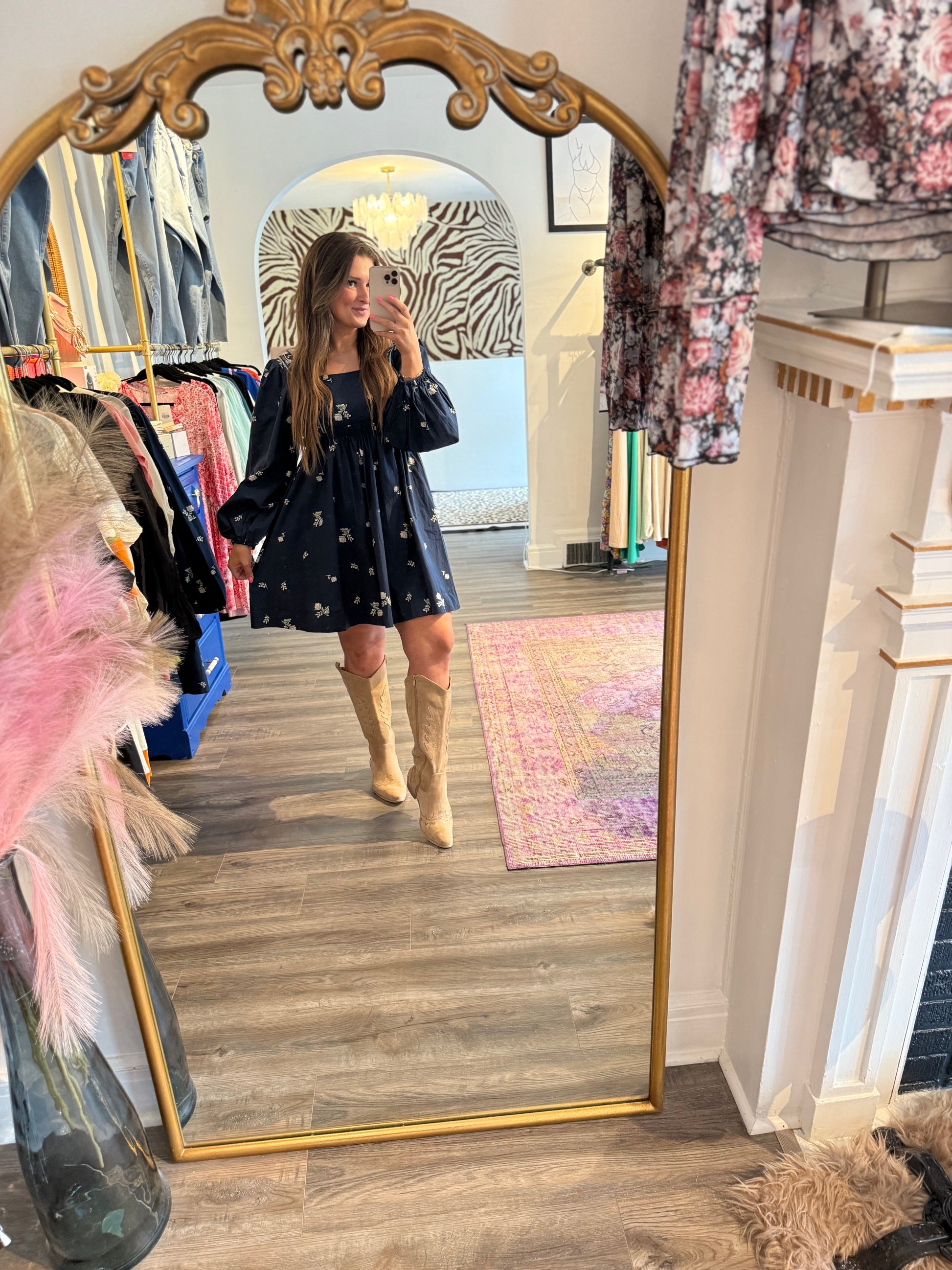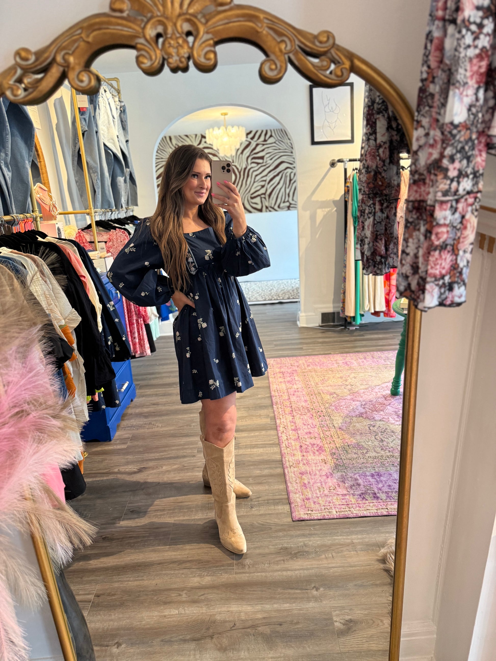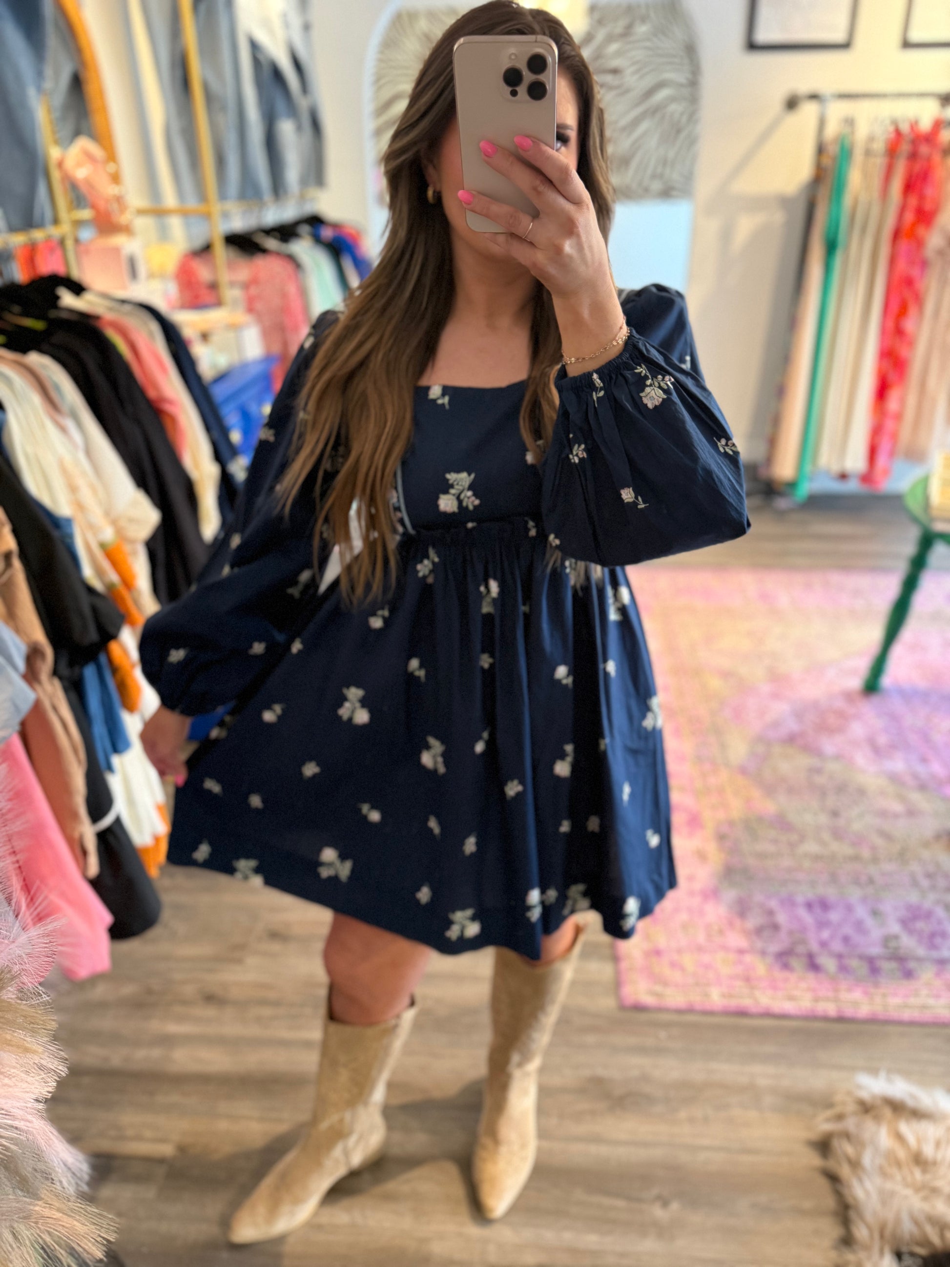 Step into autumn with the Montana Dress, a playful navy blue mini that blends floral charm with cozy style. Its square neckline and small puff sleeves add a flirty touch, while the long sleeves keep you comfy as the temperatures dip. Perfect for fall and those in-between days, this dress makes transitioning seasons effortlessly chic.