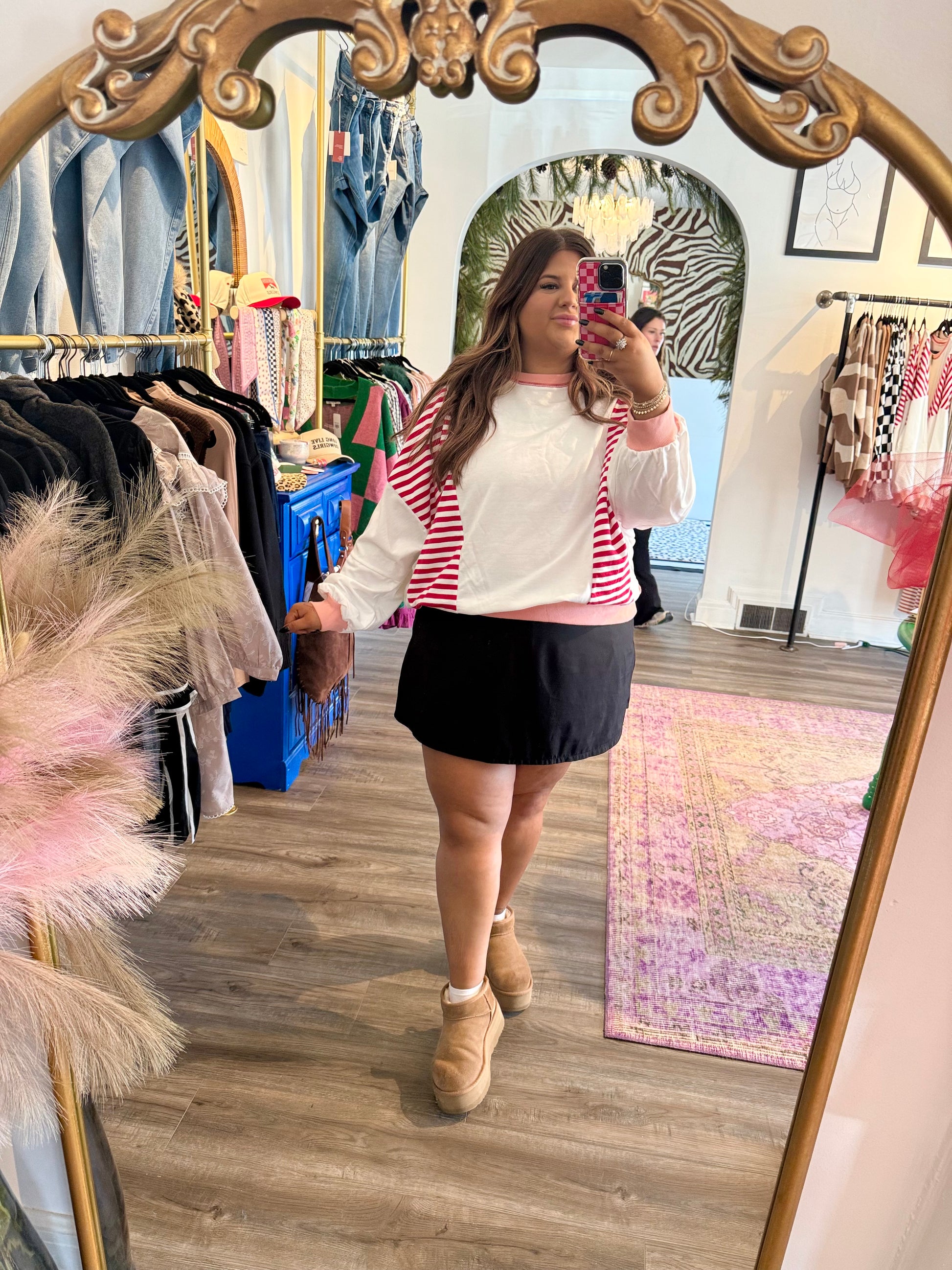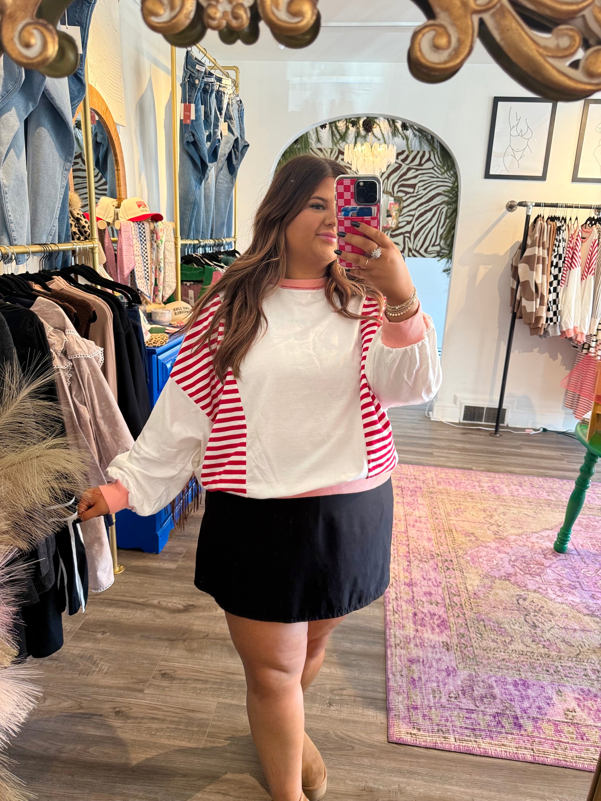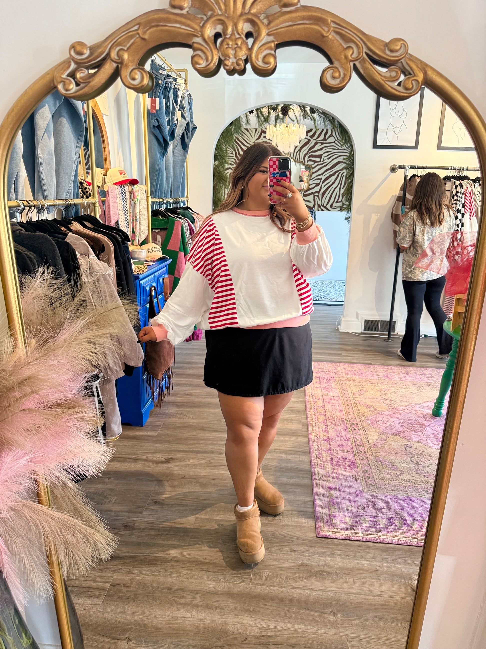 Wrap yourself in festive cheer with the Peppermint Topo, a playful pullover that brings holiday spirit to your everyday style. This charming top features a vibrant colorblock design with red and white stripes and patchwork details that capture the season's magic. Designed for comfort and ease, it's the perfect piece to layer through the holidays and beyond. Cozy, colorful, and undeniably fun—your new seasonal favorite awaits!