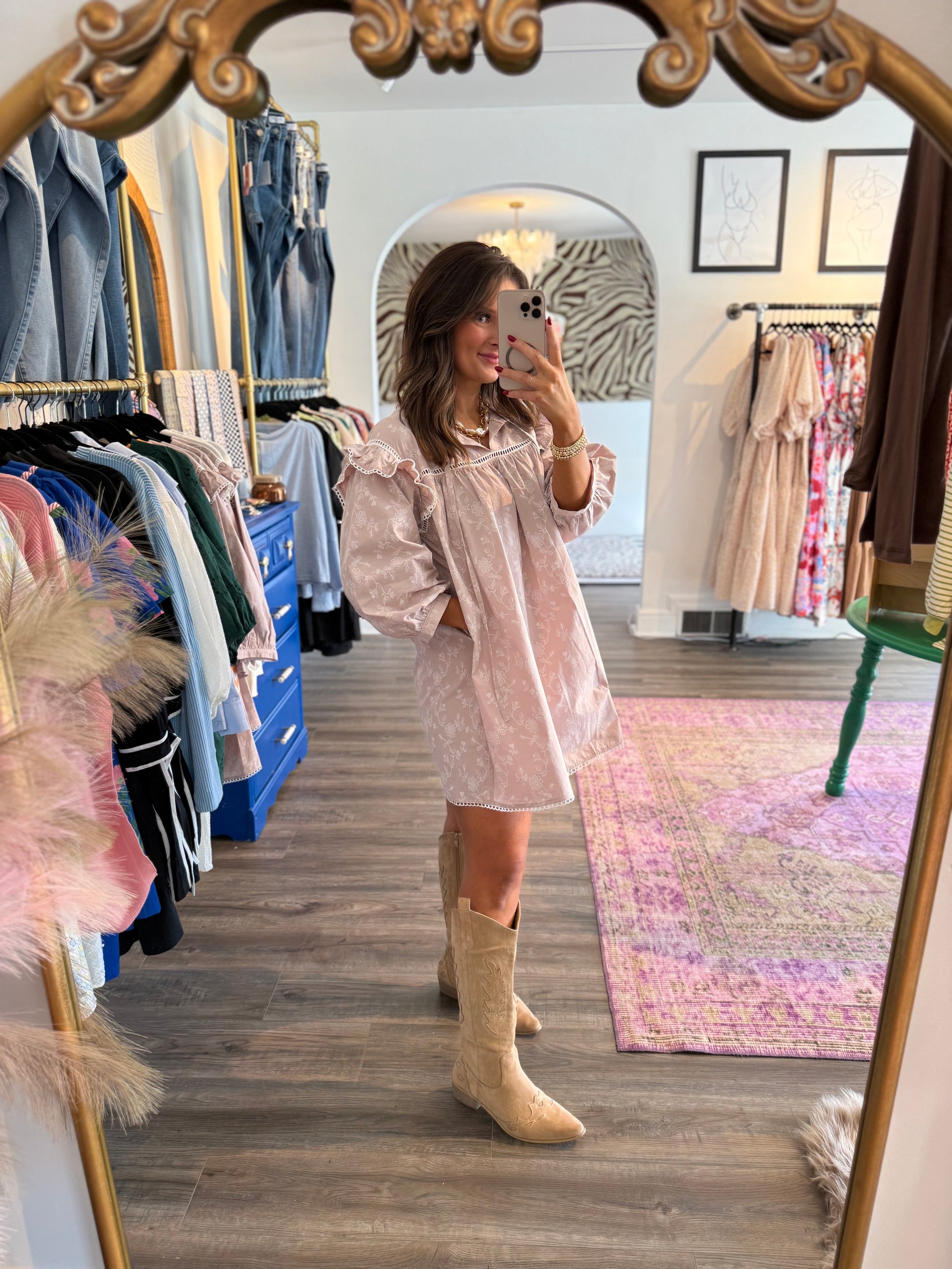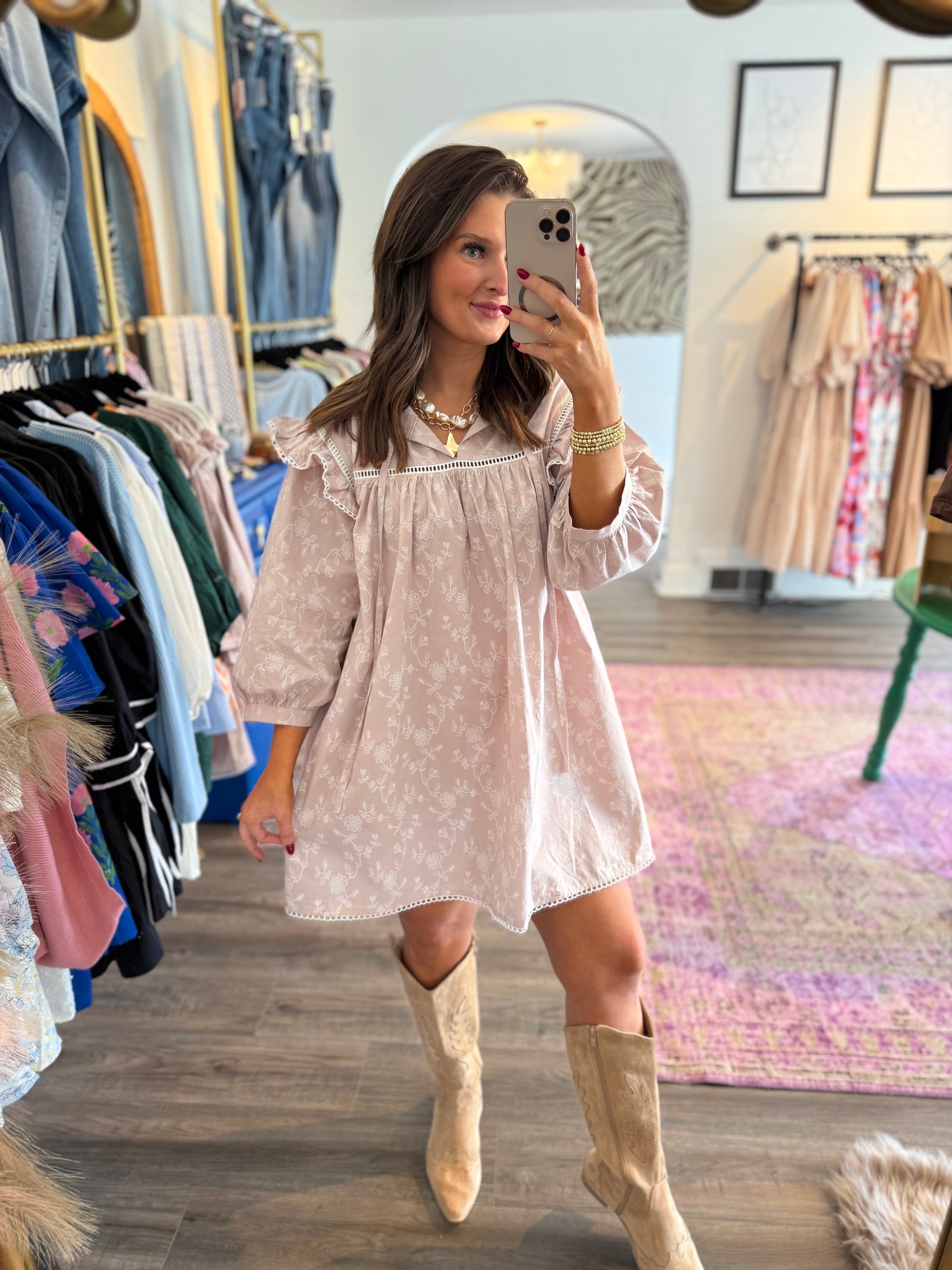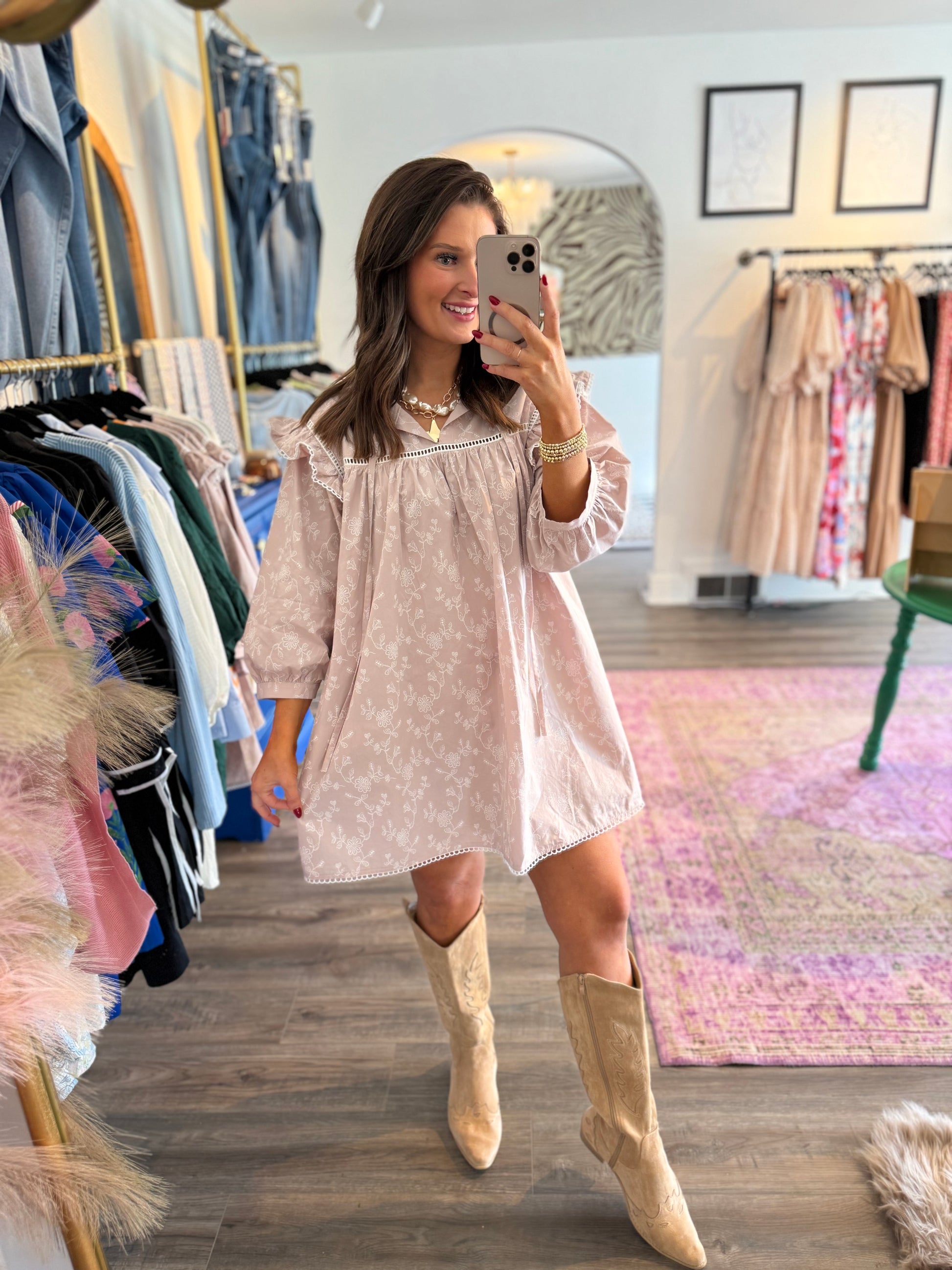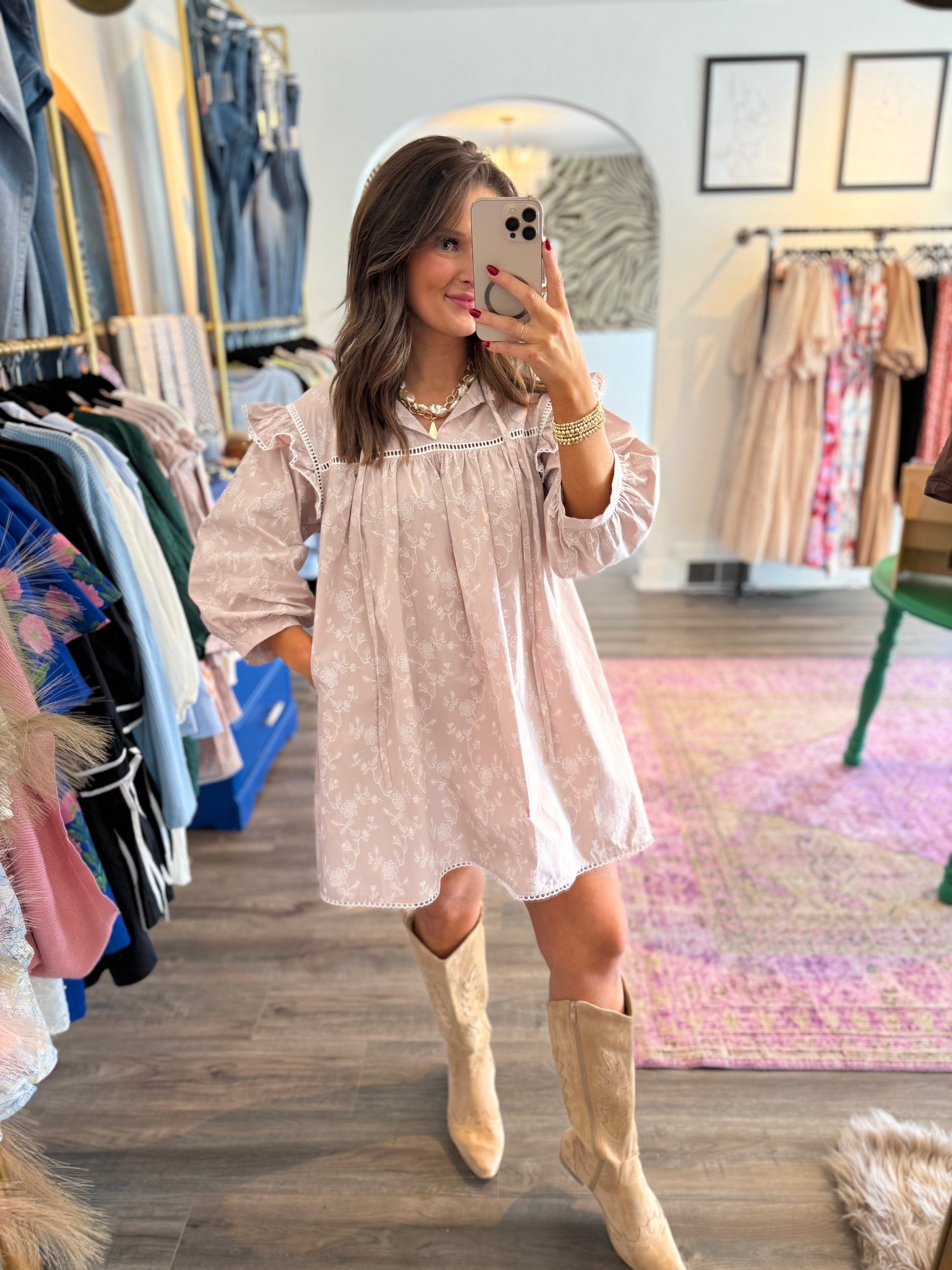 The Sandstone Dress combines comfort and sophistication in a playful silhouette. This beige short dress features long sleeves, cream and light blue floral details, and delicate lace trim. Ruffle accents along the shoulders add a flirty touch, while the tie neck offers charming versatility. Perfect for pairing with your favorite boots, it’s an easy choice for effortlessly stylish days.