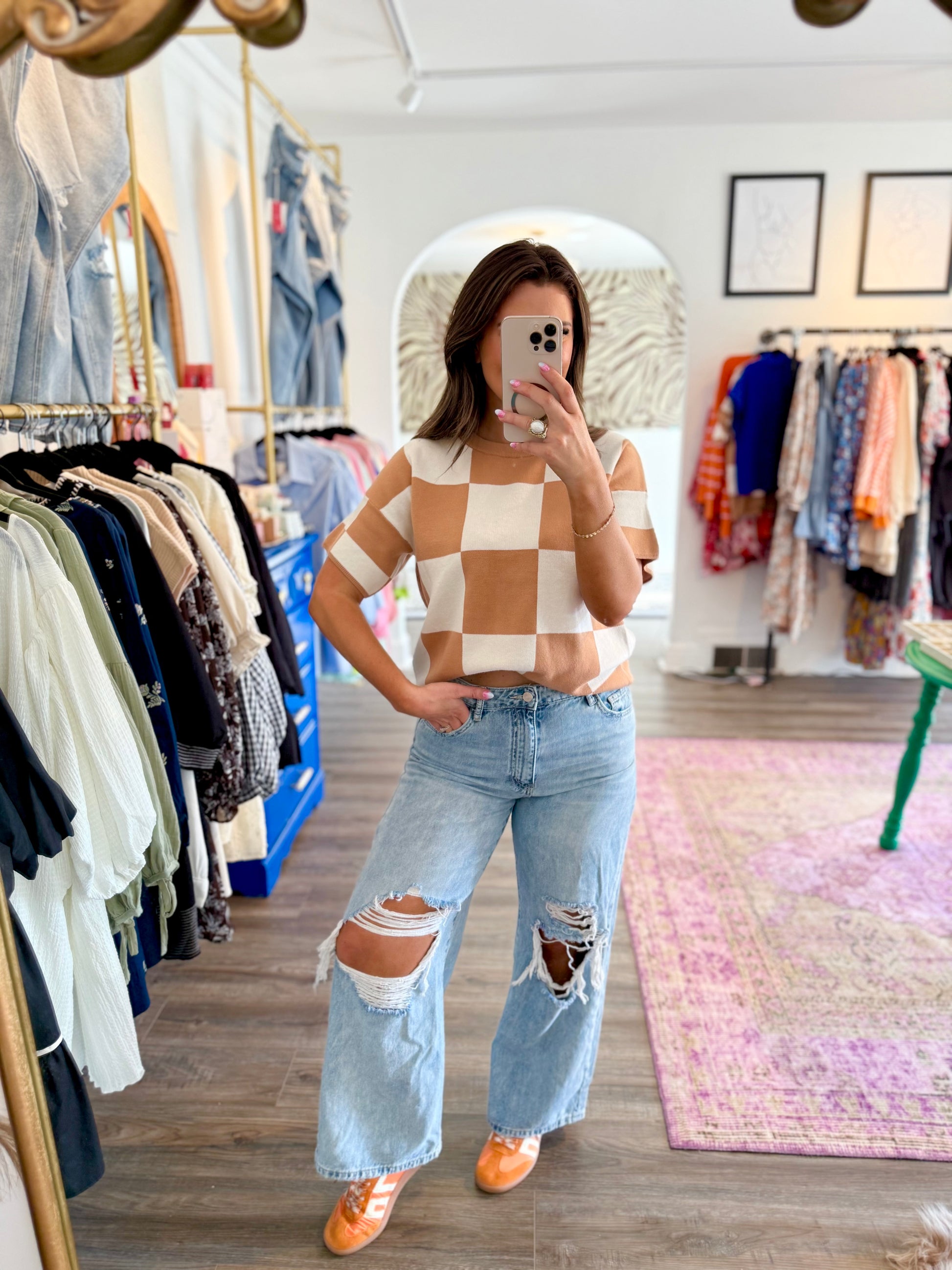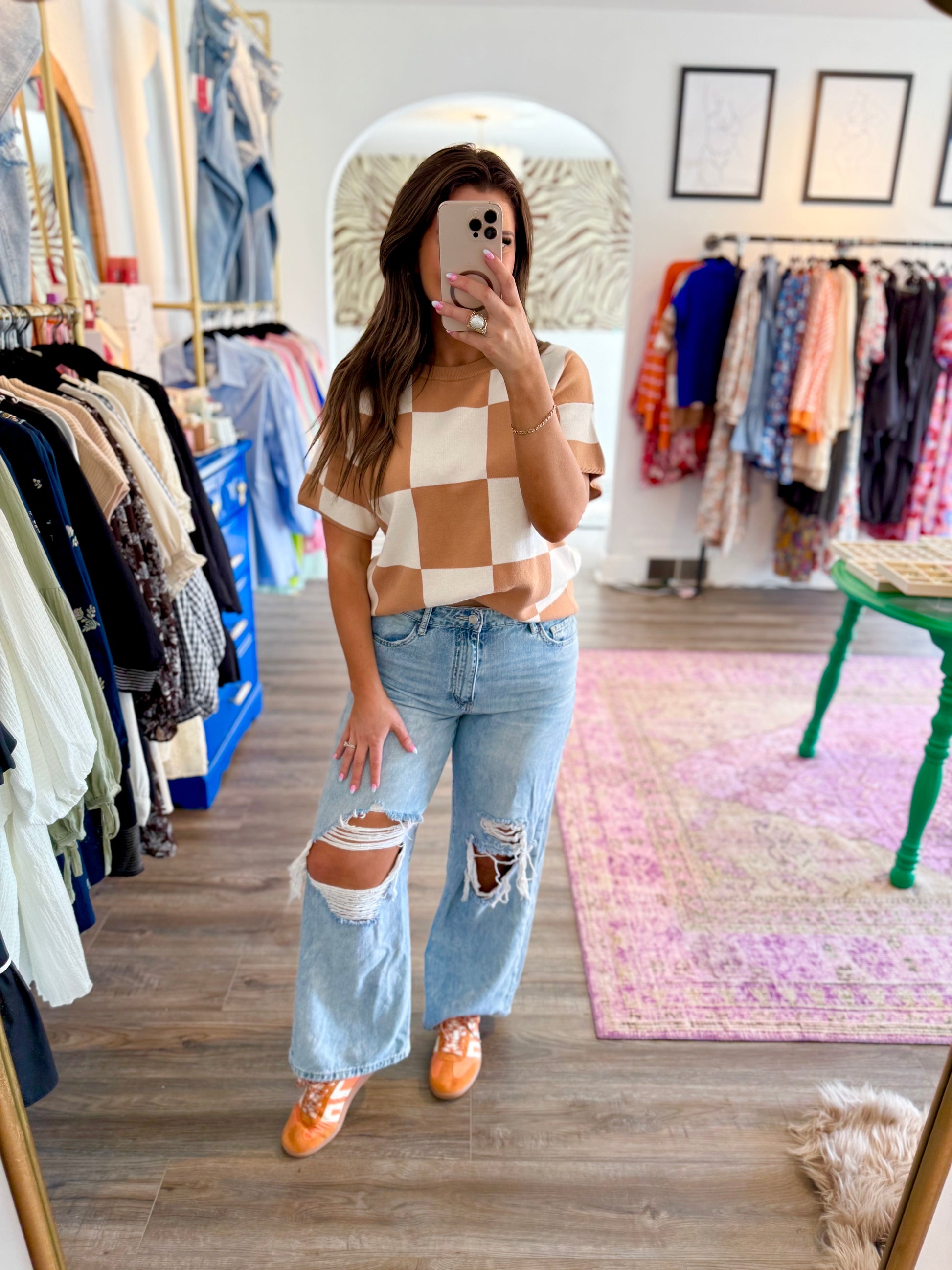 Stay cozy and stylish in the Spice Girl Sweater, featuring a playful beige and white large checkered print. Its cap sleeves and loose fit with drop shoulders create a relaxed vibe perfect for layering. Pair it effortlessly with leggings or denim for an easygoing look that’s both comfy and chic.