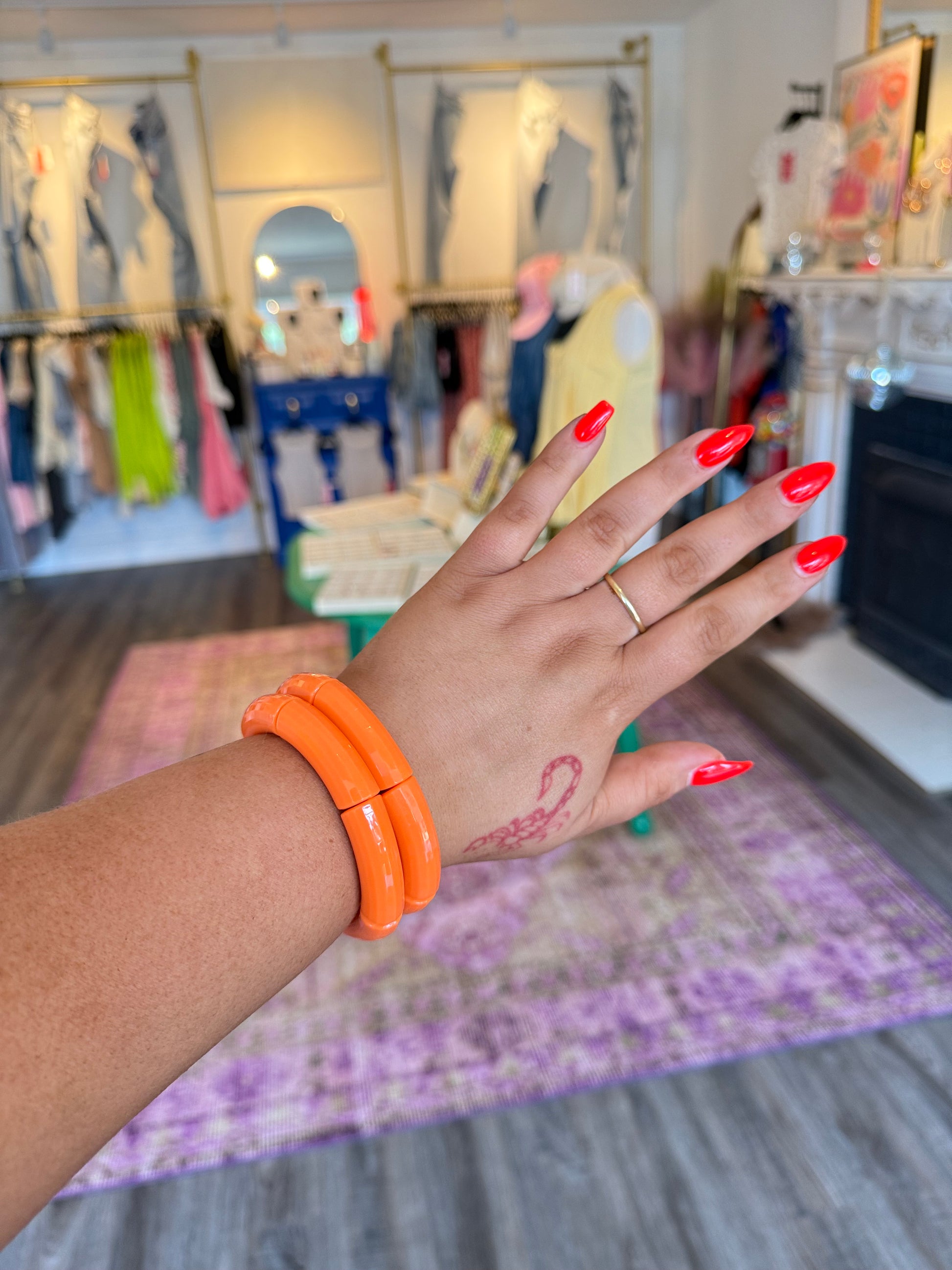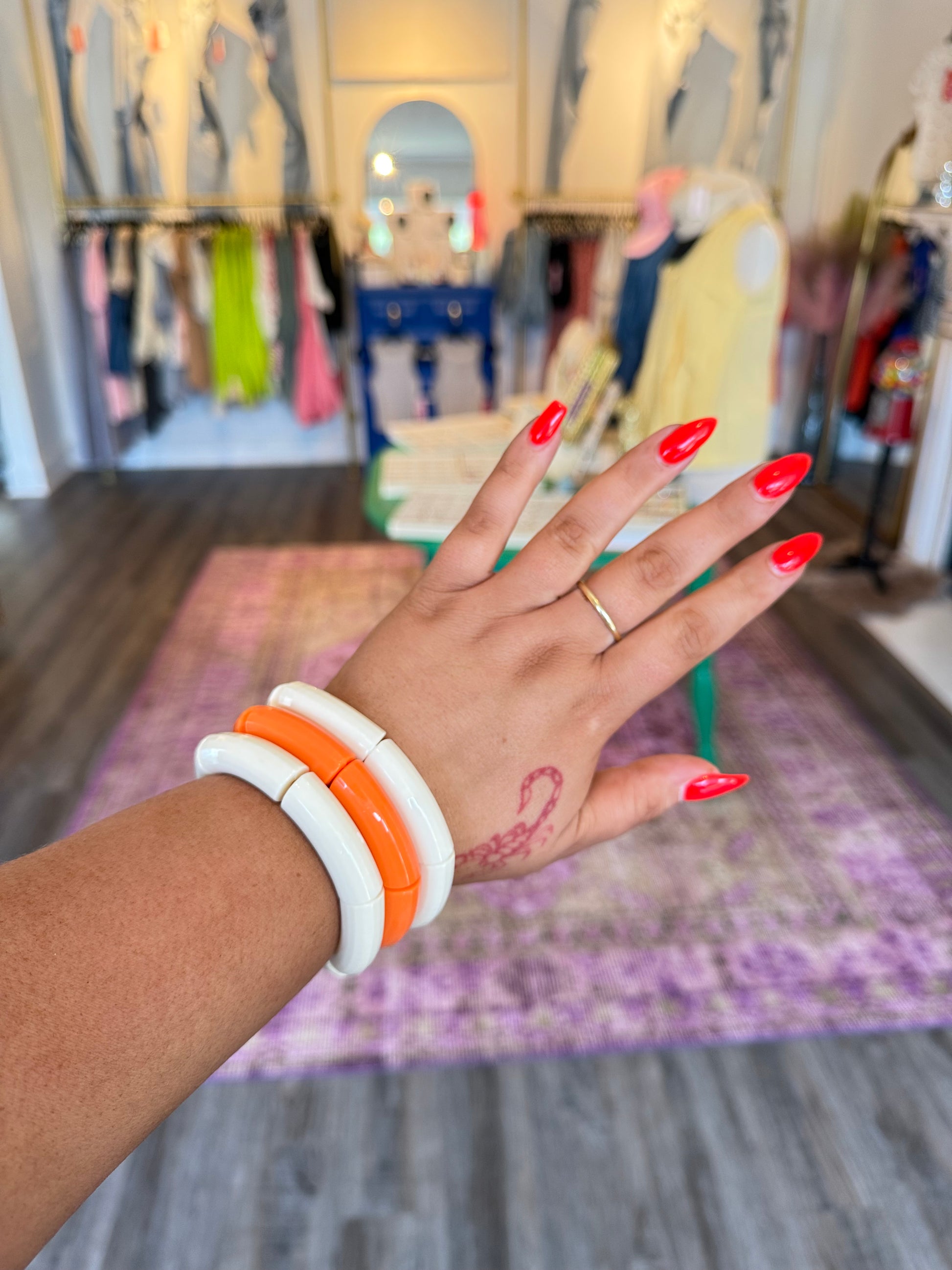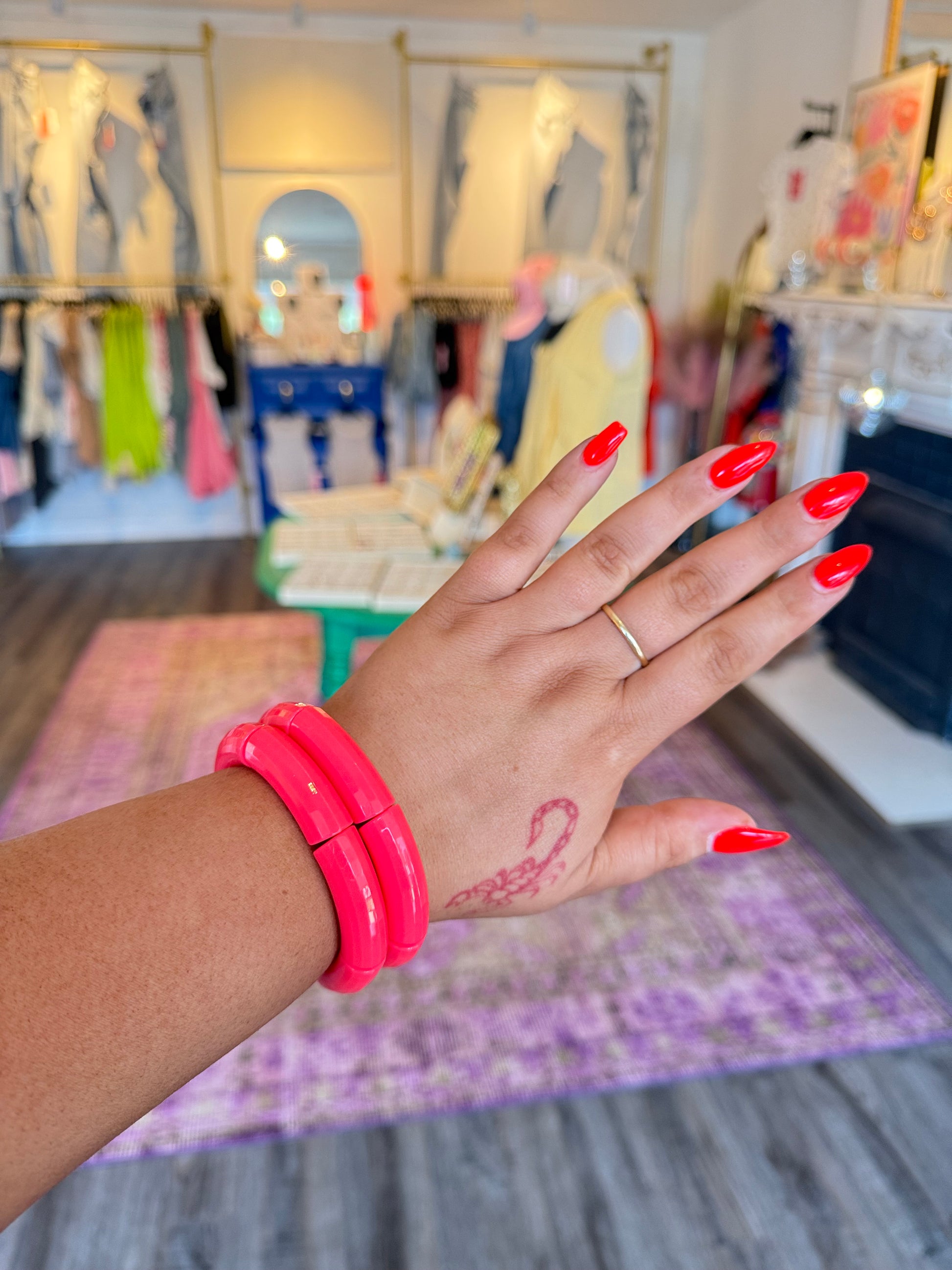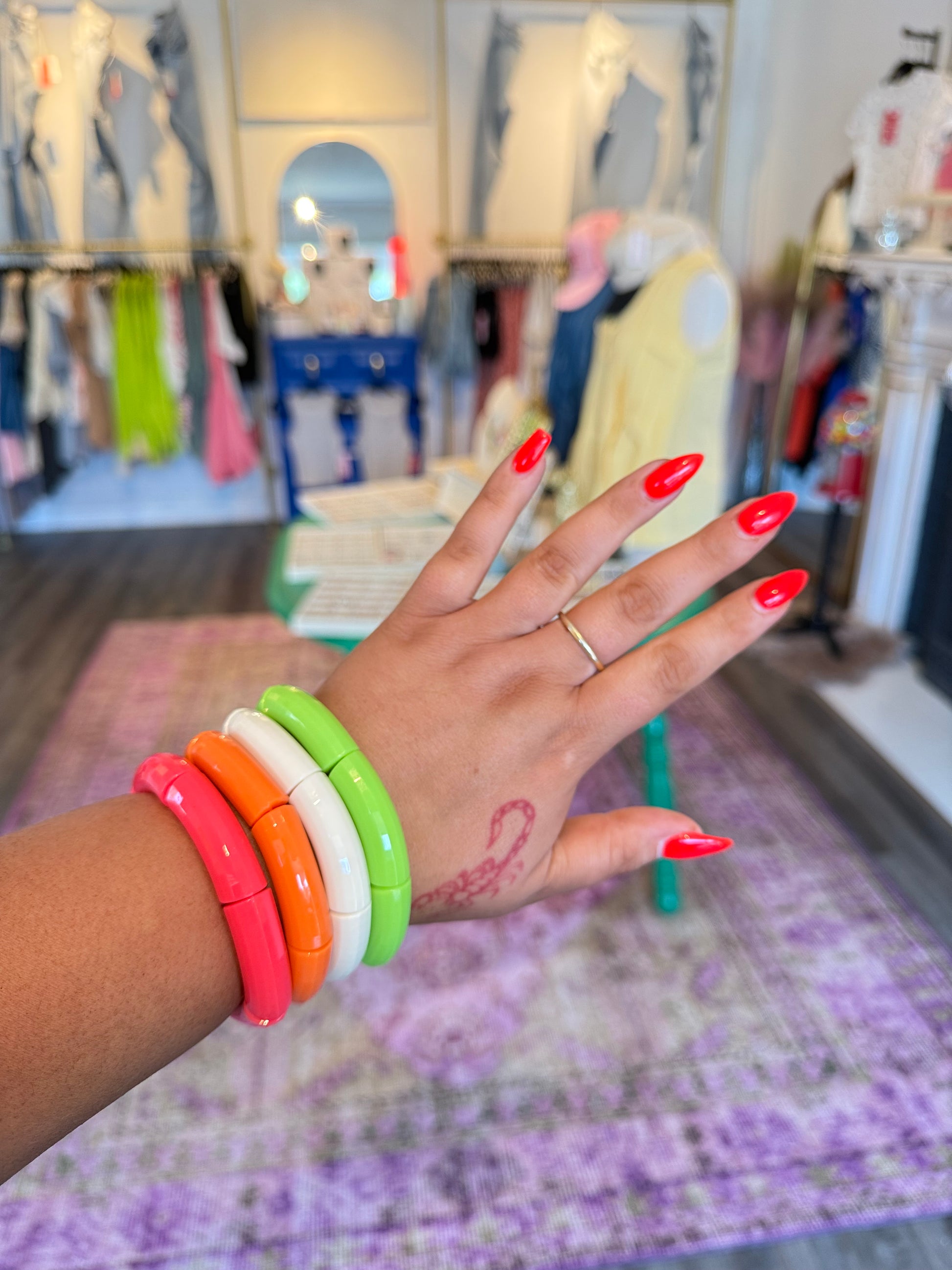 These tube bracelets are perfect to spice up your outfit or even a bathing suit beach look! Bracelets are handmade and strung on strong stretch cord and include 6 acrylic beads, which should fit standard length and one size fits most. They come in the most fun colors!