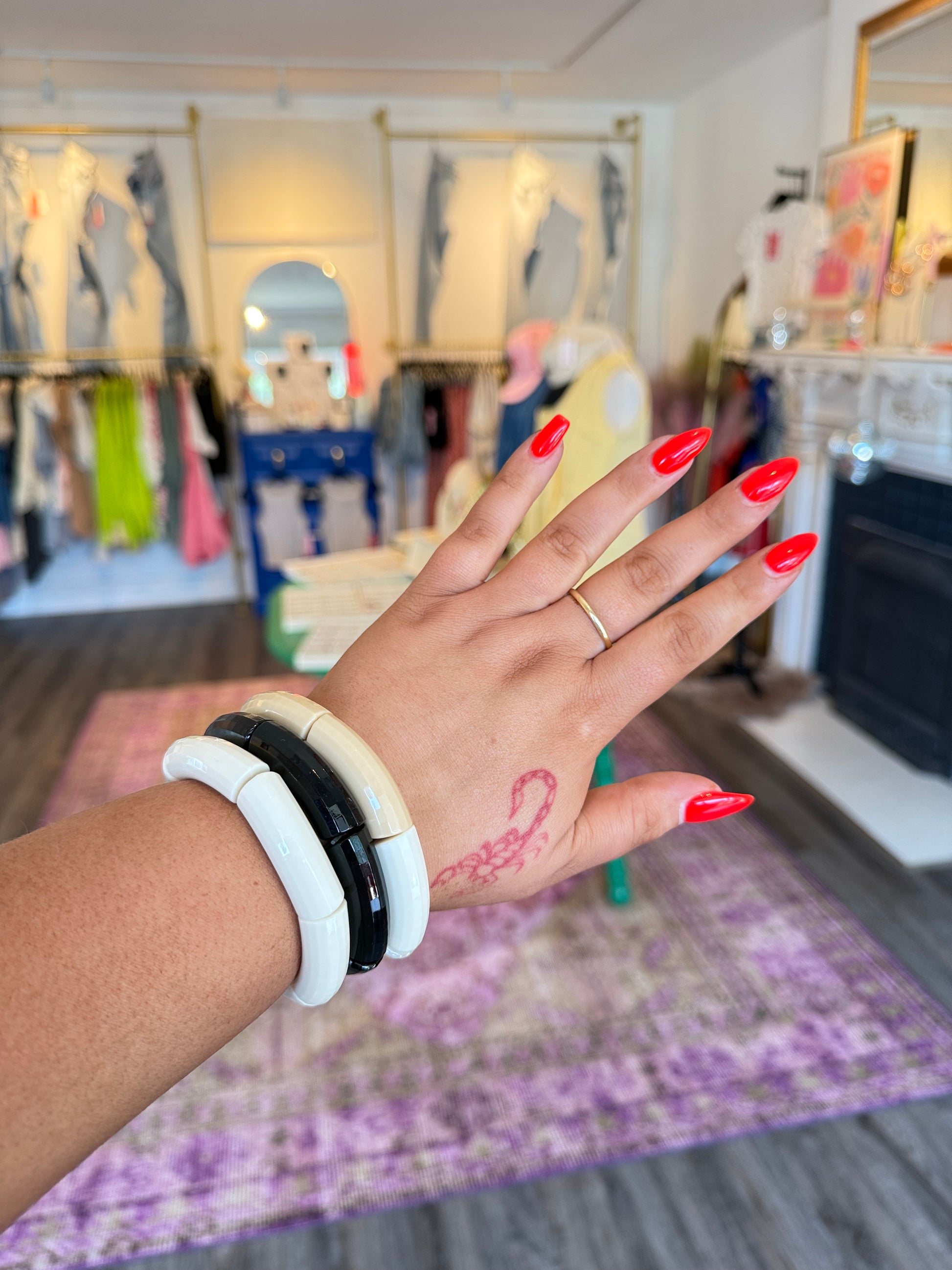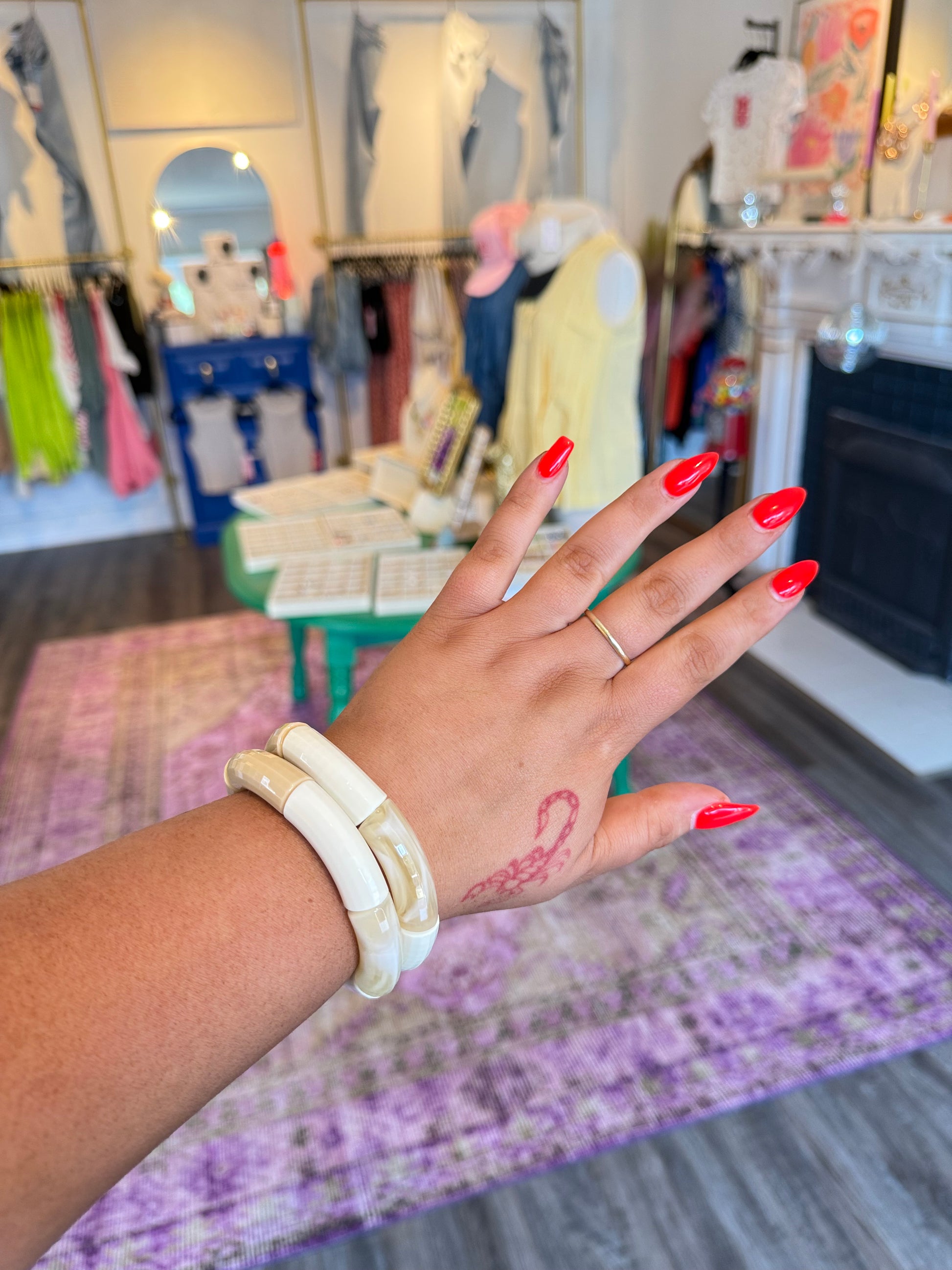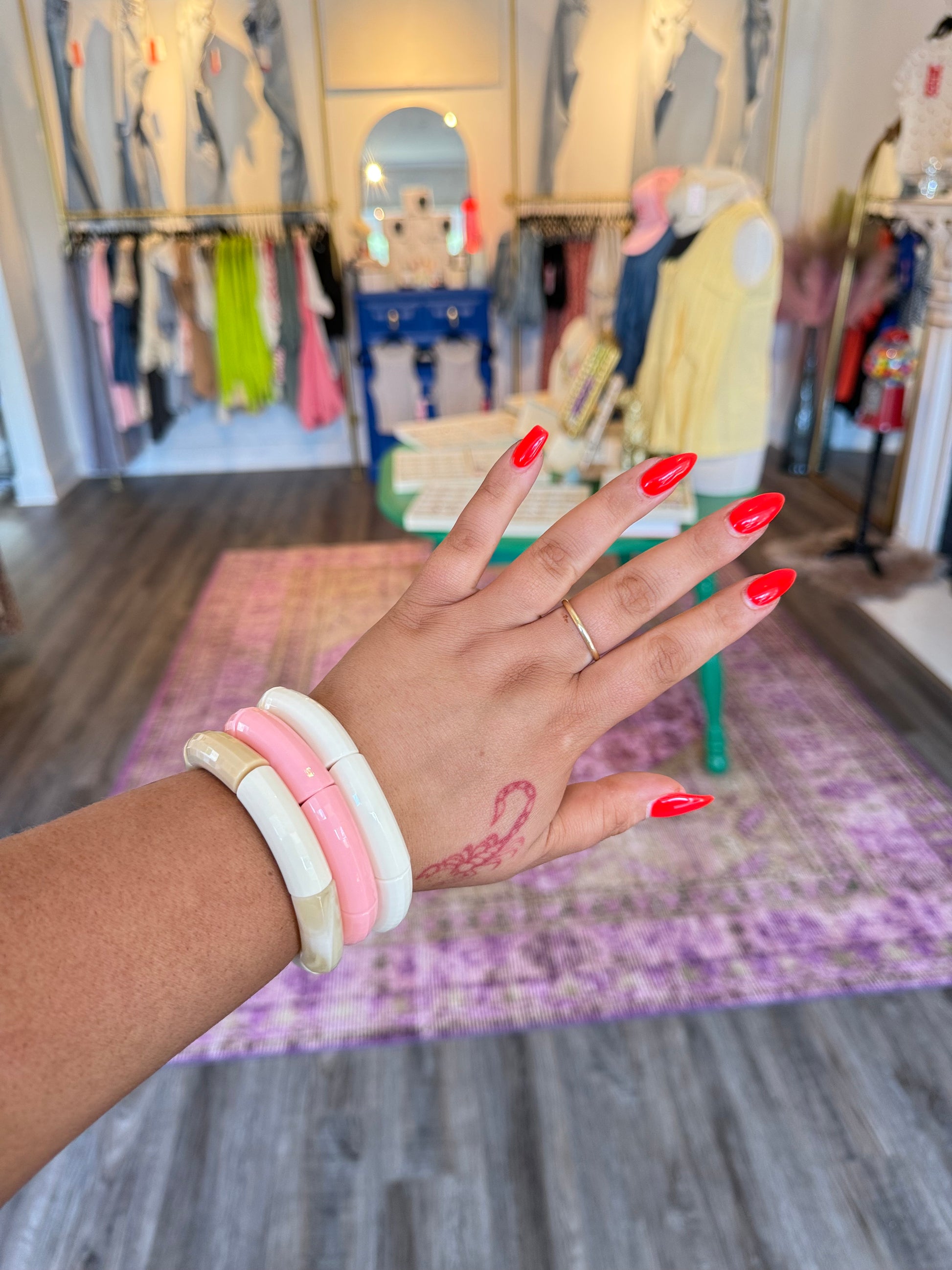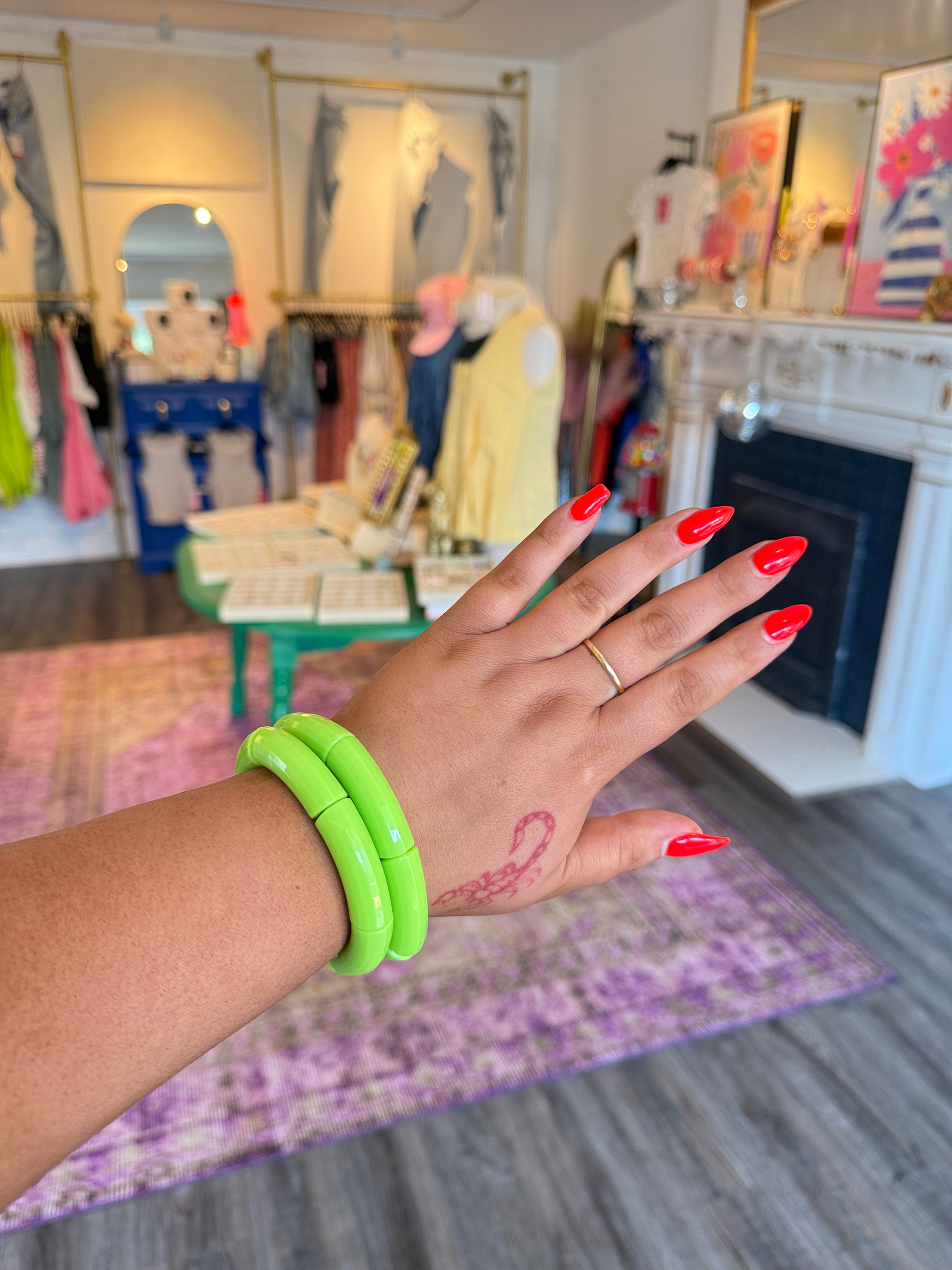 These tube bracelets are perfect to spice up your outfit or even a bathing suit beach look! Bracelets are handmade and strung on strong stretch cord and include 6 acrylic beads, which should fit standard length and one size fits most. They come in the most fun colors!