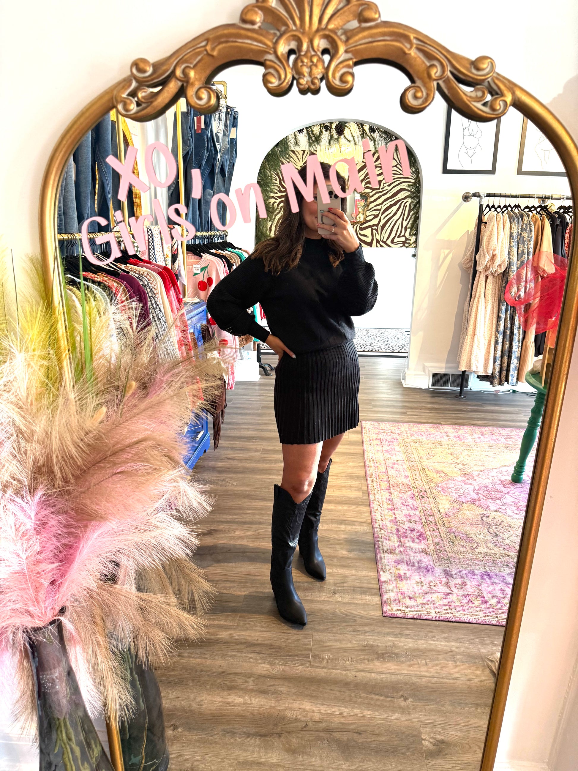 Meet your new go-to set! This cozy sweater and pleated skirt combo is the definition of versatile—dress it up for a night out or keep it casual for everyday wear. The soft sweater features a chic high neck and delicate puff sleeves, while the pleated skirt boasts a stretchy waistband for all-day comfort. Layer with tights and boots when the weather turns chilly, and you've got an effortlessly gorgeous look that works everywhere. Trust us, this one's flying off the shelves!