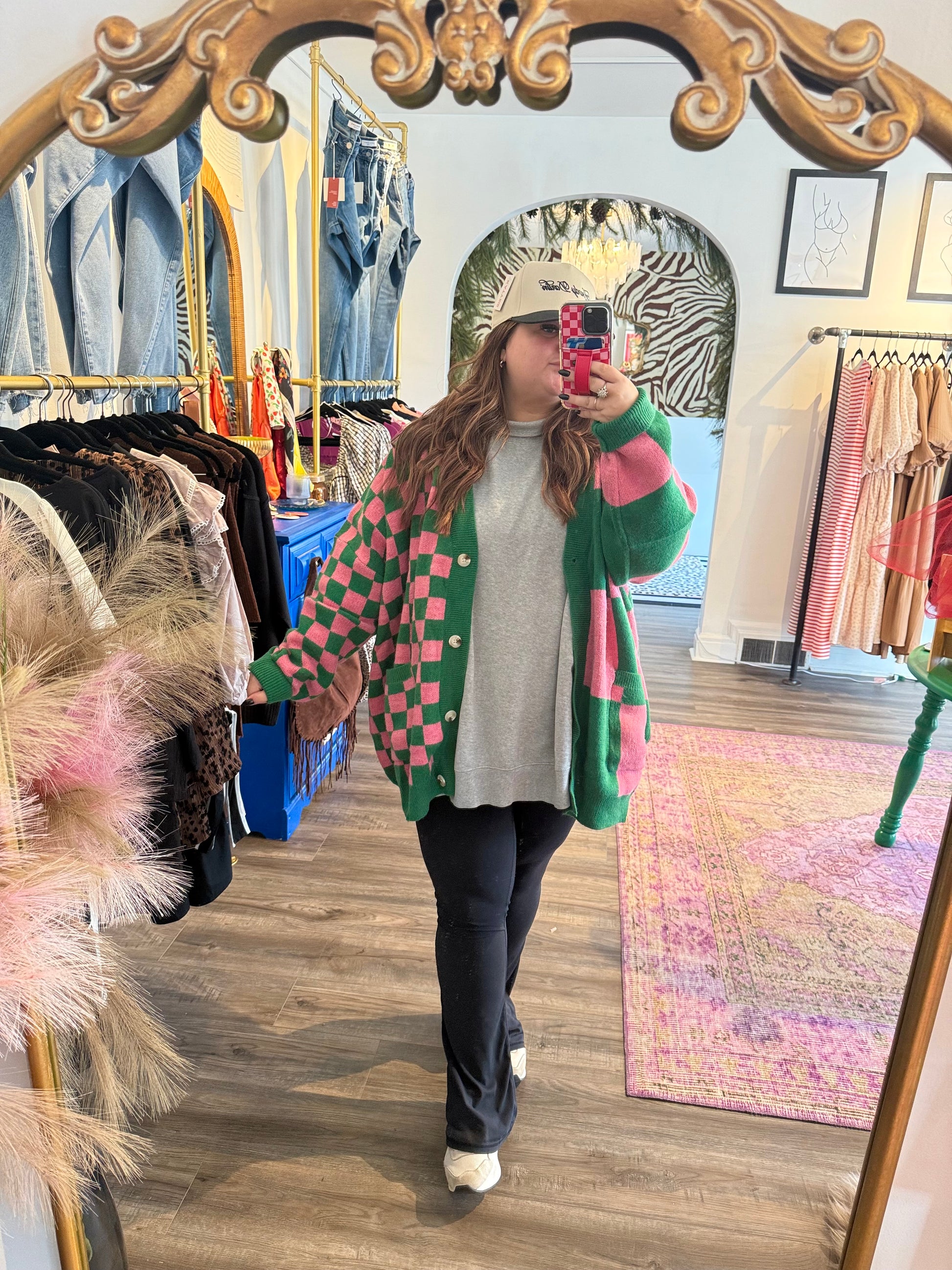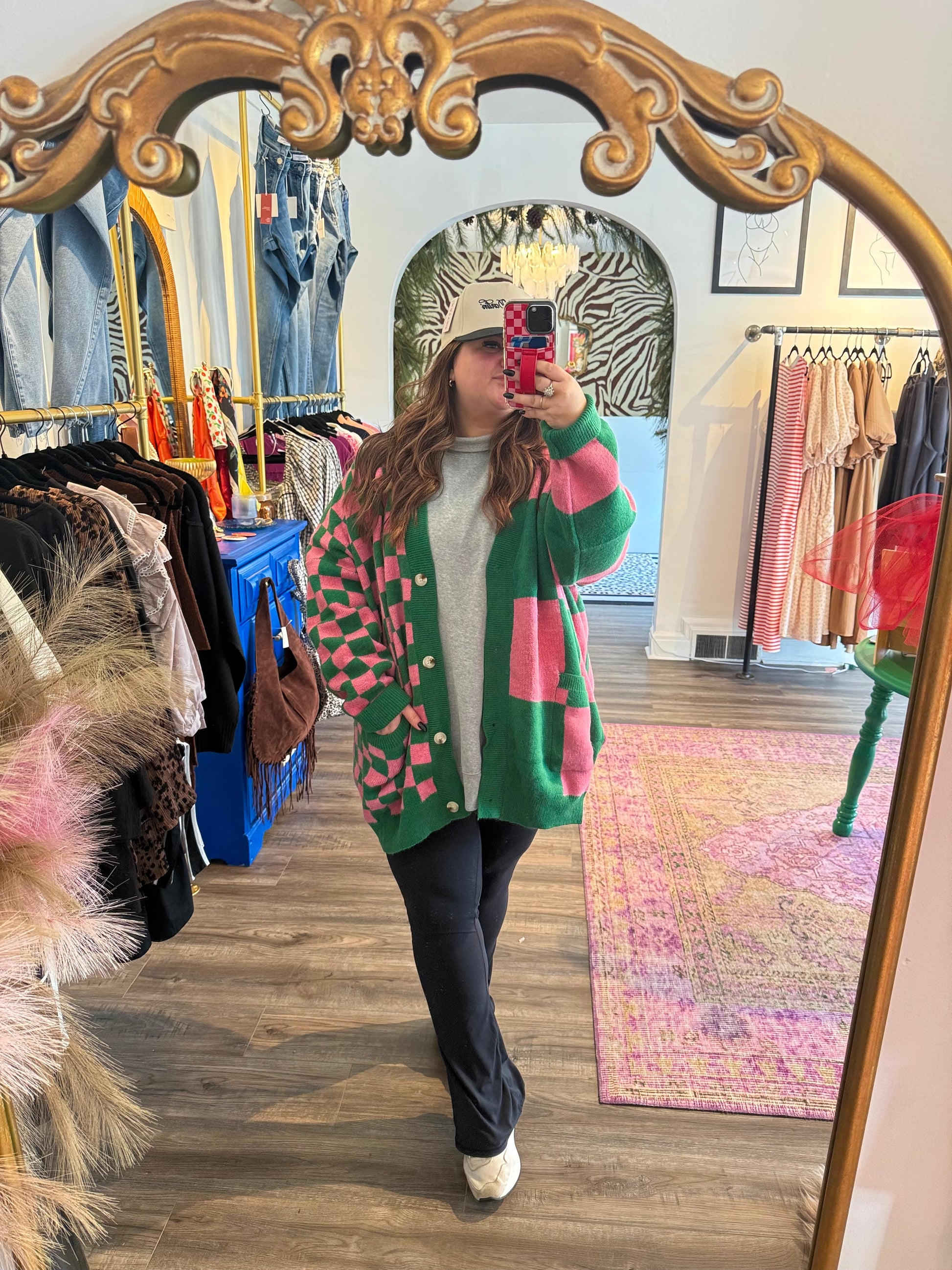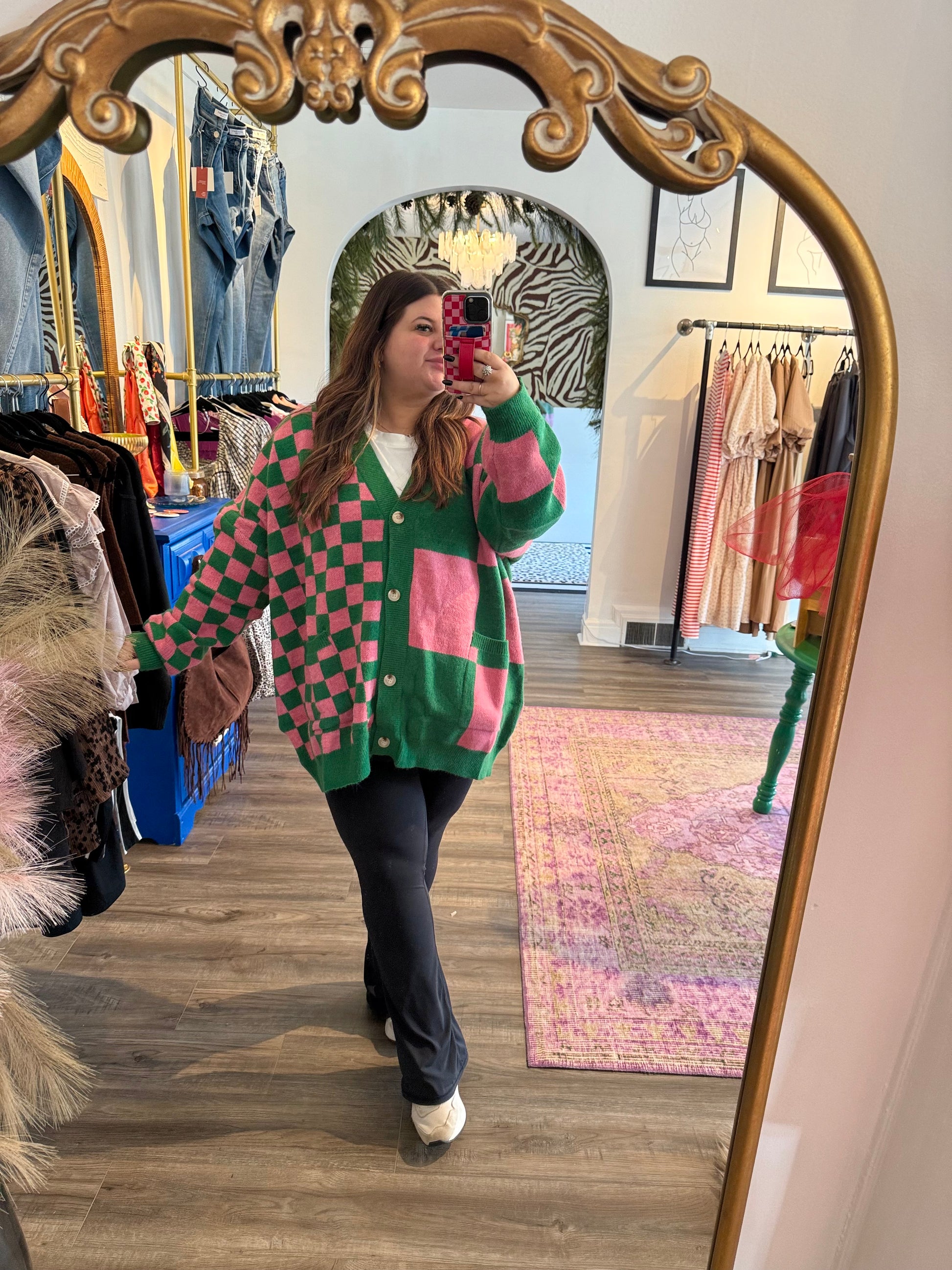 1X/2X (fits up to a larger 3x) - The Indy Cardigan is finally here, and it's a game-changer for your wardrobe. This green and pink checkered stunner brings maximalist energy with a fun, flirty vibe that's impossible to ignore. Crafted from soft, comfortable fabric, it's the ultimate closet staple that pairs with everything—dress it up or down, layer it endlessly, and watch it become your go-to piece. Trendy, versatile, and oh-so-good, this one's flying off the shelves fast. Don't miss out!