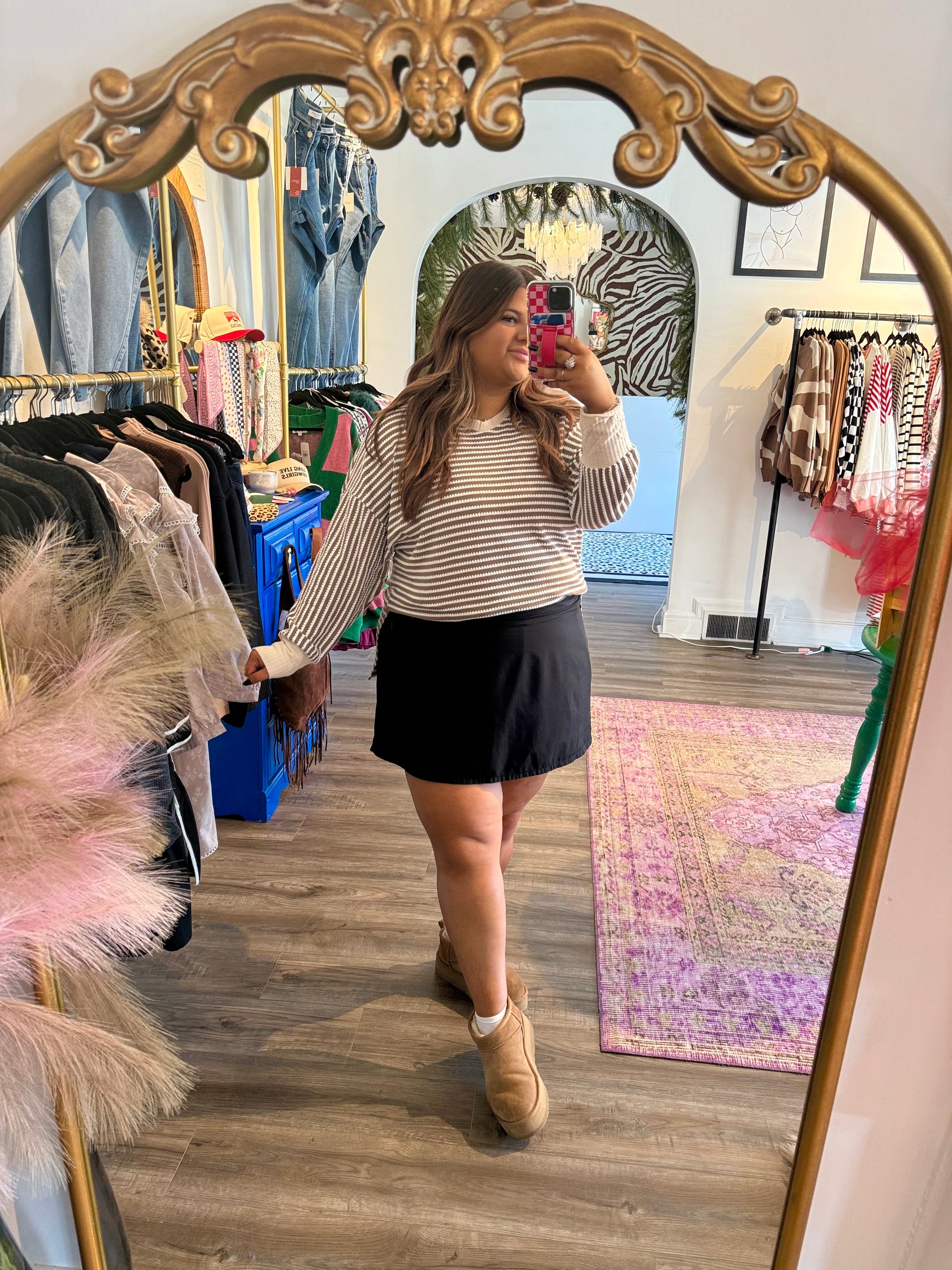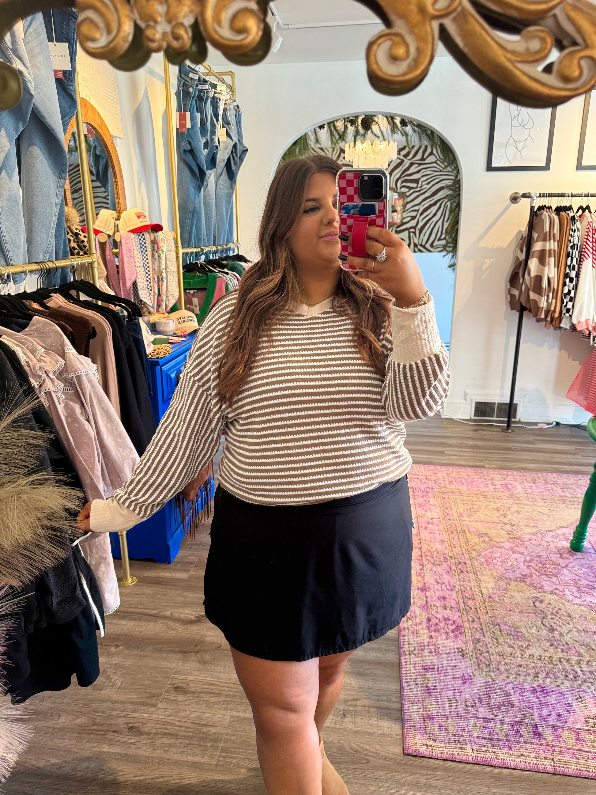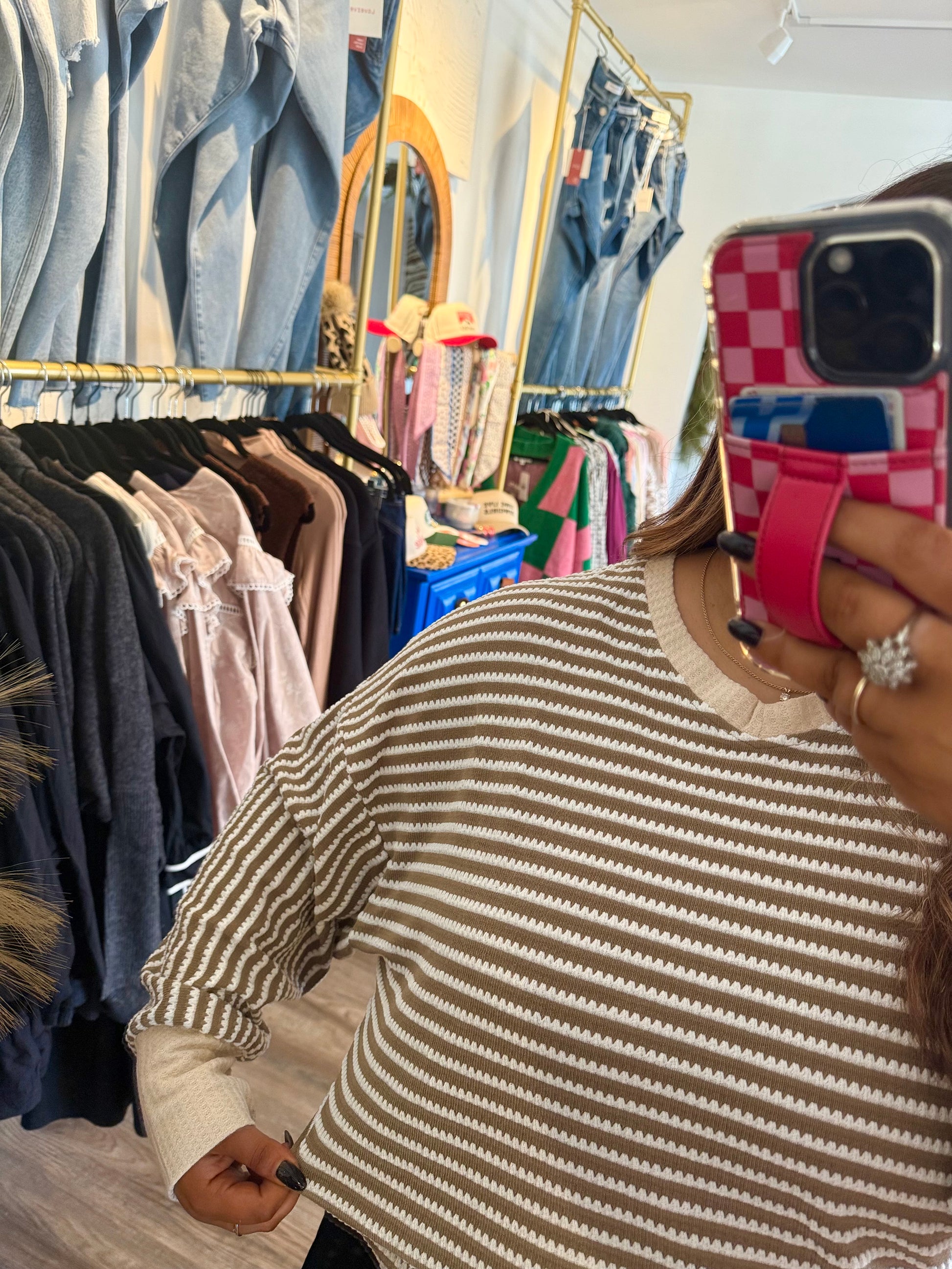 Meet your new wardrobe MVP! This Warm Latte Top features a charming khaki and cream stripe that pairs effortlessly with leggings, denim, or anything in between. Lightweight and flattering, it's designed to move with you throughout your day. A subtle side slit adds just the right amount of ease and style. Comfortable enough for everyday wear, versatile enough for endless outfit combinations—this is the closet essential you didn't know you needed!