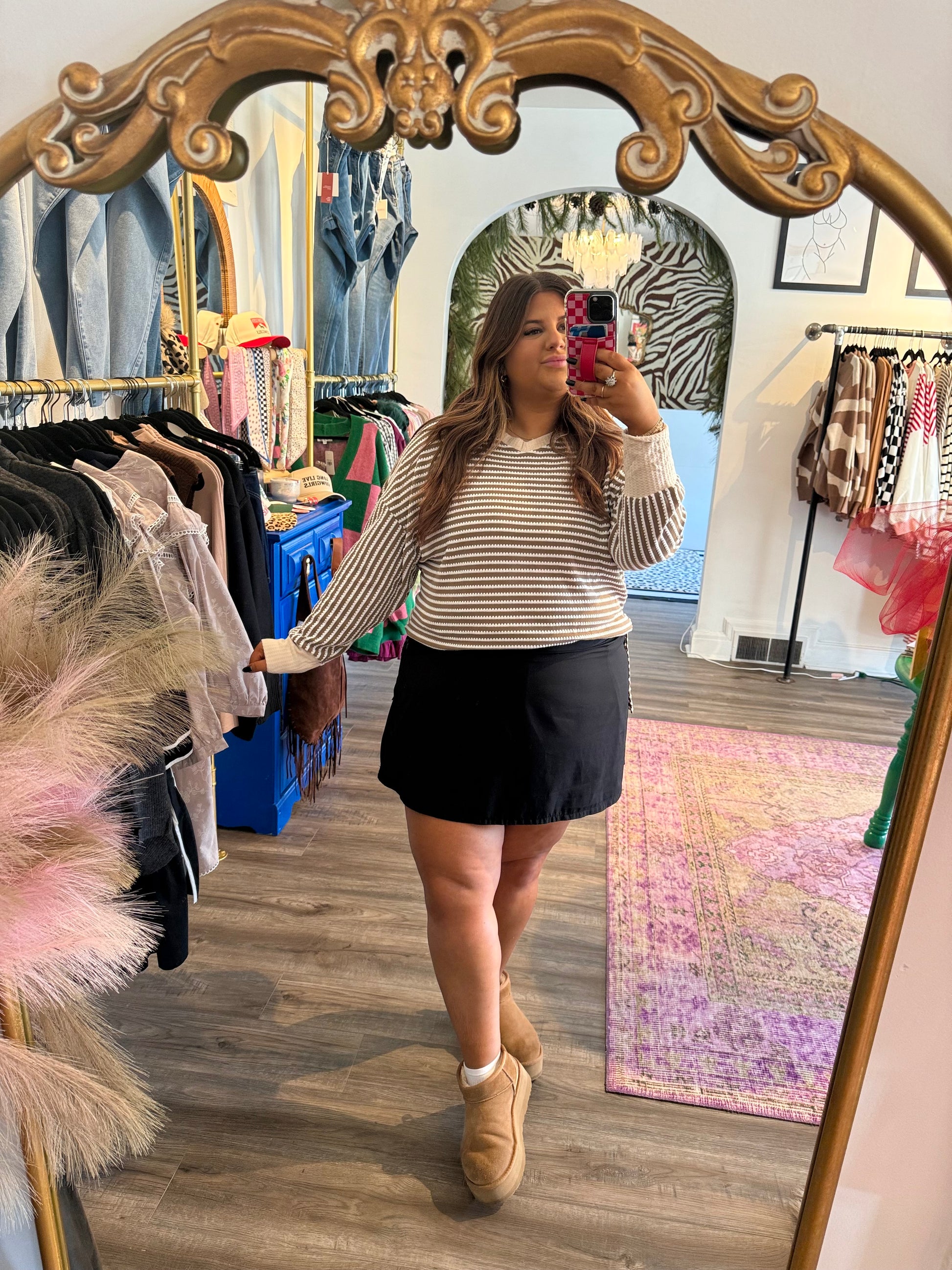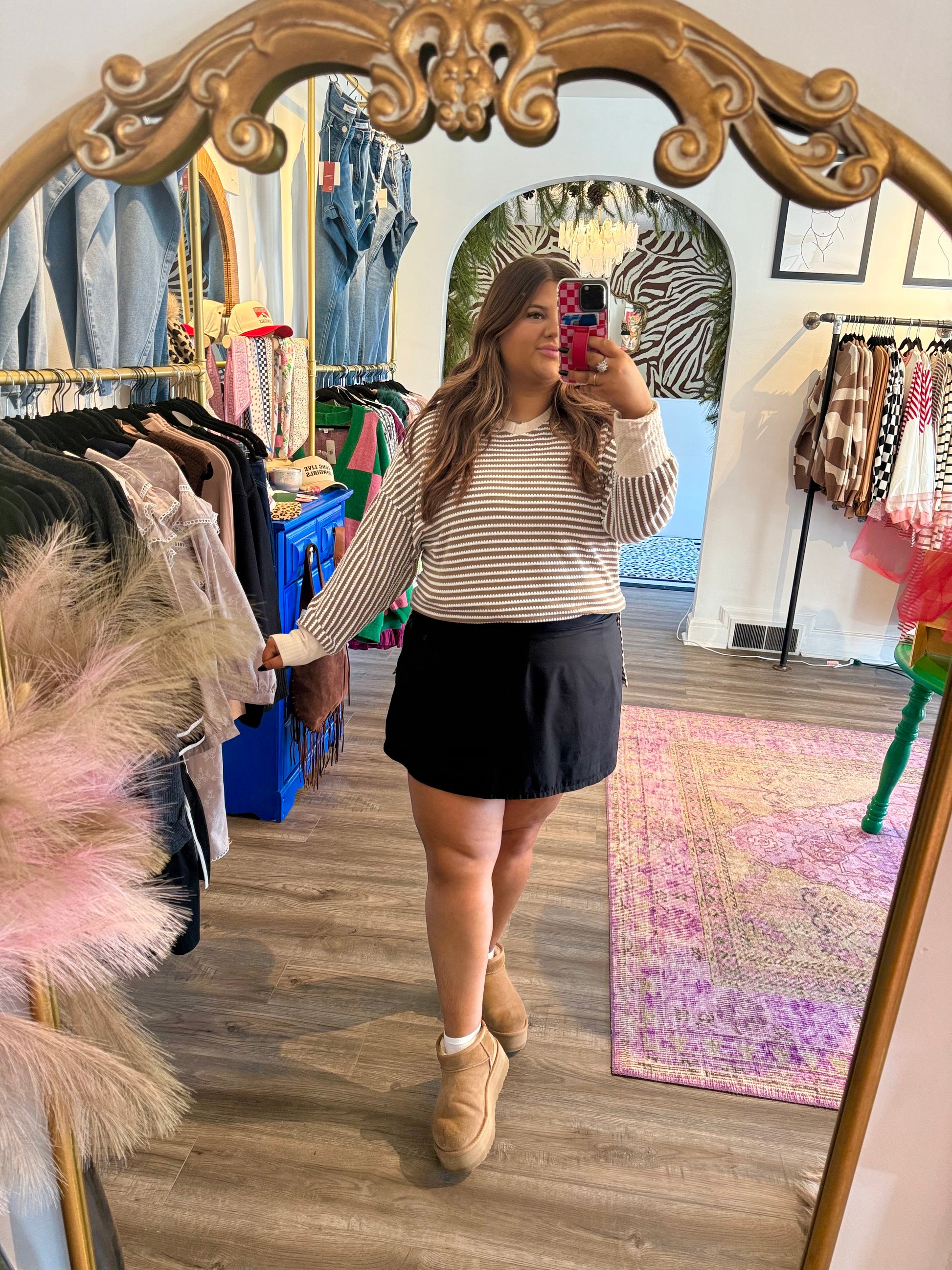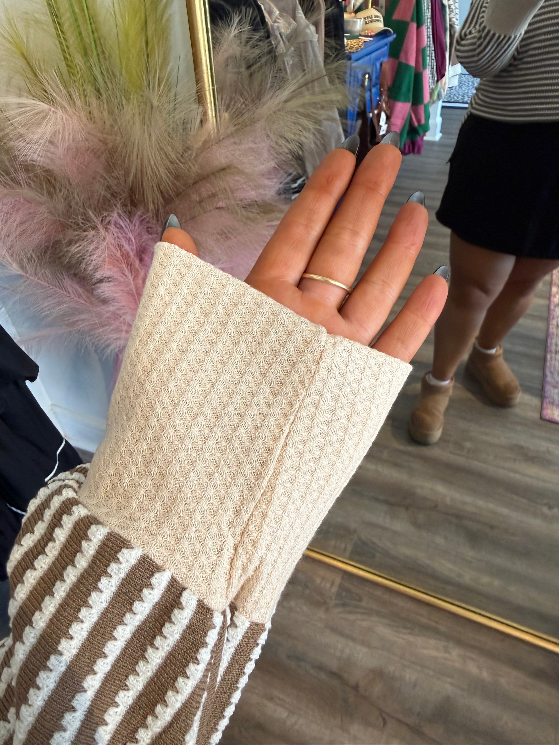Meet your new wardrobe MVP! This Warm Latte Top features a charming khaki and cream stripe that pairs effortlessly with leggings, denim, or anything in between. Lightweight and flattering, it's designed to move with you throughout your day. A subtle side slit adds just the right amount of ease and style. Comfortable enough for everyday wear, versatile enough for endless outfit combinations—this is the closet essential you didn't know you needed!